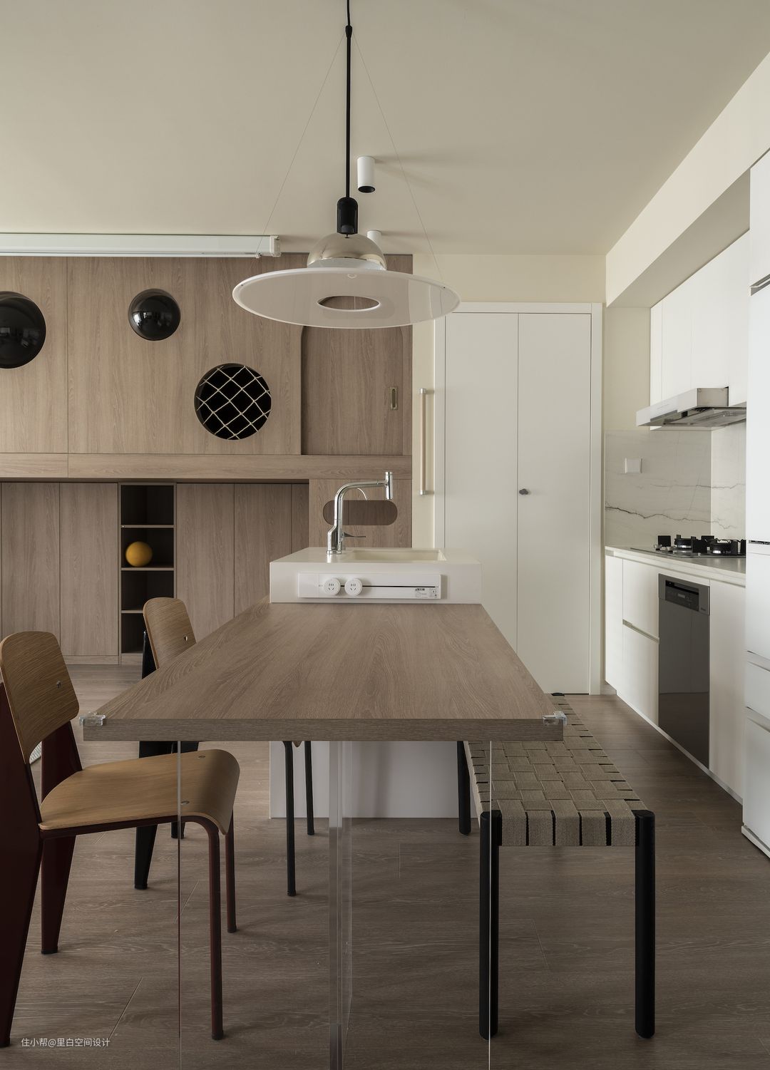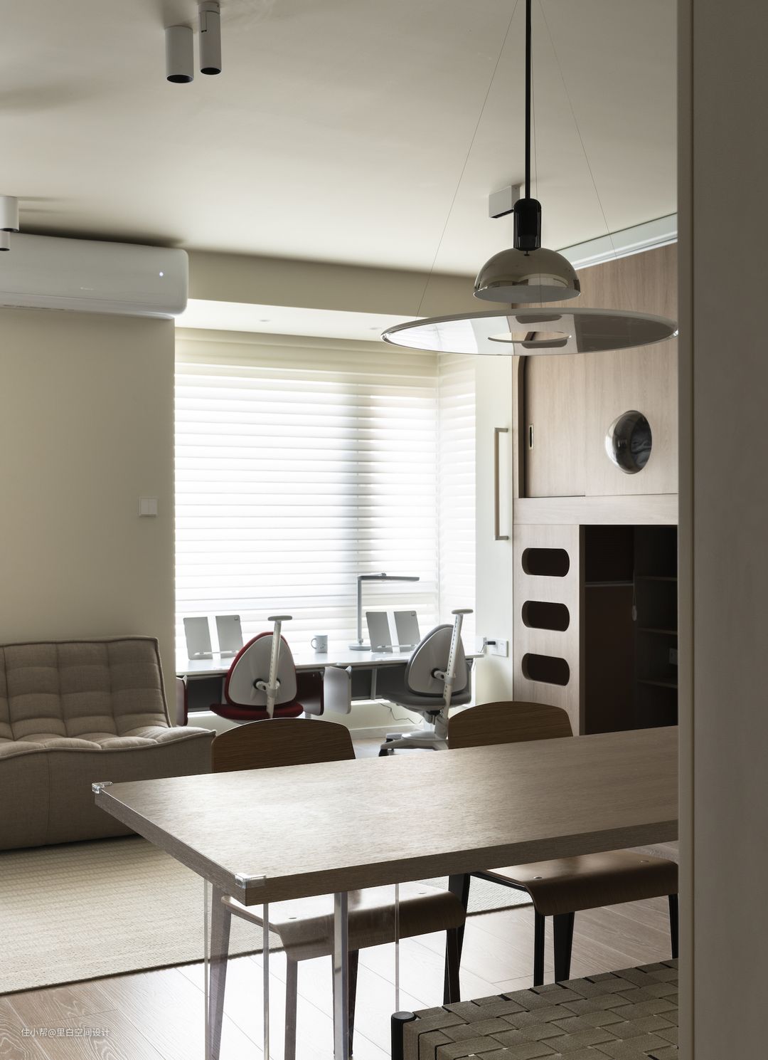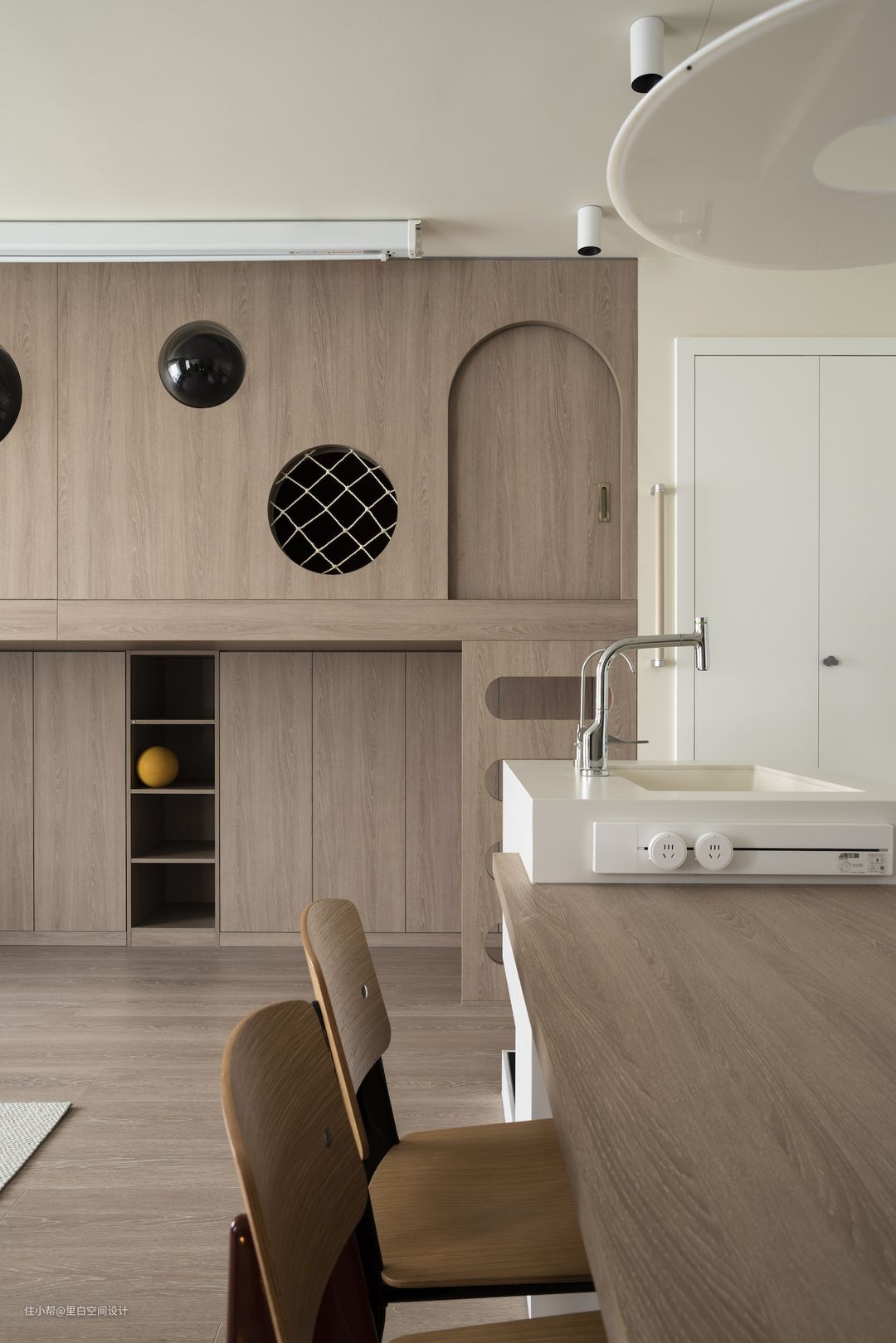 原户型本就是客餐一体的布局,改造时我们合并了厨房,做成了LDK一体的空间,各个功能区能相互借面积,其实无形中增大了各个空间的使用面积。公区以餐岛为中心形成高效洄游动线,串联起各个空间。 厨房虽小,“含金量”高。整个空间由下厨动线串联,取食材-清洗-备餐-炒菜动作流畅,菜品从出锅到上桌仅需转个身就能完成。餐区可供四人同时使用,厨房一侧特意选了&tradition的藤编条凳代替传统餐椅,让过道更宽敞。 厨房墙面及岛台外立面均为德赛斯岩板,材质上的呼应统一视觉,同时也方便日常打理。 中岛主要以水槽为主,内部安装净水系统,侧面加装轨道插座,方便咖啡机等小家电使用。业主一家平时以少油少盐的简餐居多,所以做开放式厨房也基本没有什么油烟的困扰,而且开放式空间会更方便照看小朋友。 客厅是平时一家人互动、孩子学习和玩耍的场所,业主不希望被太多家具束缚,所以果断舍弃了传统的沙发+电视的布局,留出宽敞的活动空间,方便一家人游戏互动。 为了保证客厅区域的机动性,特意选择了轻便好移动的沙发,同时以投影仪代替电视机,我们在儿童房顶面区域安装了电动幕布,正对主卧床,周末一家人能窝在沙发或床上看电影、动画片,当幕布收起,客厅又能一秒切换会客厅或游戏区。 小朋友在学舞蹈,所以公区也承载着一部分舞蹈室的功能,我们在玄关进入室内的动线上设置了一面全身镜,既能方便出门整理仪容,也能作为小朋友的舞蹈镜。 客厅采光最好的位置留给了学习区,两张可升降的学习桌并排放置在窗下,这样小朋友学习时室内也能保证有充足的光线进入。