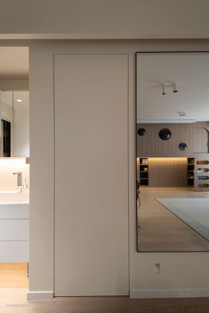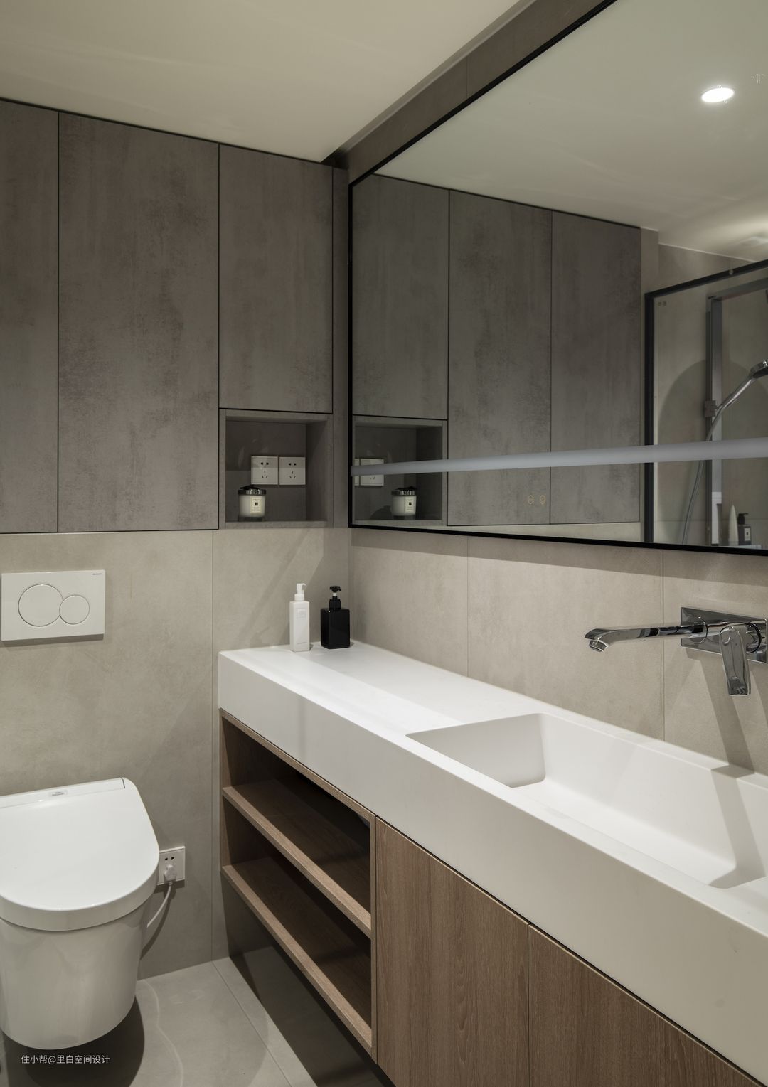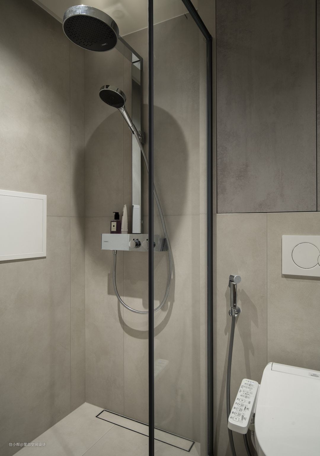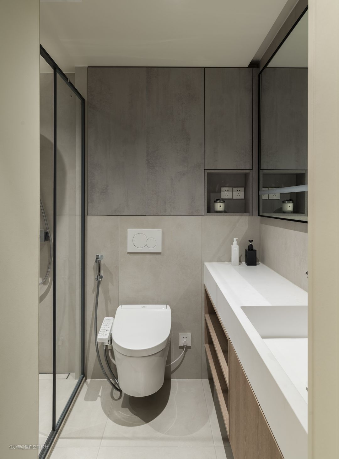 卫浴间采用隐形门的设计,门体表面与墙同色形成视觉统一,使得公区墙面简约一体,推门而入,又会给人一种“别有洞天”的空间体验。 卫浴间内利用玻璃隔断做干湿分离,因为空间紧凑,我们通过几个设计细节实现了小空间的高效利用: ①做壁挂式马桶,水箱上方做储物柜,方便清洁剂等消耗品囤货; ②1.8米超长洗手台一直延伸至马桶区,台面下方作开放式储物格,方便厕纸存放: ③设计壁龛并预留插座,方便剃须刀存放充电。