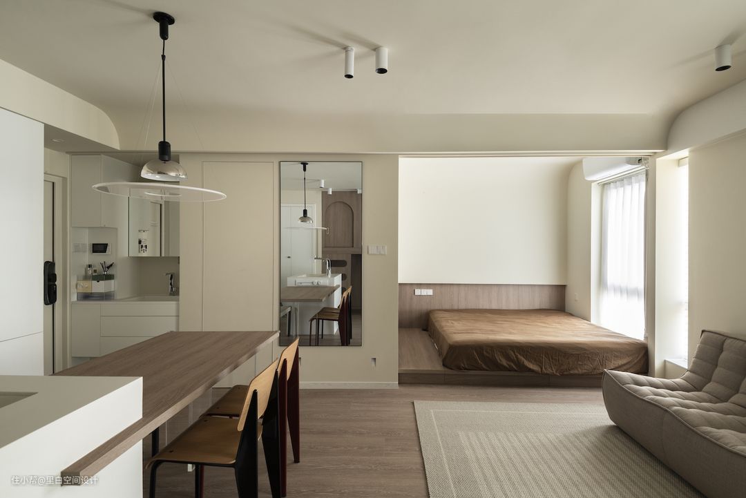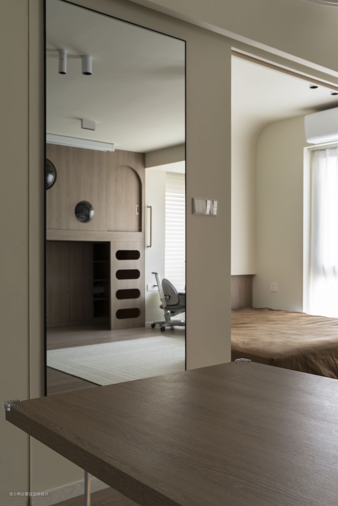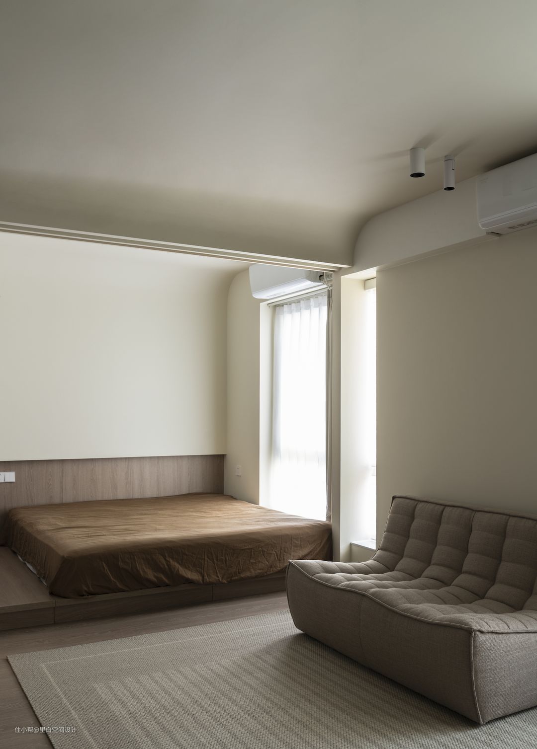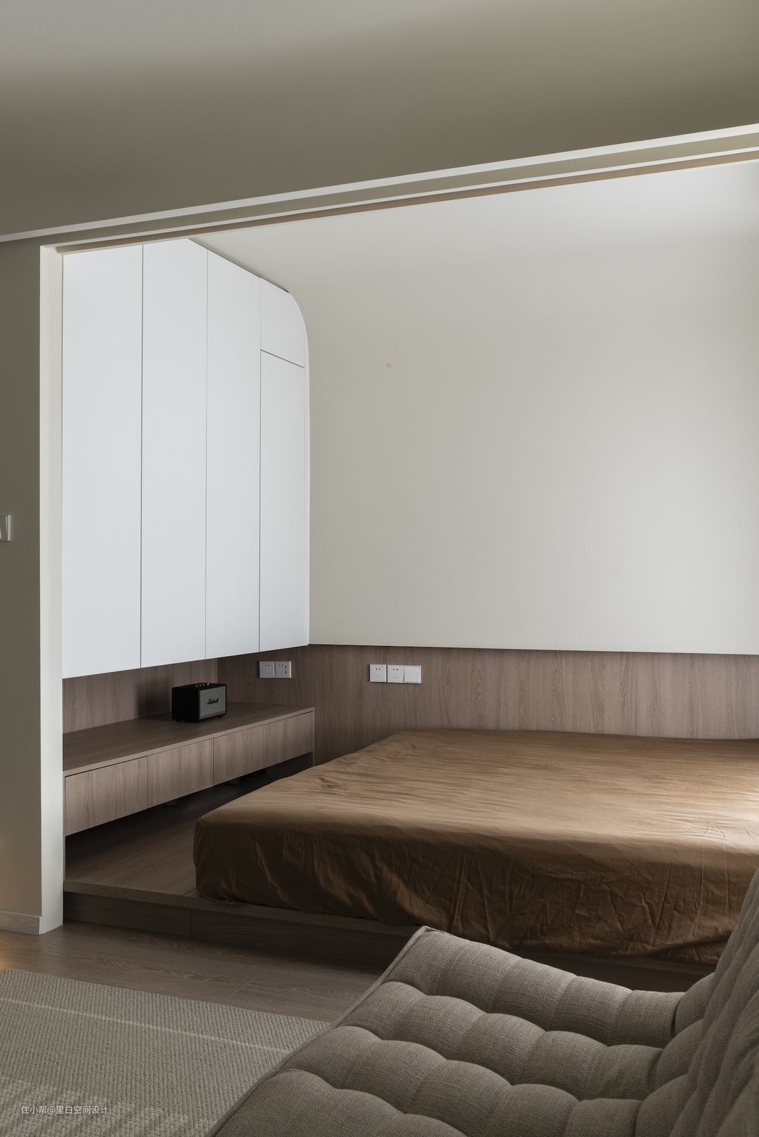儿童房对面就是主卧,为了节省空间,地面做了抬高处理,以地台床代替普通床架,靠墙位置顺势作衣柜储物,柜体下方预留开放式储物格代替床头柜,方便睡前收手机、书籍等物品。 卧室入口上方是结构横梁,我们利用弧形顶面造型,在公区没有吊顶的前提下将格局缺陷巧妙遮挡。