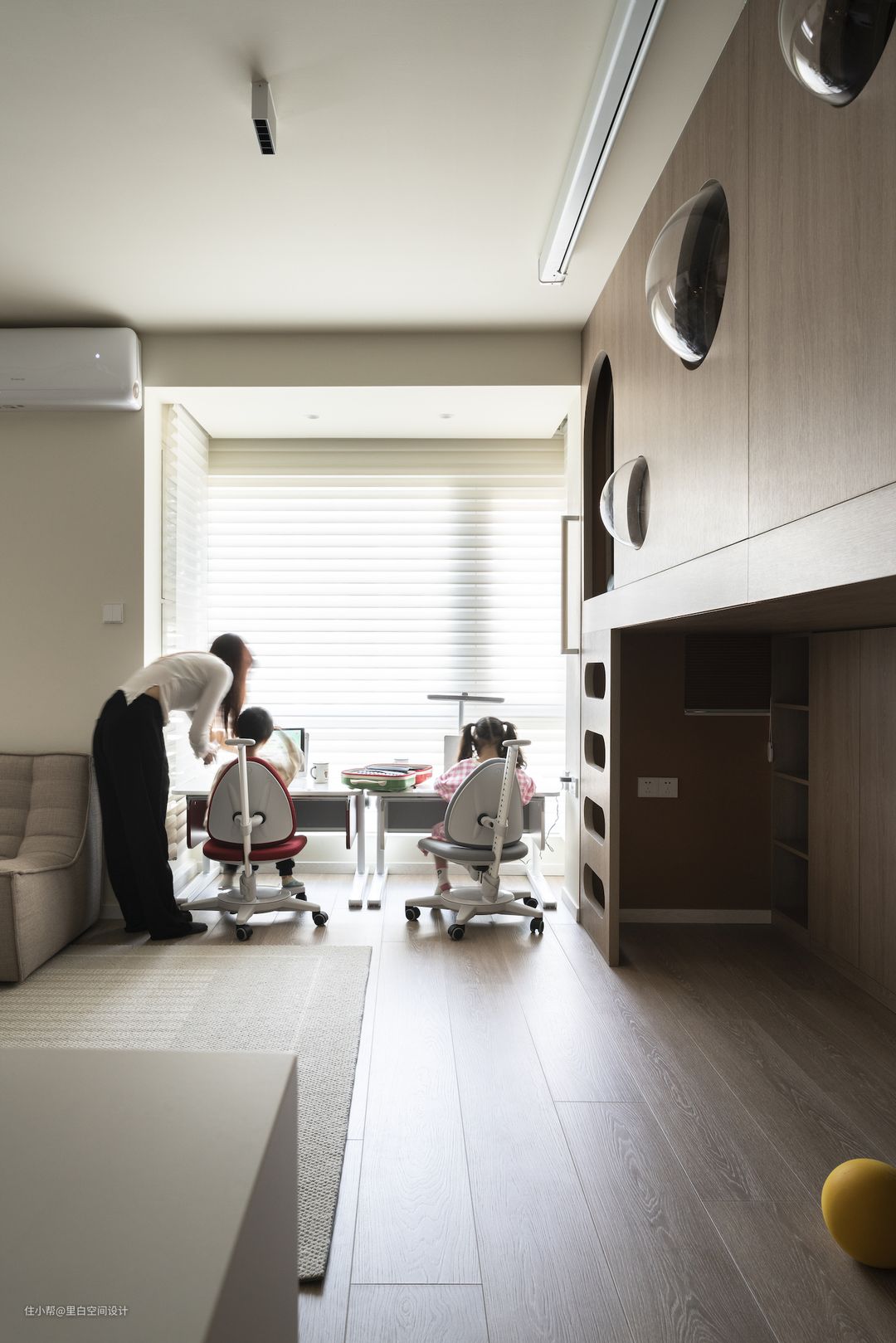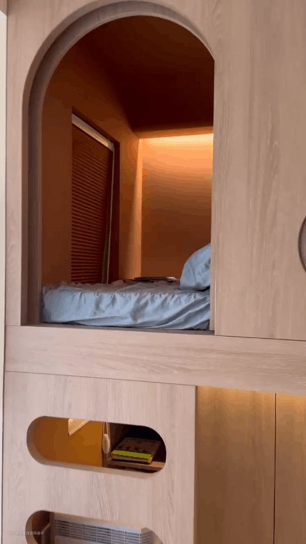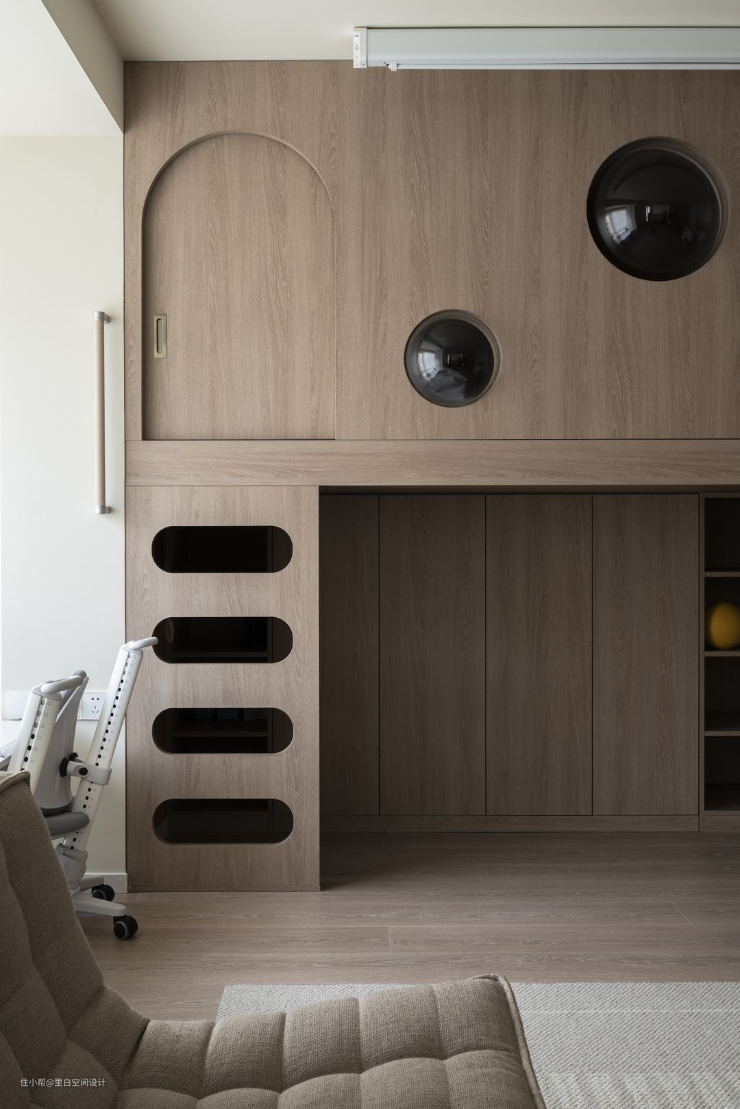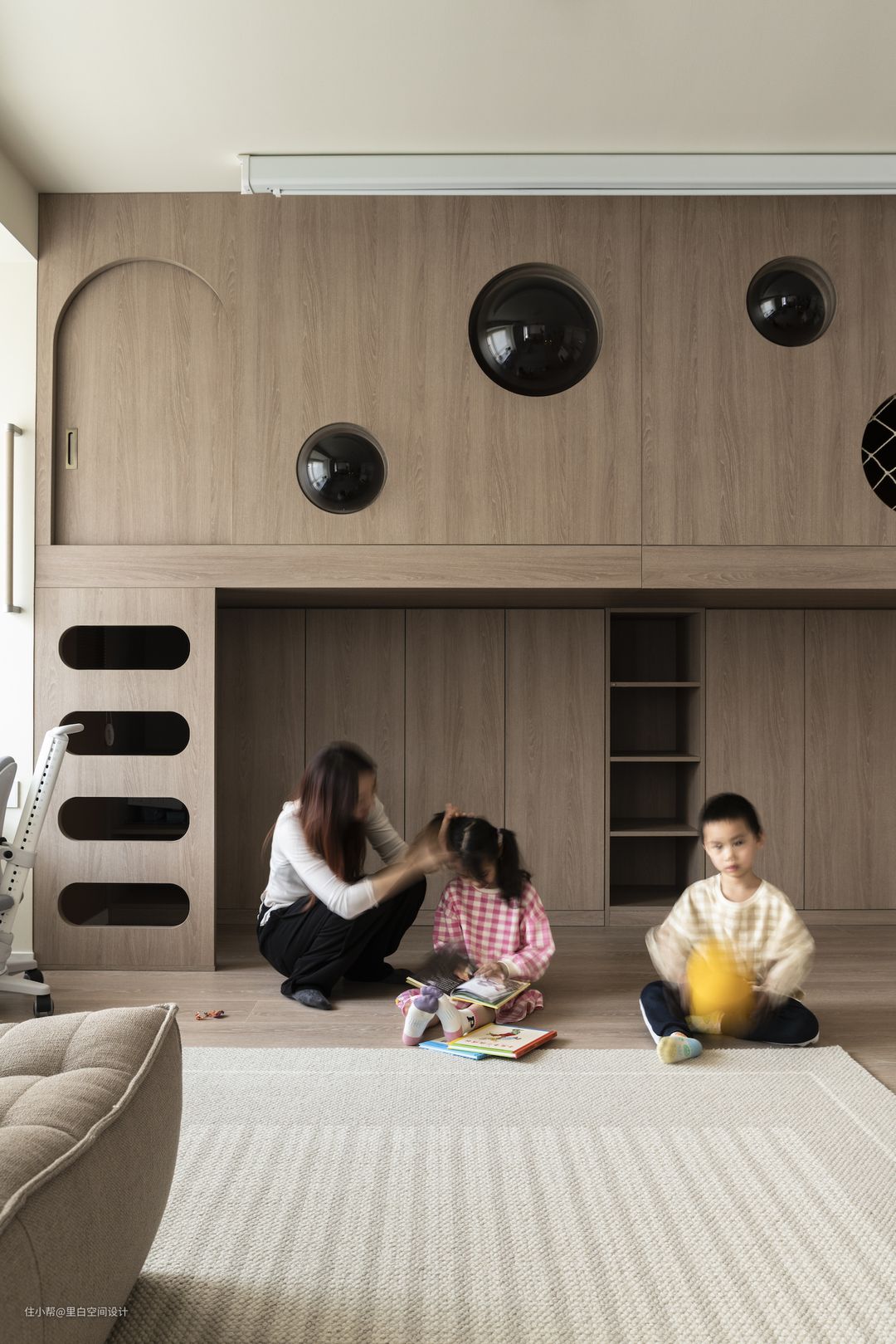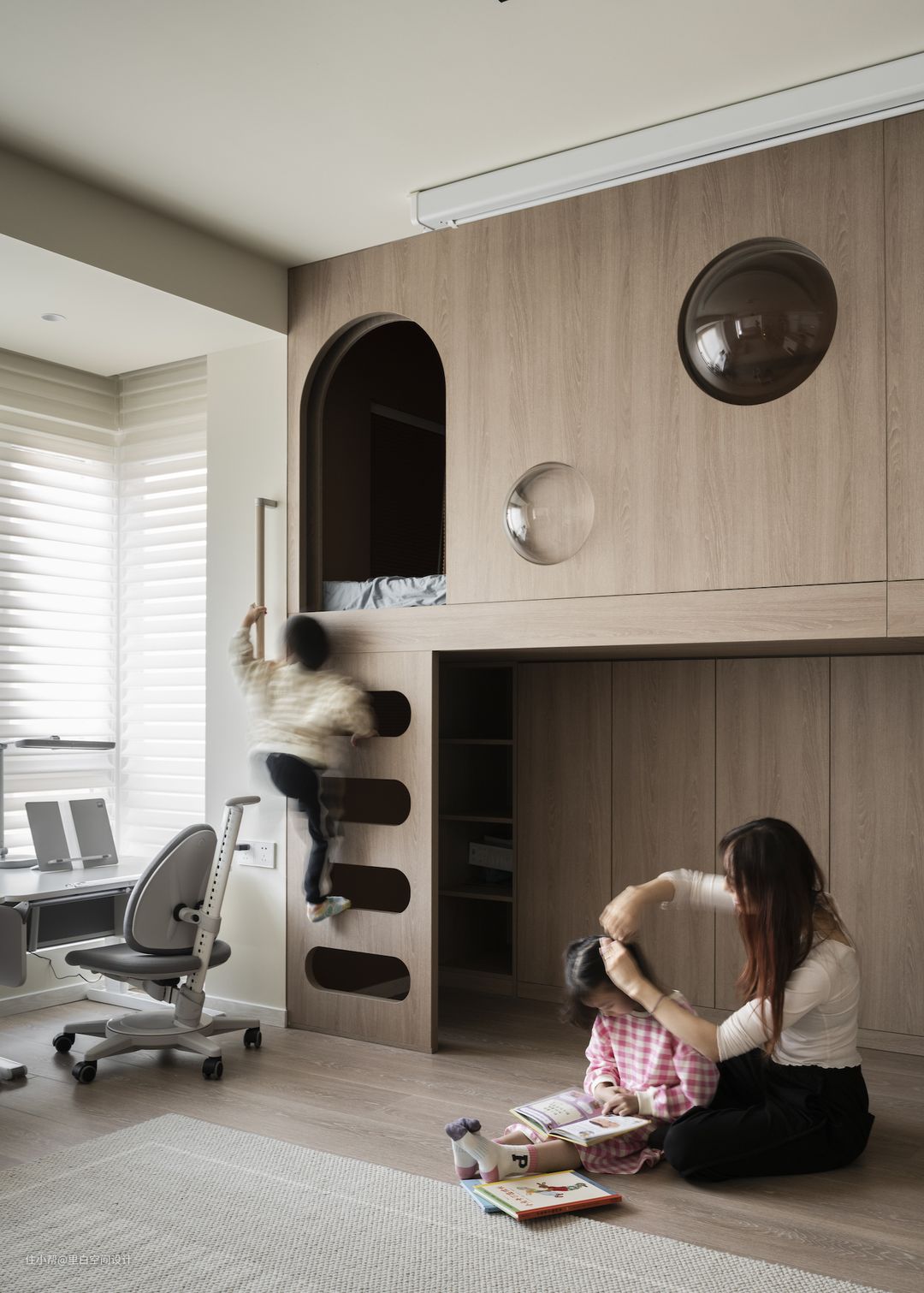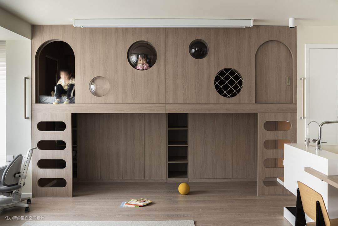 两个小朋友虽然亲密无间,但也到了要试着独立的年纪,所以才有了这两个独立“睡眠舱”的设计,作为姐弟俩的儿童房。 左右两个睡眠区分别设置了独立入口,中间隔开。这样一来省空间,二来睡觉的时候虽然是各自独立的,但感觉上两个人并没有分开,空间关系亲密又独立。 能看到,我们在两个房间还特意留了“小机关”,增强与主卧大人互动的同时,也方便儿童房的通风透气。 儿童房左右两侧的入口分别安装了TOTO的壁挂扶手,小朋友攀登时能借力,保障安全性。睡眠舱内直接铺床垫,空间内部设置灯带及独立开关,左侧就是透风窗。 两张儿童床下方为游戏区兼储物空间,主要用来收纳姐弟俩的四季衣物和玩具,两个小衣柜由中间的开放式玩具收纳格区分,男左女右方便使用。 儿童房的起夜动线会途径餐区和岛台,我们在岛台下方以及卫浴间门口分别做了感应小夜灯的设计,夜间起夜即便不开全屋照明也能看清路。