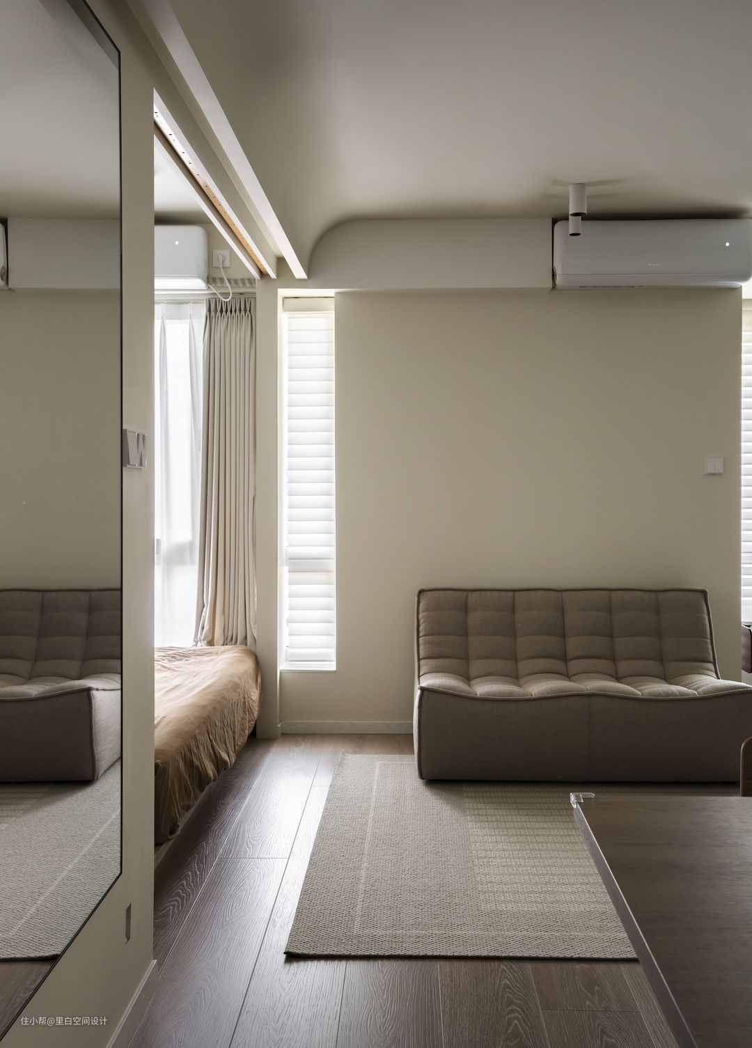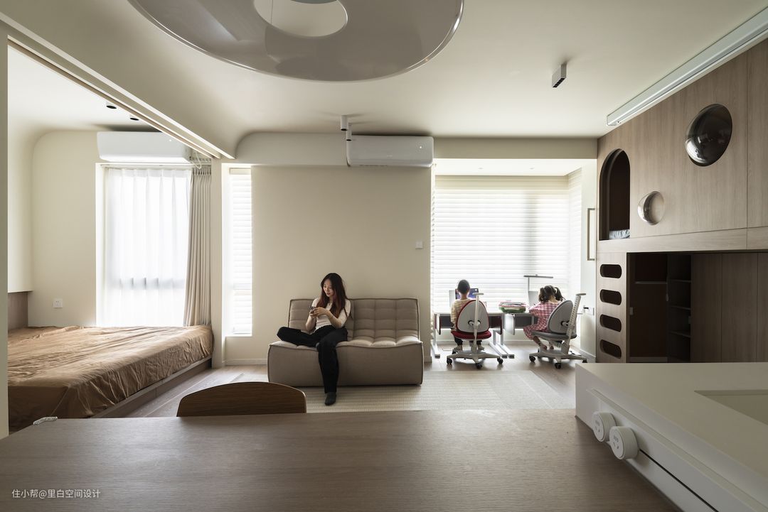 这次我们用到了“睡眠舱”的概念,利用定制家具在客厅新增了两个独立睡眠区,解决小房不够住的痛点。改造后的空间,格局开放宽敞,视觉上有藏有露,小中见大。