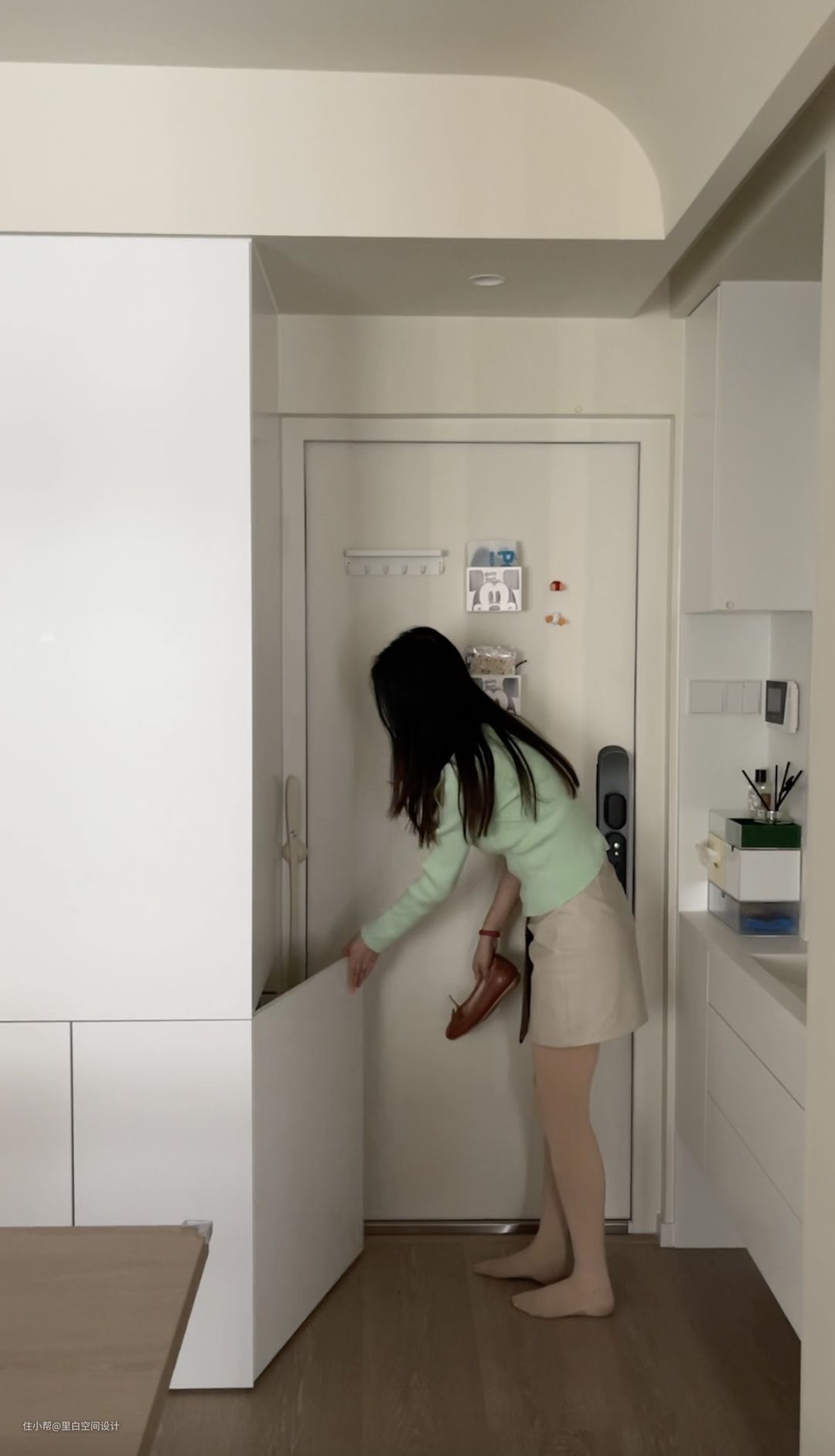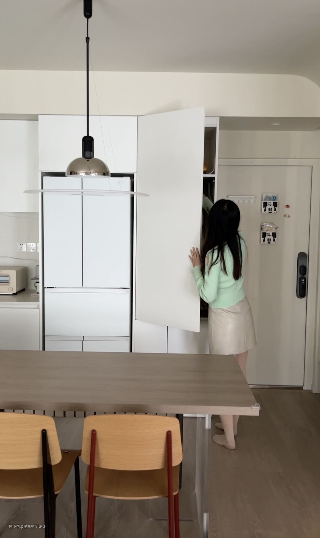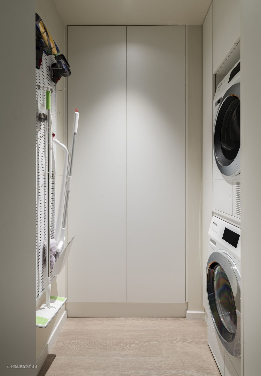 卫浴间太小,放不下洗衣机,我们利用厨房下水在旁边的位置隔出独立洗衣房,洗烘衣机套装上下叠放更省空间,也解决了业主家没有阳台晾晒衣物的困扰。 四周做储物柜,方便收纳洗衣液,墙面利用洞洞板将常用的清扫工具壁挂收纳,高效利用纵向空间,不浪费每一寸面积。 从不那么完美的小房子,到慢慢变成理想中的家,离不开业主的信任以及靠谱施工团队的添砖加瓦,希望这间“不妥协”的学区房,也能给准备装修的你带来一点灵感呀。