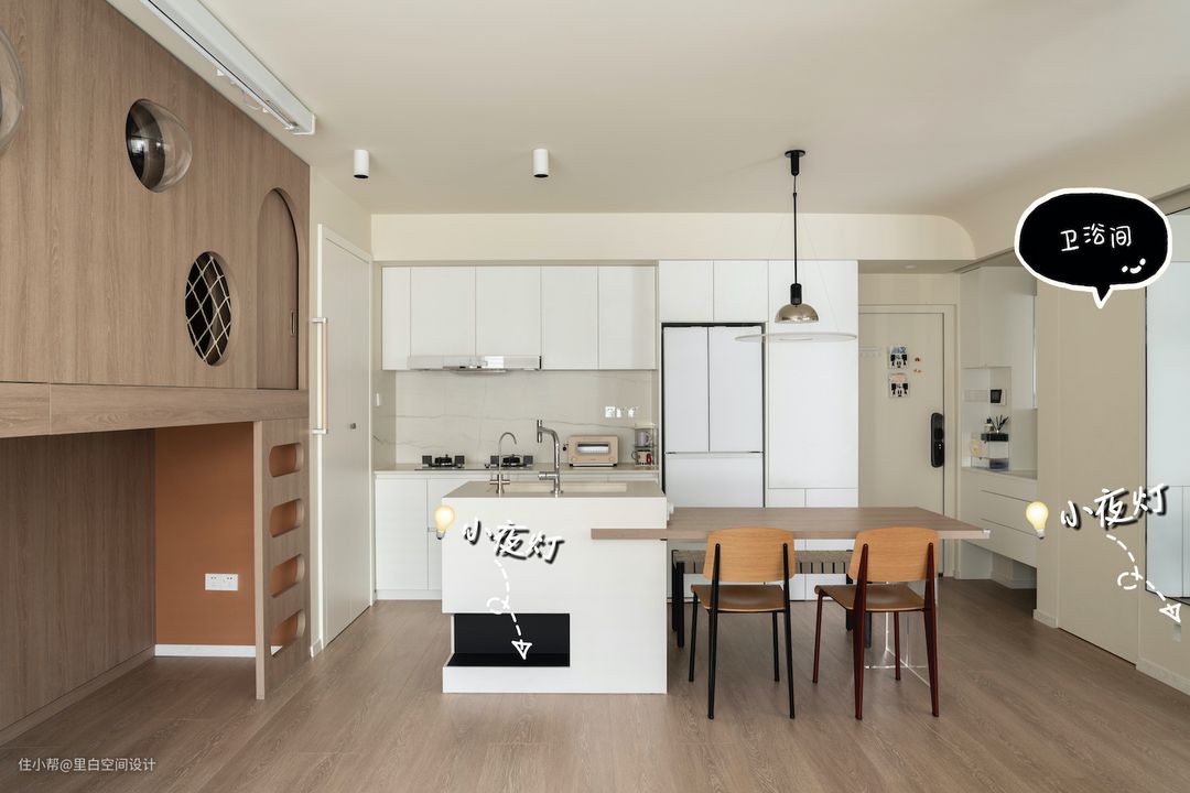 改造tips: ①弱化房间界限,扩大北向进光面; 业主家两个小孩,不仅需要独立的学习区,还要有充足的活动空间,所以我们适当缩小了主卧,将公区地面面积尽可能扩大,同时弱化餐厨的边界感,打造客餐厨一体的LDK布局,化零为整,让一家人能有更多的互动空间。 开放式的布局也有效改善了原本的采光问题,减少了隔断阻挡,空间显得更开阔了,室内通风有保障。 考虑到2岁的男宝年纪小,为了方便照顾,主卧目前暂时做开放式处理,我们提前预留了推拉门轨道,后期能随时切换独立卧房。 ②引入「睡眠舱」,新增两间儿童房; 面积有限,所以儿童房的设计引入了“睡眠舱”的概念,在原储物间的位置改出了两个1.2米X2米的独立小房间,房间左右两侧分别设置入口,中间是隔开的,独立又亲密。 上床下柜的设计,方便收纳姐弟俩的衣物和玩具。 改造后虽然房间变多了,但通过合理的布局,让原本封闭局促的空间得到了解放,视觉上也就显大、宽敞了。