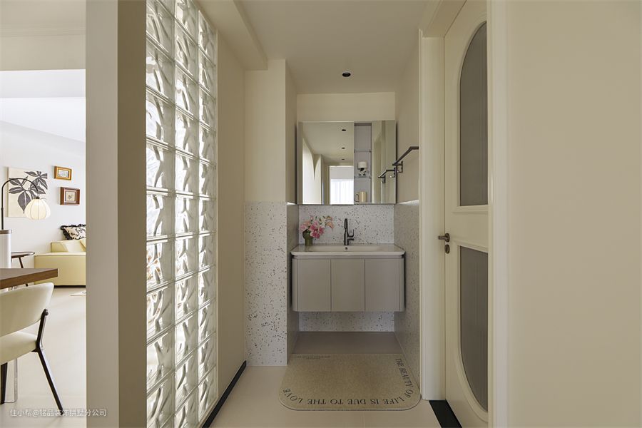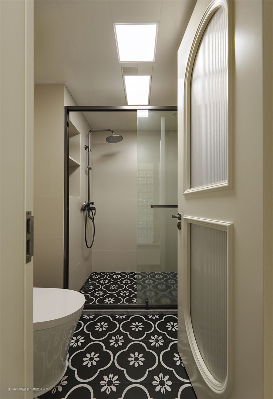卫生间采用干区外移的方式进行干湿分离,同时结合明亮的玻璃砖做隔断,避免了暗道的劣势,尽可能提高了空间的采光能力。卫浴室内深色花砖,精致大气又耐脏,黑色淋浴房边框与地面做了个色系呼应,视觉上不会突兀