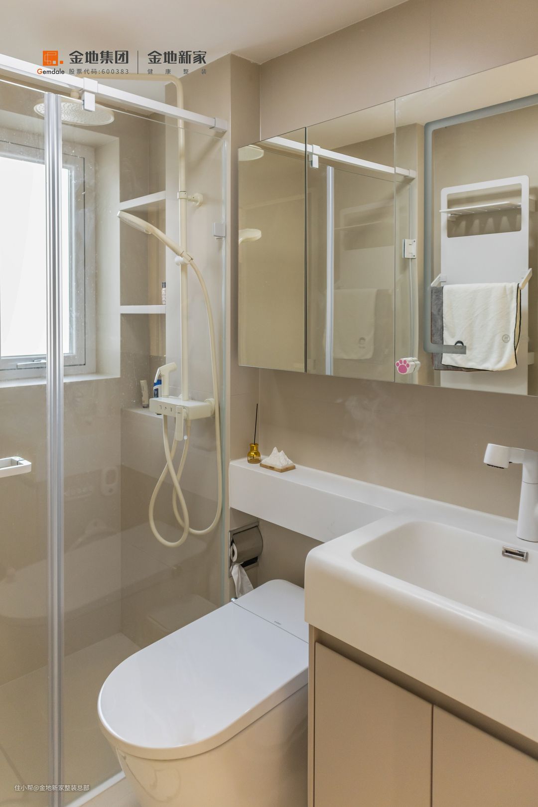 卫生间在干湿分离设计下面积空间正好适中,为了保持空间走动的舒适感,没有选用常规尺寸的浴室柜,搭配整体风格选用迷你浴室柜,在淋浴区域满足物品放置使用便捷,设计了延伸到天花板分三个部分的壁龛,让淋浴区看起来更加干净、优雅,还能增加额外的储物空间。