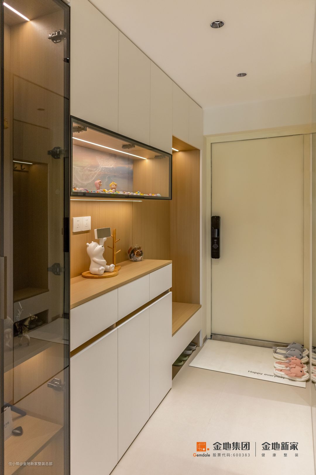 玄关区域是日常使用率较高的一个空间,需要从实用和方便的角度出发,在鞋柜的底部做了15cm悬空高度,用于专门收纳平时穿的鞋子,15cm的高度是一个比较常规舒适的高度,既不会影响扫地、拖地,又能放得下大部分尺寸的鞋子。玄关是常规三段式+挂衣换鞋凳形式,在结合业主的兴趣爱好在一侧延伸做了展示柜,灯带+玻璃柜门的组合,让收藏手办焕发新的光芒。