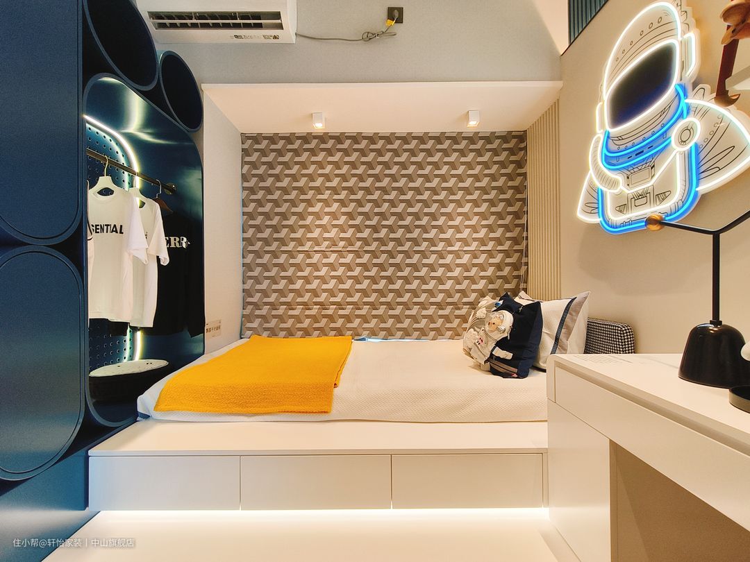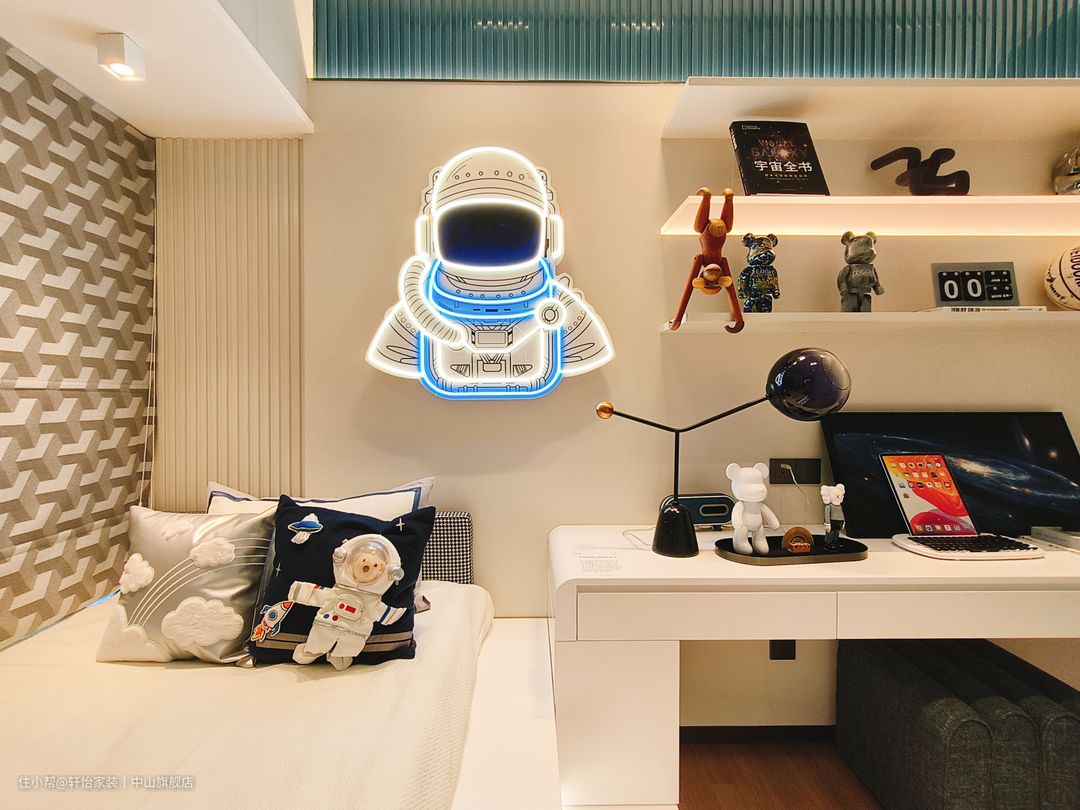 儿童房考虑房间的整体布局和空间需求,采用地台加衣柜的储物设计,满足小朋友玩具多,书籍多的收纳需求。床的底部设计为抽屉式收纳,以便存放小朋友的衣物。衣柜与床紧密相连,作为床尾板的延伸部分。床的设计采用简约风格,配备柔软舒适的床垫和床上用品,为孩子提供一个舒适的睡眠环境。床头的墙面安置孩子最喜欢的宇航员荧光灯挂饰,搭配白色墙面,营造出一个明亮、干净和温馨的环境。 儿童房作为一个多功能的空间,兼顾孩子休息和学习作的需求。通过摆放纯白书桌,提供了一个专门的学习区域,可以用于阅读、学习或进行个人计算机活动,合理利用空间,将其转变为一个适合工作和学习的角落。悬空式隔板置物架放上了孩子喜欢的玩偶摆件,创造趣味空间。 床尾蓝绿色的开放式衣柜以极简设计为理念,蓝绿色门板嵌入灯带,是孩子最喜欢的经典配色,优雅碰撞,让空间尽显精致干练。在左侧封闭式门板的设计上,考虑到了收纳过季衣服和被褥的需求,留出了足够的空间,而右侧开放式的橱柜则可以挂放孩子平时穿的衣物,让小朋友在使用时更加方便!