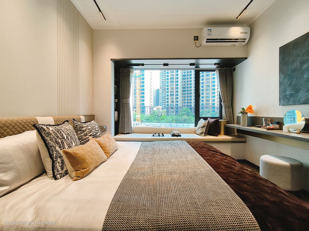 主卧运用柔软色调,打造包裹感,一张柔软的床犹如一艘船,夜晚带着我们驶向梦的乌托邦,床头吊灯给予户主充分光亮,光源以点线的形式存在,引导空间节奏变换,带来一种妙手偶得的安宁。金属线条折射的光影,与硬包饰面交相辉映,演绎现代轻奢的风格气质。飘窗搭配定制软垫轻松,打造开放式休闲区,采光优越,坐感舒适,在家即能感受四时之景。 轻奢风同样延伸至主卧,背景墙线条分割精致,小花抱枕造型灵动,多种色块、材质的巧妙点缀让艺术的呈现更加细节多元。大床两侧设有床头柜,让床头区域更加简洁和方便。胡桃色与白色搭配的卧室背景,明暗交织,既不会过于沉重,又不会过于明亮,此种中和平衡感非常有助于睡眠。 梳妆台设置在主卧床尾面对墙壁的位置,空间利用率极高,也不会占用过多空间。悬挂式梳妆台的设计增加了储物空间、提升美观性和实用性,同时实现空间的隔离和整洁。胡桃色的极简梳妆柜,延伸至飘窗,开放式的收纳放置化妆品也能一目了然;主卧同客厅的设计一致,打造的是无主灯的设计;墙面挂置的是抽象现代画,居住的氛围感拉满。