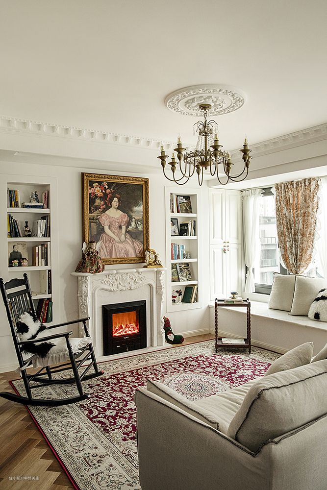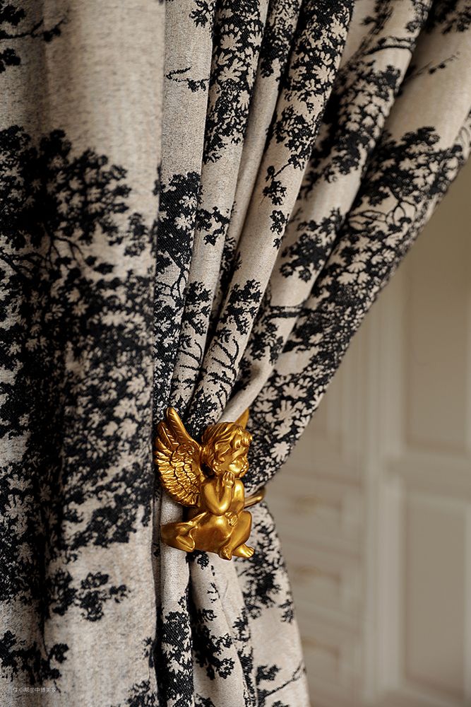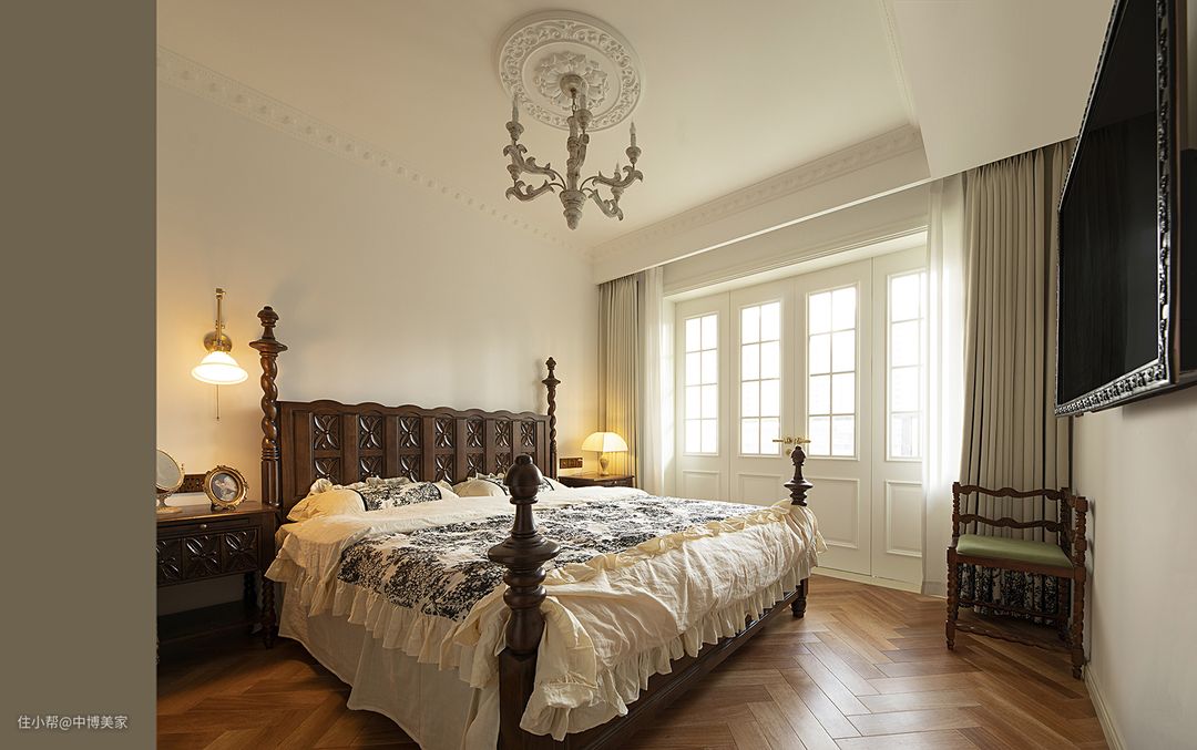 睡眠区和衣帽间用法式复古的窗帘进行阻隔。 增加富有层次的法式石膏线+拱形门洞,柔和的线条将法式的温柔氛围感拿捏
