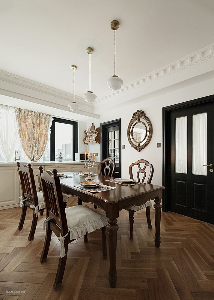 餐厅一体自带仪式感,客餐厅一体化,更多互动空间 复古红棕色的餐桌椅搭配精致的器皿,给用餐区增添了优雅浪漫的氛围。