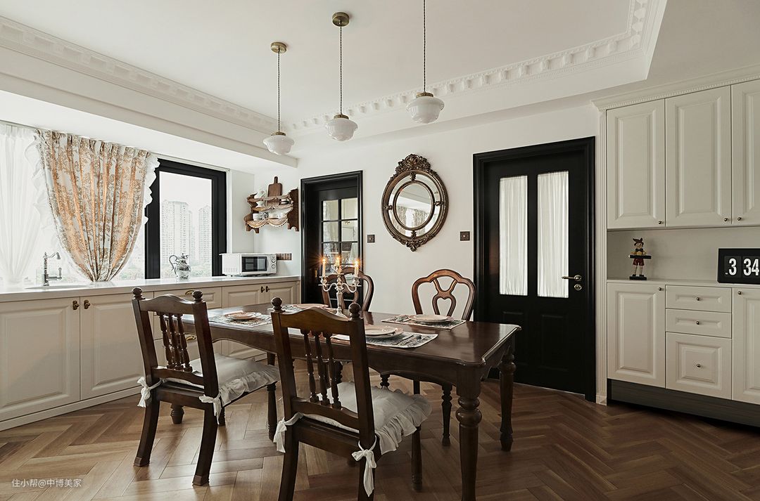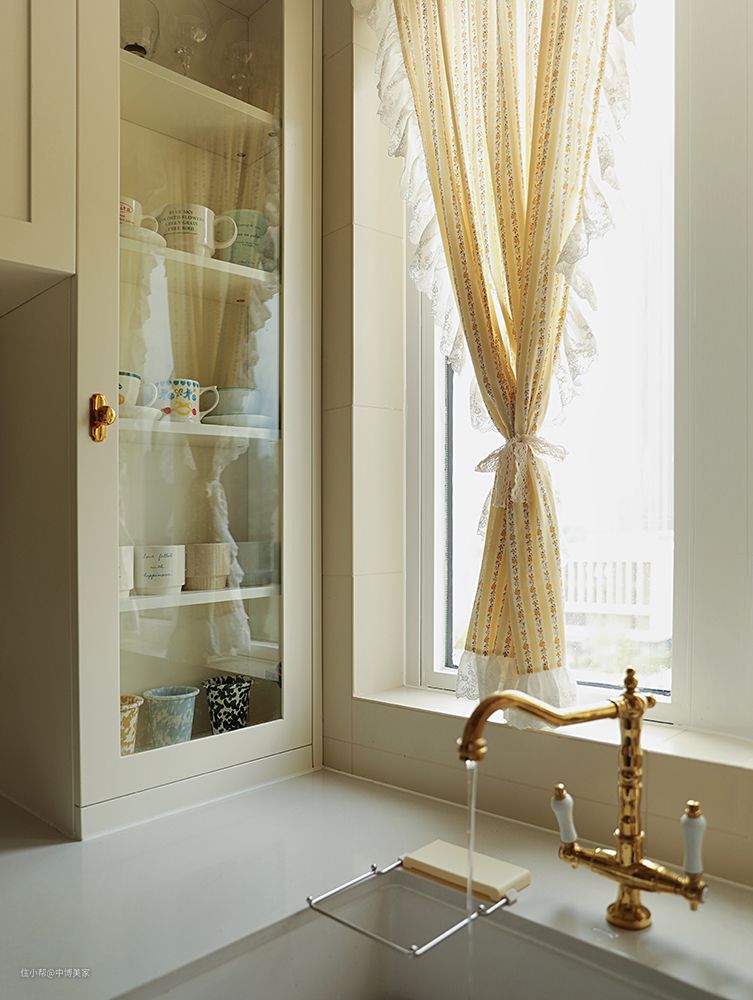白色橱柜+金属把手搭配,法式复古的韵味+南洋风情,使得这个充满烟火气的餐厨区精致又浪漫~
