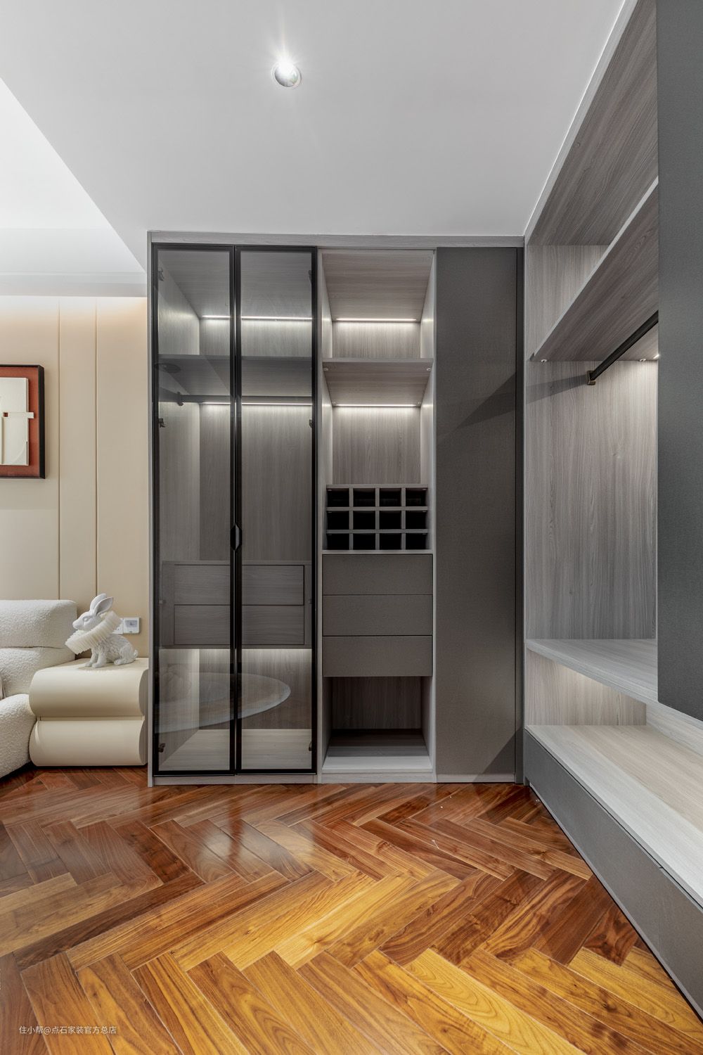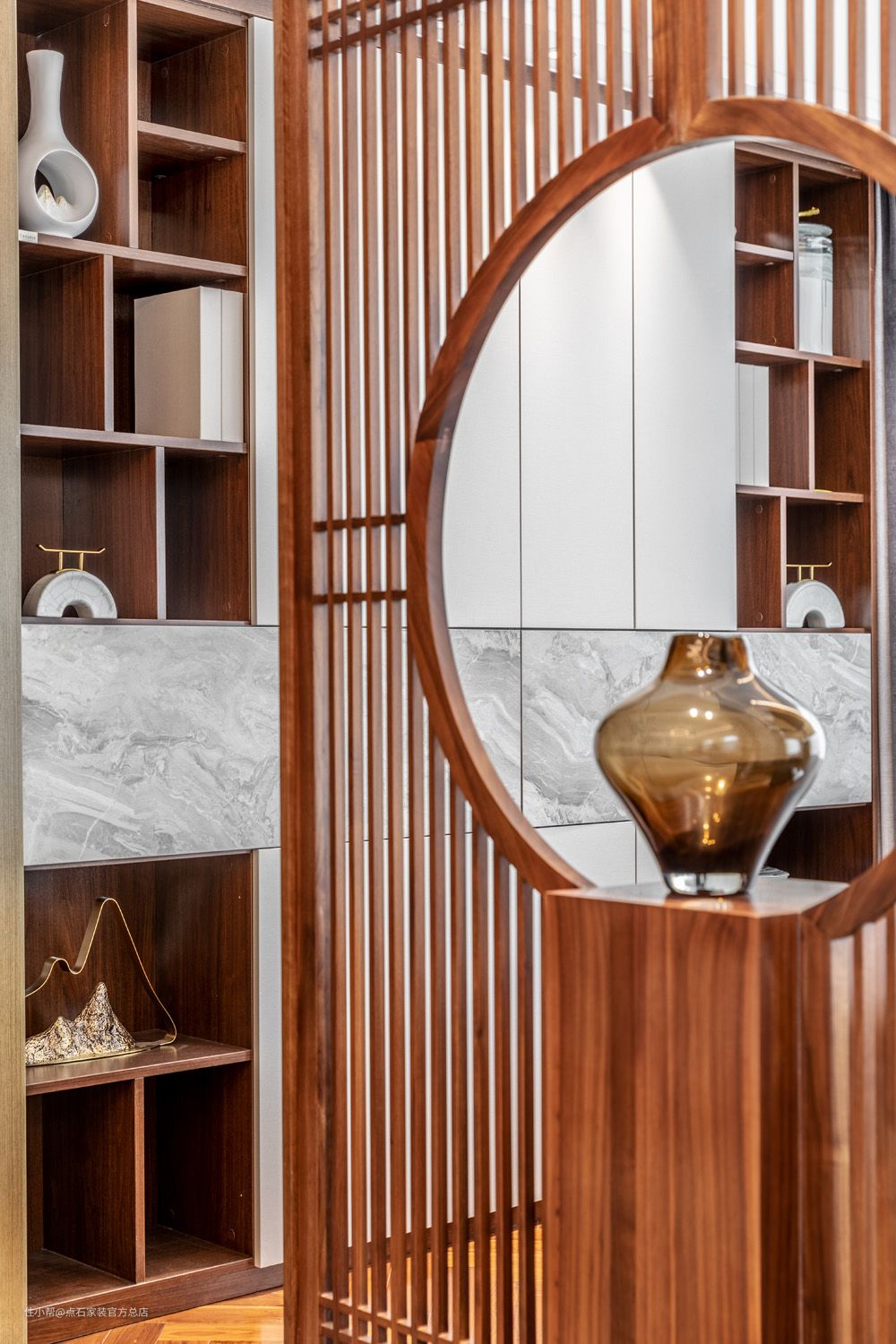 餐厨区域以现代工艺巧设古典场景,无处不显露国风雅致,又无处不蕴藏现代踪影。简约空间辅以精心筹措的细节,以繁制简;沉静素雅的松石绿点缀其间,丝丝入扣。