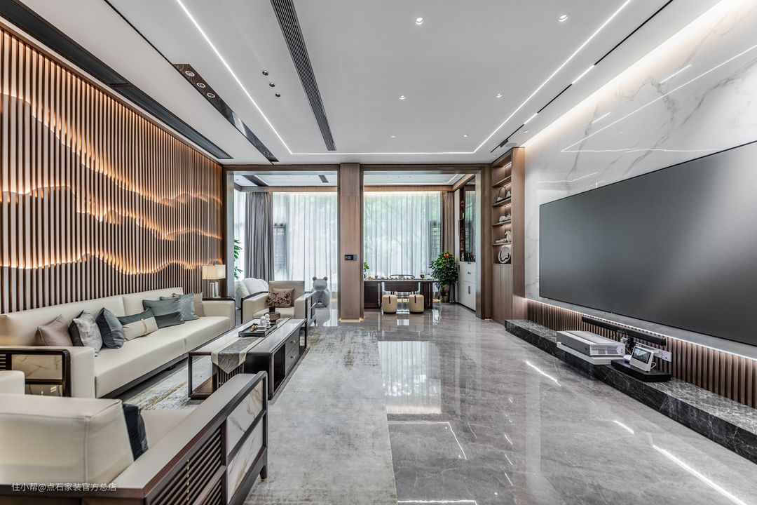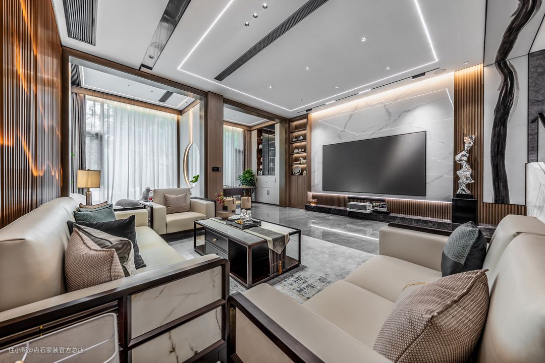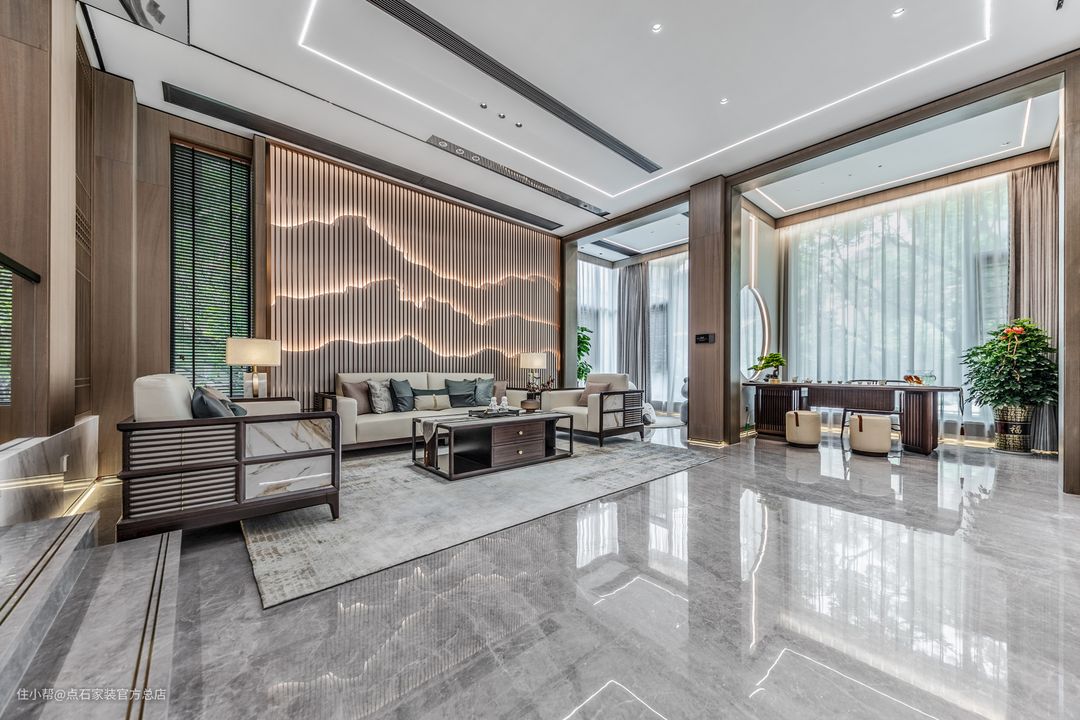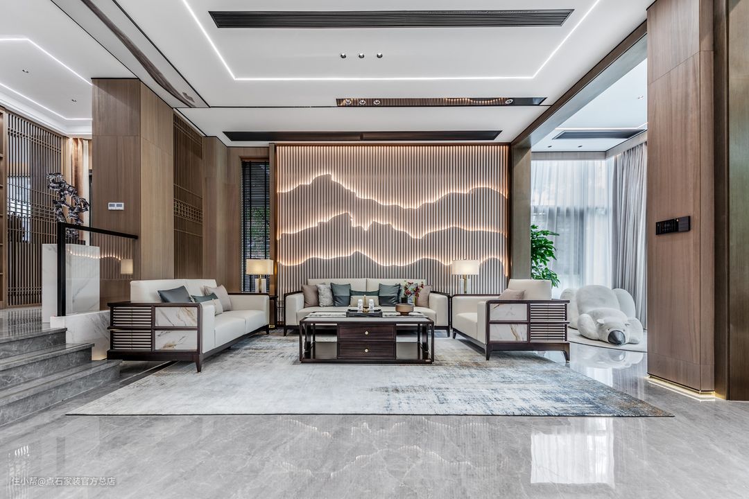 本案立足于传统,又施之以创新,经过不断的提炼和丰富后自成一派,呈现出极为浓郁的东方情调。古典风格与现代元素的柔情交错,衍生了无数格调高雅、简约大气的新中式空间。 客厅用色整体素雅和谐。横平竖直的空间线条里,写意纹理如水墨般晕染开来,麻布、不锈钢、玻璃、实木等材质亦悄然置入,东方情韵与现代骨骼大胆融合,相得益彰。仿佛窥见雨过天青后,这一座深宅殷切却澄澈的期盼,盼君归来。