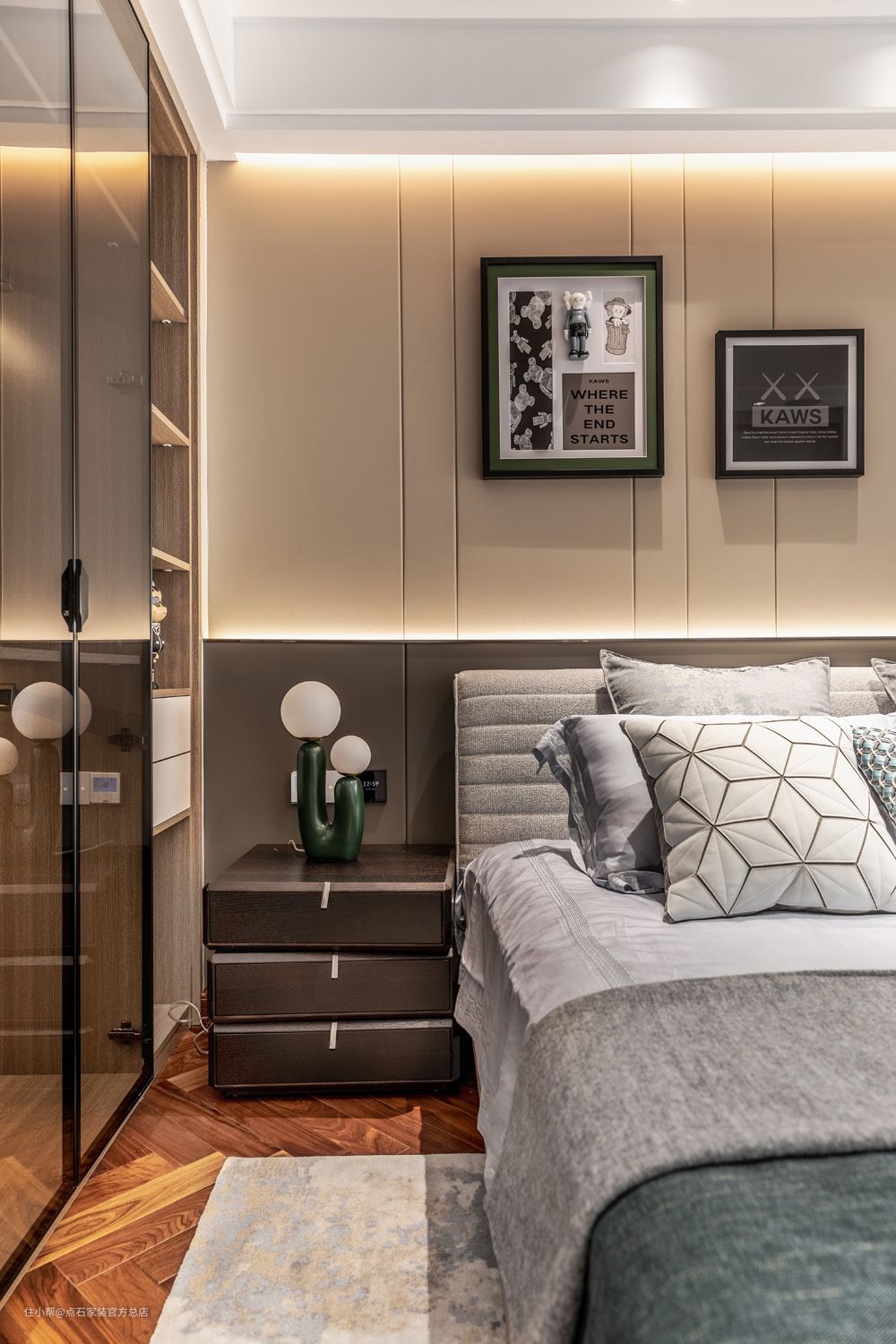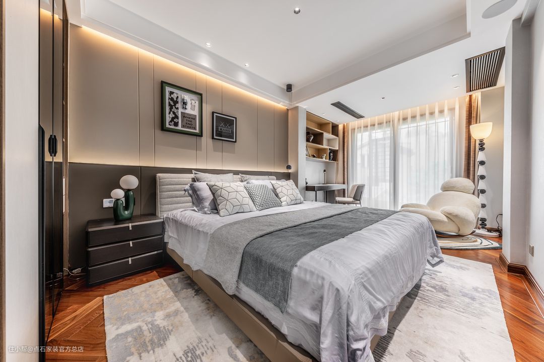 主卧室以白、灰、亚麻等淡色为主,较之公共区域更添几分清新自然。主灯造型呈山峦起伏之态,首尾相接,连绵不绝;日光透过层层窗帷,自在穿梭间,照见一室典雅,写意风流。