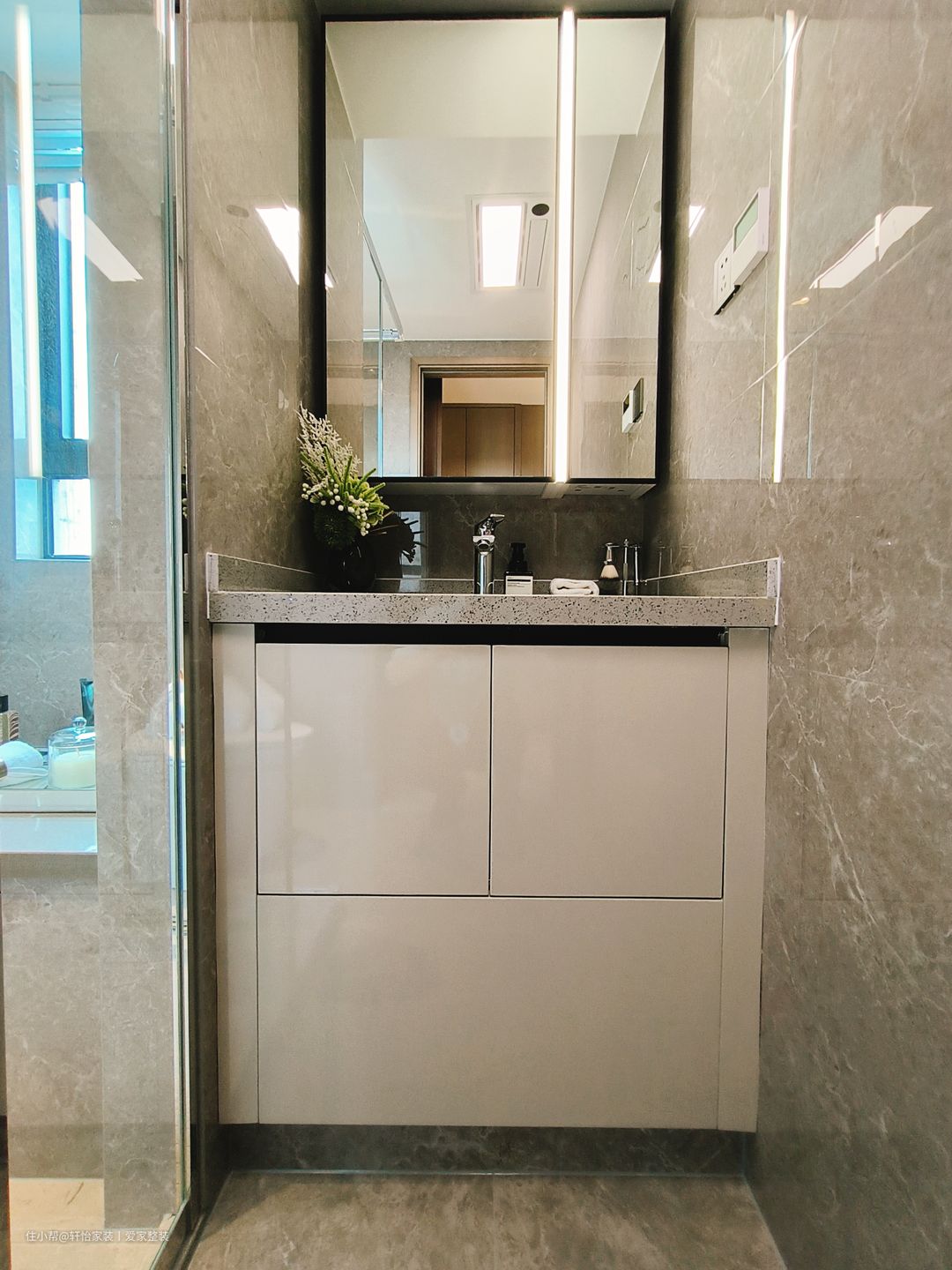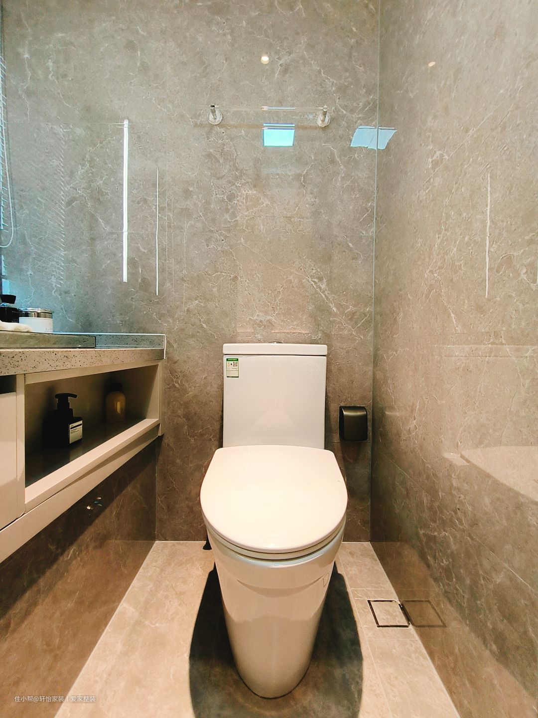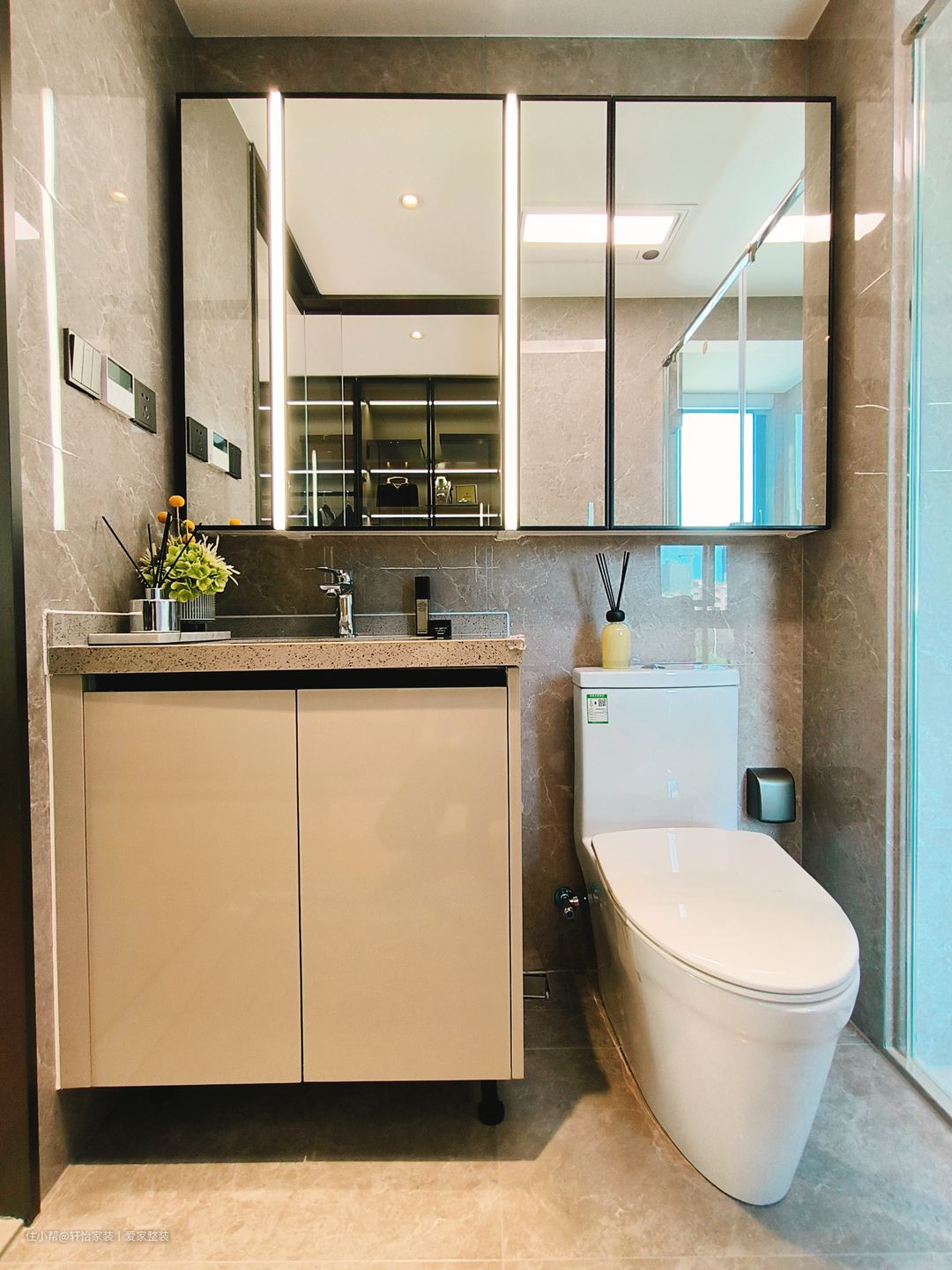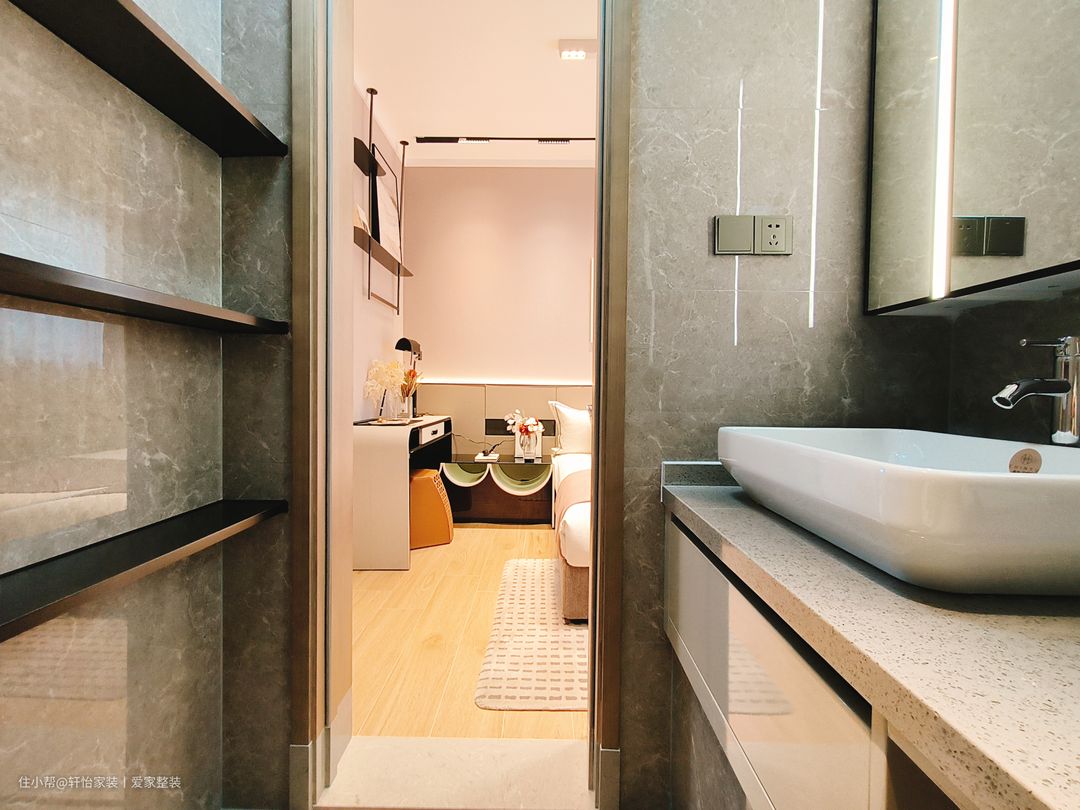 客卫采用一字型设计的布局,这是小面积的常用布置。镜柜的安装能收纳洗漱用品,减少台面上的置物压力,让小空间收纳得到合理利用。洗手台的下陷式设计,则可以将内嵌橱柜放置于其中,具备收纳又遮挡了下水管道,让我们的小空间充分利用。底部悬空的位置摆放扫地机,在清洁时更加得心应手。 客卫同样采用干湿分离设计,透明玻璃隔断浴室,使得整个空间非常透明明亮,让干处不沾水,更容易打理。智能马桶的半墙凸出设计,不仅增强了空间的立体感,还可以放置装饰画以及清洁用品。