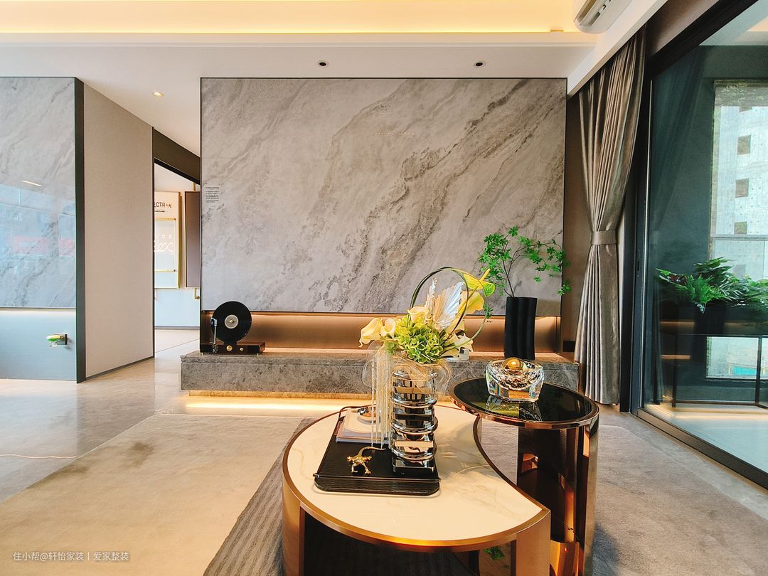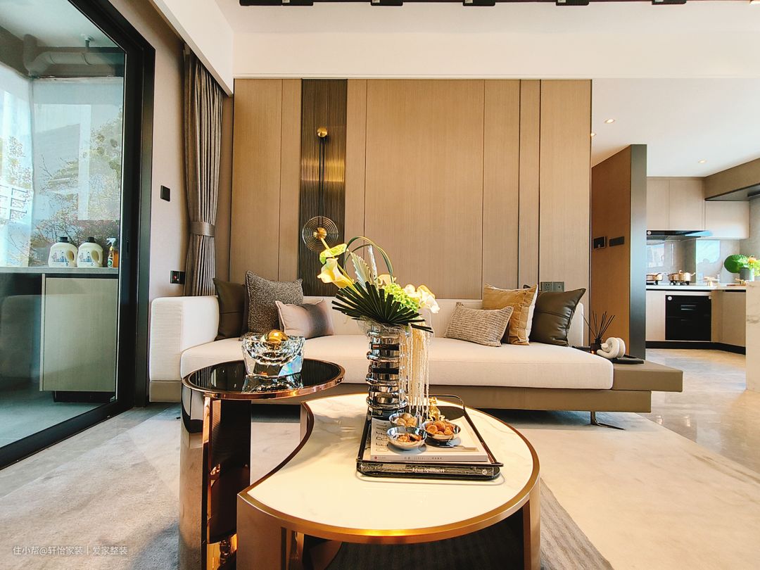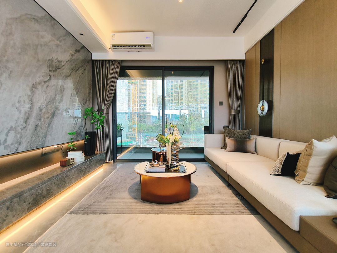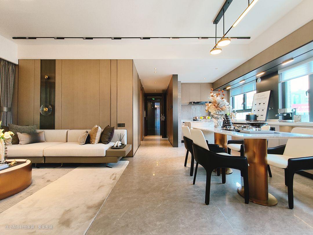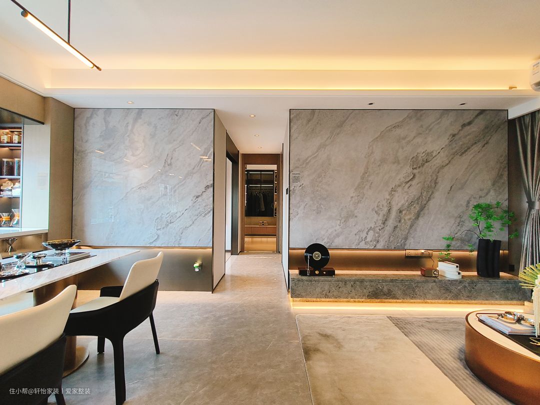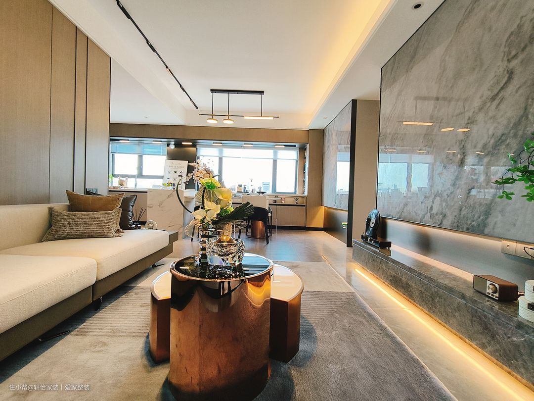 客厅空间的软装搭配十分和谐,既有延展的过度,又有细节上的叠加,承托出更多的丰富多元空间情感。沙发背景选择整面的原木墙,再搭配奶白色的科技感布艺沙发+铜艺茶几,外型化繁为简,简约大气的质朴感低调从容,同时也凭借着原木带来的柔和醇木质感,天然温润的色彩,清新自然的勾勒出业主豁达的生活态度和家居温情。奶白色沙发搭配棕色底座,与整个通铺的浅灰色纹理地砖交相呼应,形成三位一体之势,在搭配上让视野衔接自然,饱和色度不一的同一色系的搭配是值得参考的设计。 设计师用整面的浅色系纹理的大理石代替电视墙,为客厅增添了些许轻奢氛围。落地电视柜的设计的运用则为整个空间增添了一丝现代感,营造出清新而不失沉稳的氛围。减少卫生死角,还可用于收纳电视周边设备及日常杂物,实用性与美观性兼备。 客厅照明采用无主灯设计,筒灯+灯带+射灯的多重组合,柔柔的灯光倾泻而下,饰画与跳色抱枕,共同在光影中轻轻倘佯。落地窗的大小适宜,为客厅提供充足的自然光线,地柜和茶几放置一些盆栽和装饰品,增加整个客厅的生气和情趣。