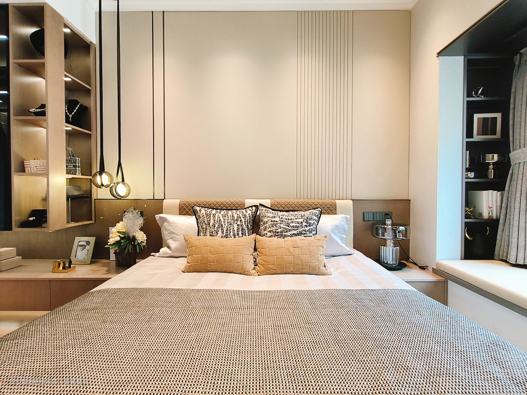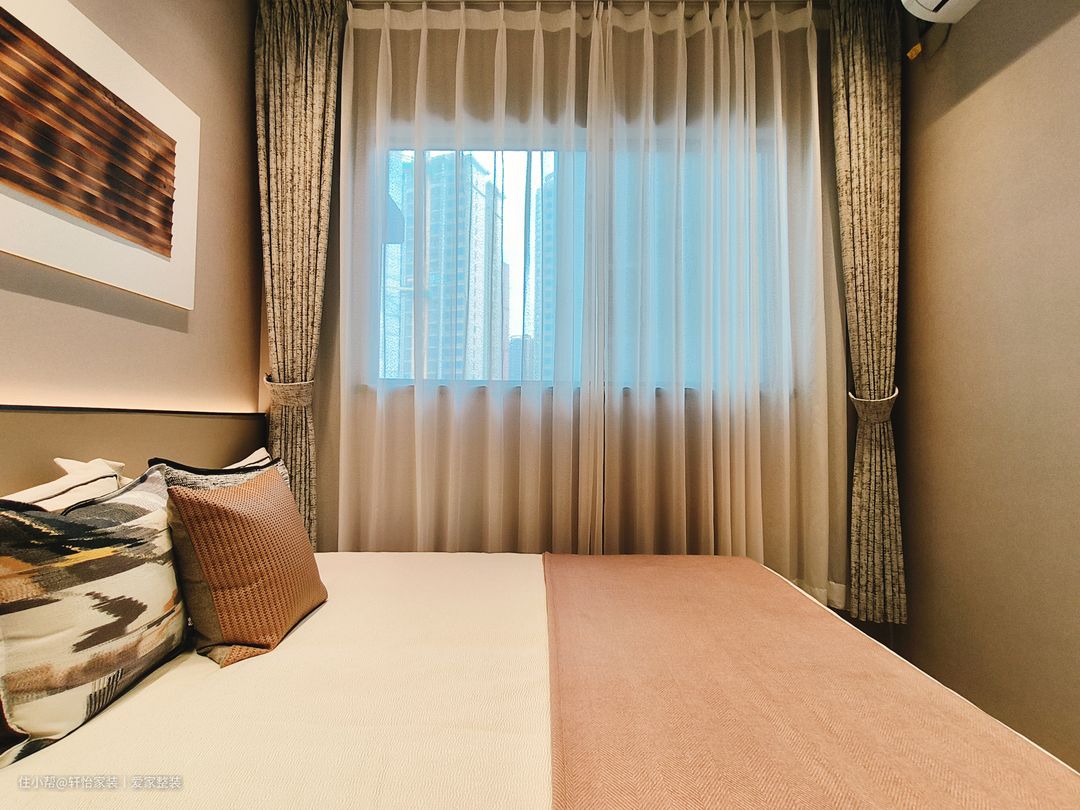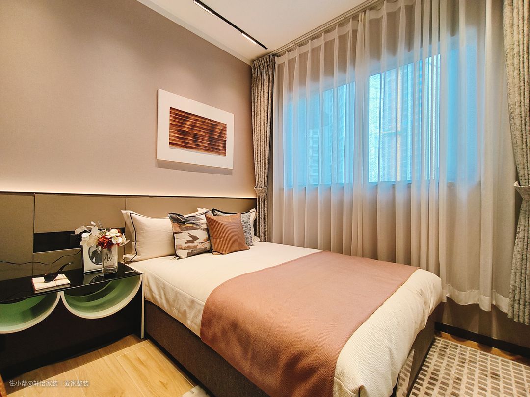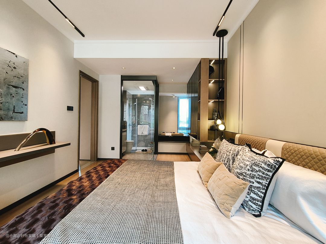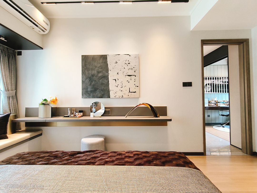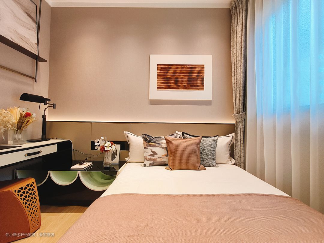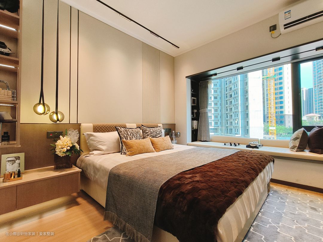 主卧运用柔软色调,打造包裹感,一张柔软的床犹如一艘船,夜晚带着我们驶向梦的乌托邦,床头吊灯给予户主充分光亮,光源以点线的形式存在,引导空间节奏变换,带来一种妙手偶得的安宁。金属线条折射的光影,与硬包饰面交相辉映,演绎现代轻奢的风格气质。飘窗搭配定制软垫轻松,打造开放式休闲区,采光优越,坐感舒适,在家即能感受四时之景。 轻奢风同样延伸至主卧,背景墙线条分割精致,小花抱枕造型灵动,多种色块、材质的巧妙点缀让艺术的呈现更加细节多元。大床两侧设有床头柜,让床头区域更加简洁和方便。胡桃色与白色搭配的卧室背景,明暗交织,既不会过于沉重,又不会过于明亮,此种中和平衡感非常有助于睡眠。 梳妆台设置在主卧床尾面对墙壁的位置,空间利用率极高,也不会占用过多空间。悬挂式梳妆台的设计增加了储物空间、提升美观性和实用性,同时实现空间的隔离和整洁。胡桃色的极简梳妆柜,延伸至飘窗,开放式的收纳放置化妆品也能一目了然;主卧同客厅的设计一致,打造的是无主灯的设计;墙面挂置的是抽象现代画,居住的氛围感拉满。