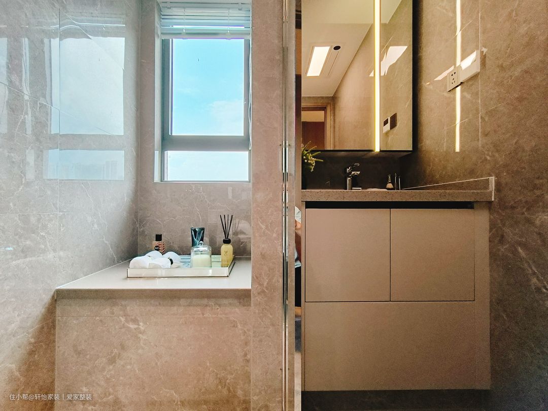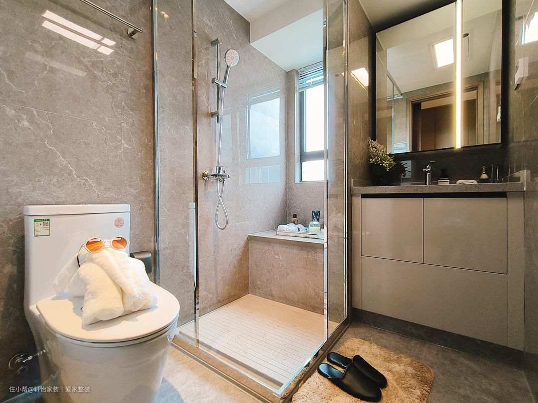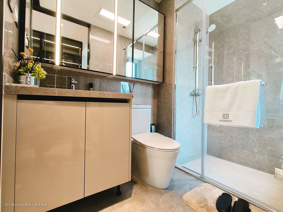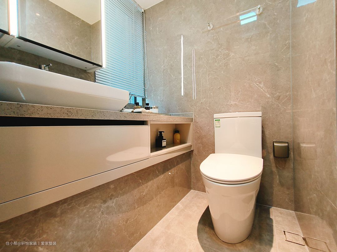 卫生间注重细节和功能性,洗手盆选择一个简洁的陶瓷洗手盆,配备上下储物柜,以最大化地利用空间。现代化的隔断淋浴房,干湿分离更清爽和高效。以中性色为主色调,搭配清晰简洁的线条和质感材料,打造出干净整洁且易于清洁的卫生间空间。 设计师打破传统卫生间一字型的排列方式,将角落空间设计为淋浴区,洗漱区和马桶分别在两侧,给卫生间留出更多空位,用玻璃门进行隔断,避免水流外溅,保持干区干燥。