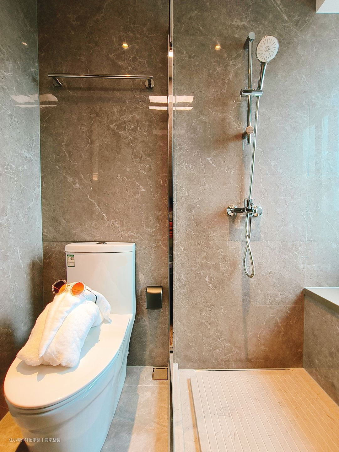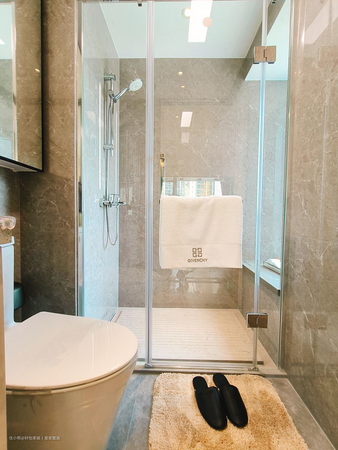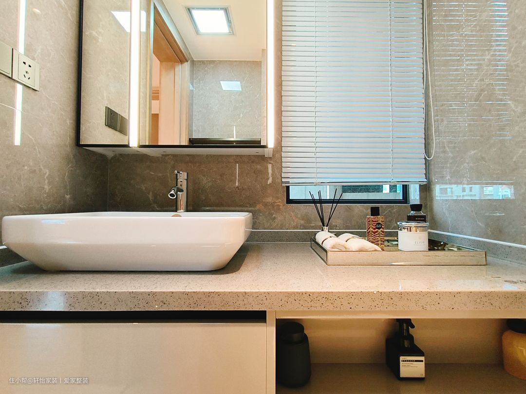 卫生间注重细节和功能性,洗手盆选择一个简洁的陶瓷洗手盆,配备上下储物柜,以最大化地利用空间。现代化的隔断淋浴房,干湿分离更清爽和高效。以中性色为主色调,搭配清晰简洁的线条和质感材料,打造出干净整洁且易于清洁的卫生间空间。 设计师打破传统卫生间一字型的排列方式,将角落空间设计为淋浴区,洗漱区和马桶分别在两侧,给卫生间留出更多空位,用玻璃门进行隔断,避免水流外溅,保持干区干燥。