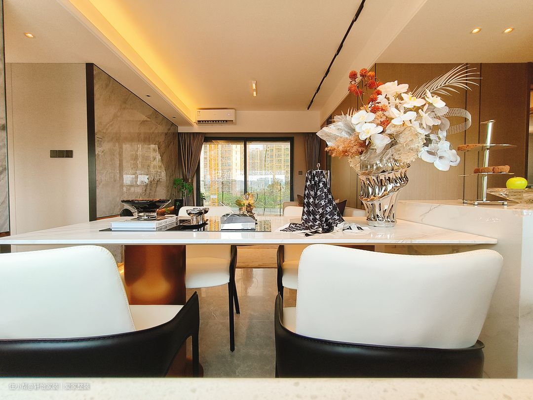 用乳白色餐桌台面更显大,搭配四人餐椅给整个空间带来透亮和显大的视觉感,地面通铺浅色大理石地砖,更具现代温馨质感。最吸引人视线的是餐桌旁的一长条的储物柜,与地板同一色系的简约型收纳柜,既能够容纳屋内的大部分杂物,又能为餐厅起到背景美化的效果,在此种简洁不杂乱的餐厅用餐,肯定很有食欲! 一方小小的岛台,衔接餐桌,在有限空间里,赋予餐厅丰富功能。奶白的岩板餐桌,质感轻盈又浑厚,暖灰色餐椅,背部自带圆润弧度,在直线的世界中,带入一丝柔软。圆环型吊灯点缀上方,铺闪出金色光芒,氛围感up起来!