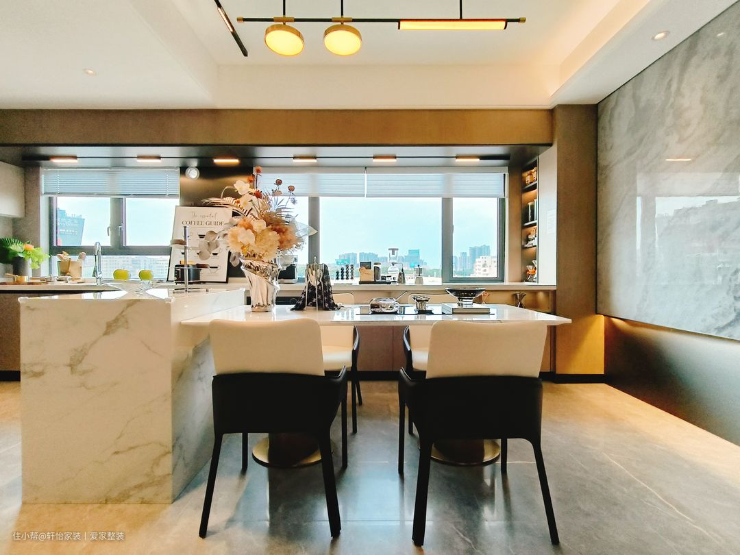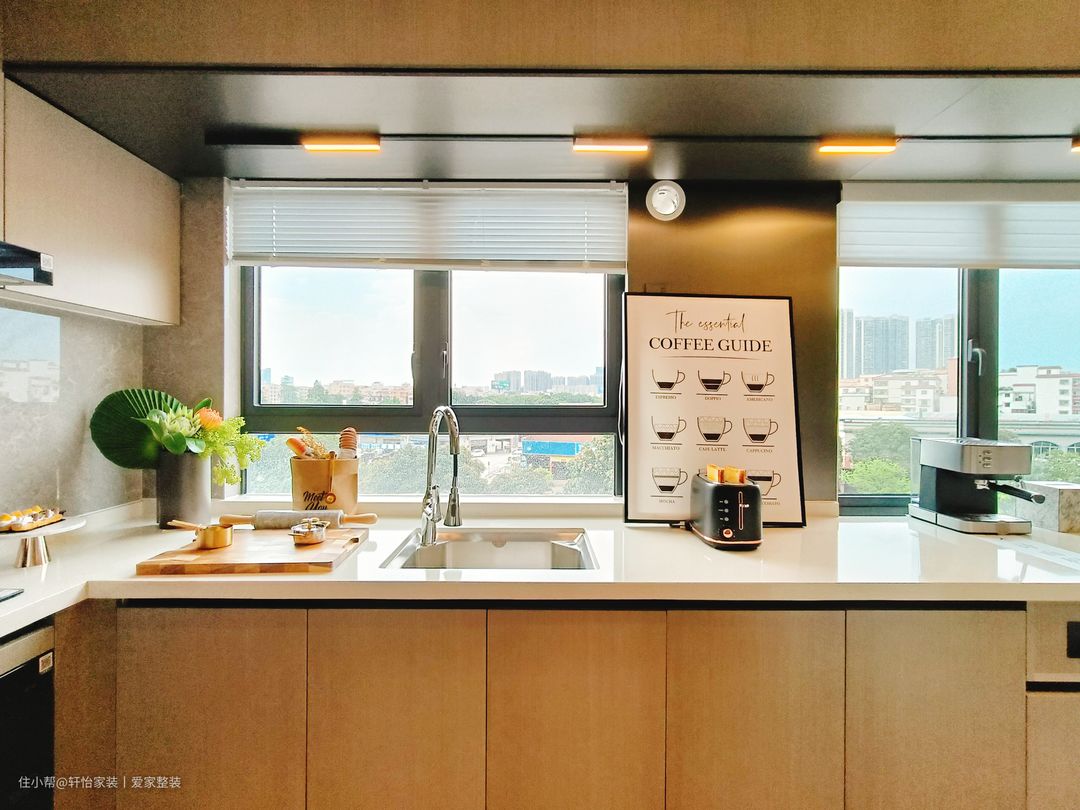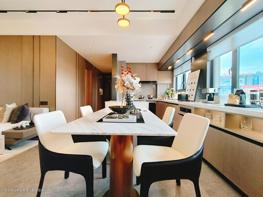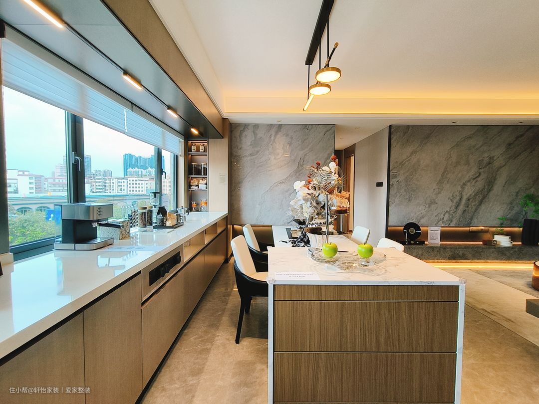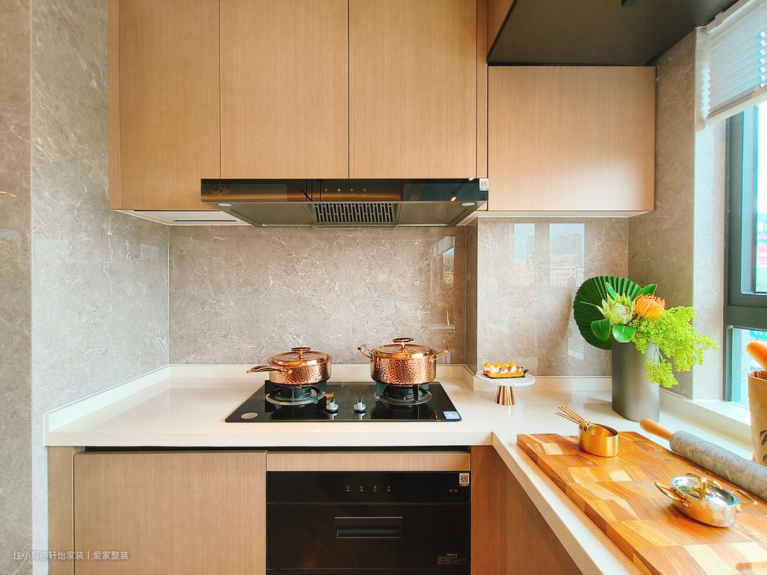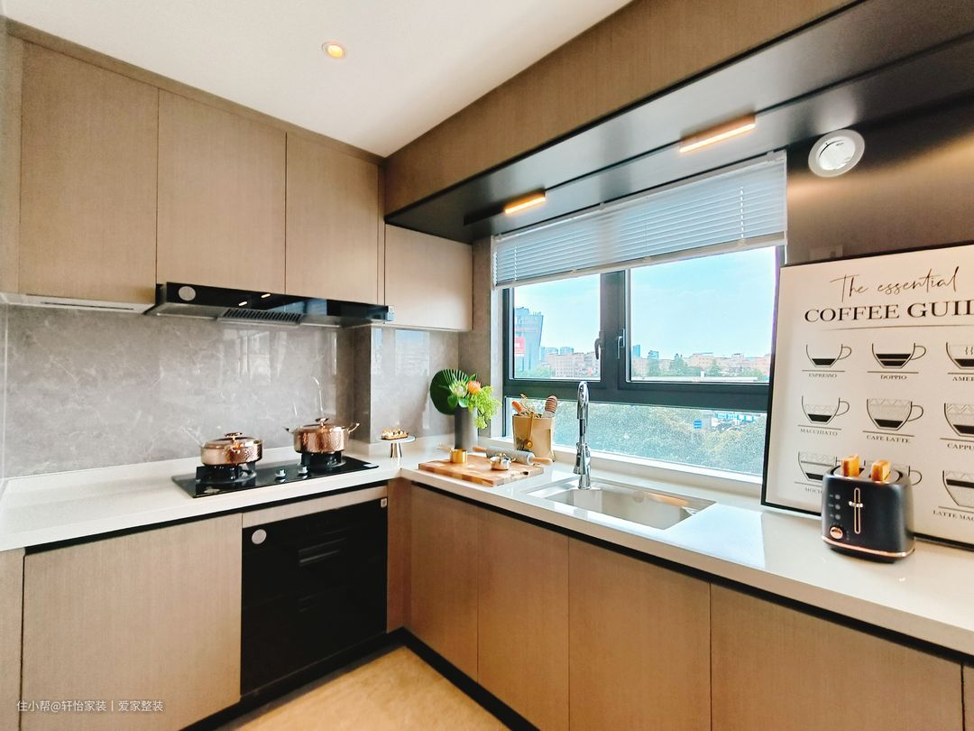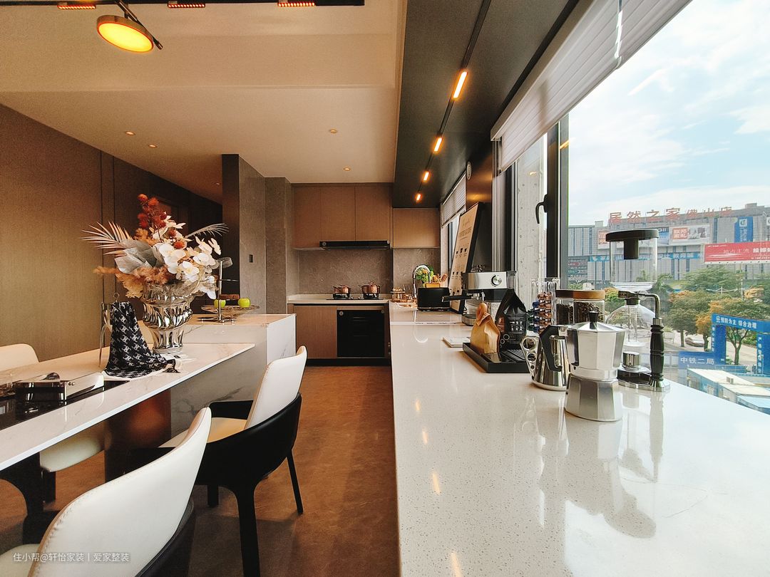 厨房采用一字型布局,量身定制的下厨动线,大大提高烹饪效率,浅灰色连纹瓷砖通铺,黑白家电嵌入点缀,配色出彩,打造高阶时尚,右侧墙体挖空造窗,让原本狭长的空间通透,联通厨房与客厅,将人间烟火与围桌谈笑并置。咖色上下橱柜分别起到收纳电器和隐藏管道的作用,整个空间高级又耐看,吊柜做到顶这样油烟就不会进入缝隙难清理。 厨房是做的半开放式的设计,显得空间大又敞亮,大大的增加了客餐厅的采光,又可以和客餐厅有同个空间感互动,让一个人做饭也不会很落寞。设计师特意将切洗区域设置在窗户旁,和白色亮面墙砖增加亮度,切洗时更加得心应手。