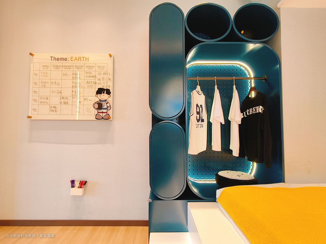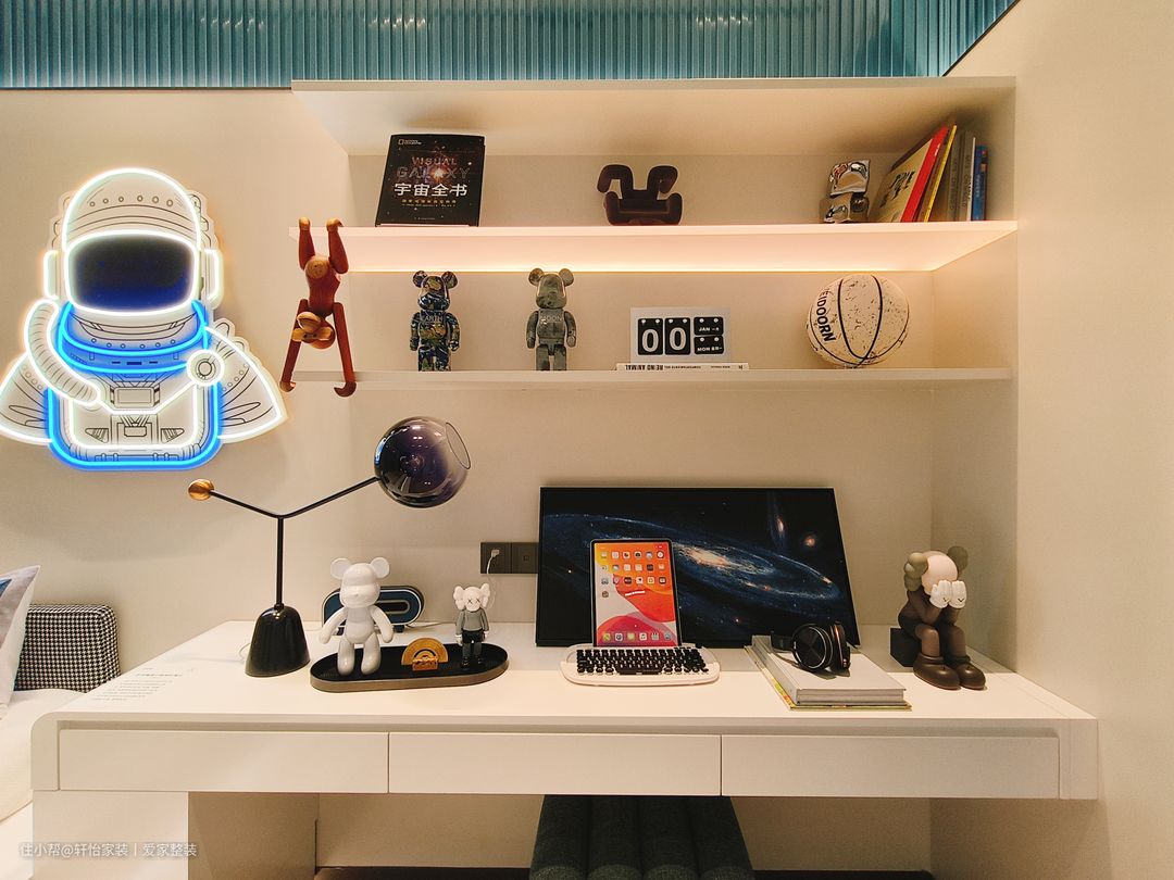 儿童房考虑房间的整体布局和空间需求,采用地台加衣柜的储物设计,满足小朋友玩具多,书籍多的收纳需求。床的底部设计为抽屉式收纳,以便存放小朋友的衣物。衣柜与床紧密相连,作为床尾板的延伸部分。床的设计采用简约风格,配备柔软舒适的床垫和床上用品,为孩子提供一个舒适的睡眠环境。床头的墙面安置孩子最喜欢的宇航员荧光灯挂饰,搭配白色墙面,营造出一个明亮、干净和温馨的环境。 儿童房作为一个多功能的空间,兼顾孩子休息和学习作的需求。通过摆放纯白书桌,提供了一个专门的学习区域,可以用于阅读、学习或进行个人计算机活动,合理利用空间,将其转变为一个适合工作和学习的角落。悬空式隔板置物架放上了孩子喜欢的玩偶摆件,创造趣味空间。 床尾蓝绿色的开放式衣柜以极简设计为理念,蓝绿色门板嵌入灯带,是孩子最喜欢的经典配色,优雅碰撞,让空间尽显精致干练。在左侧封闭式门板的设计上,考虑到了收纳过季衣服和被褥的需求,留出了足够的空间,而右侧开放式的橱柜则可以挂放孩子平时穿的衣物,让小朋友在使用时更加方便!