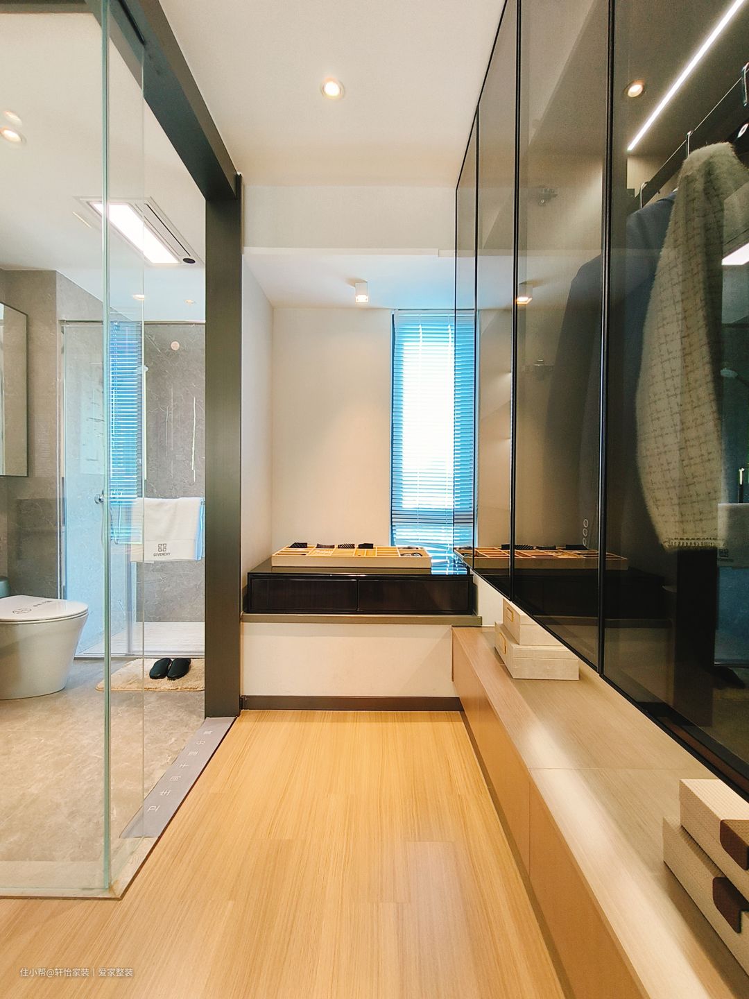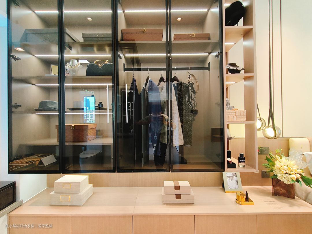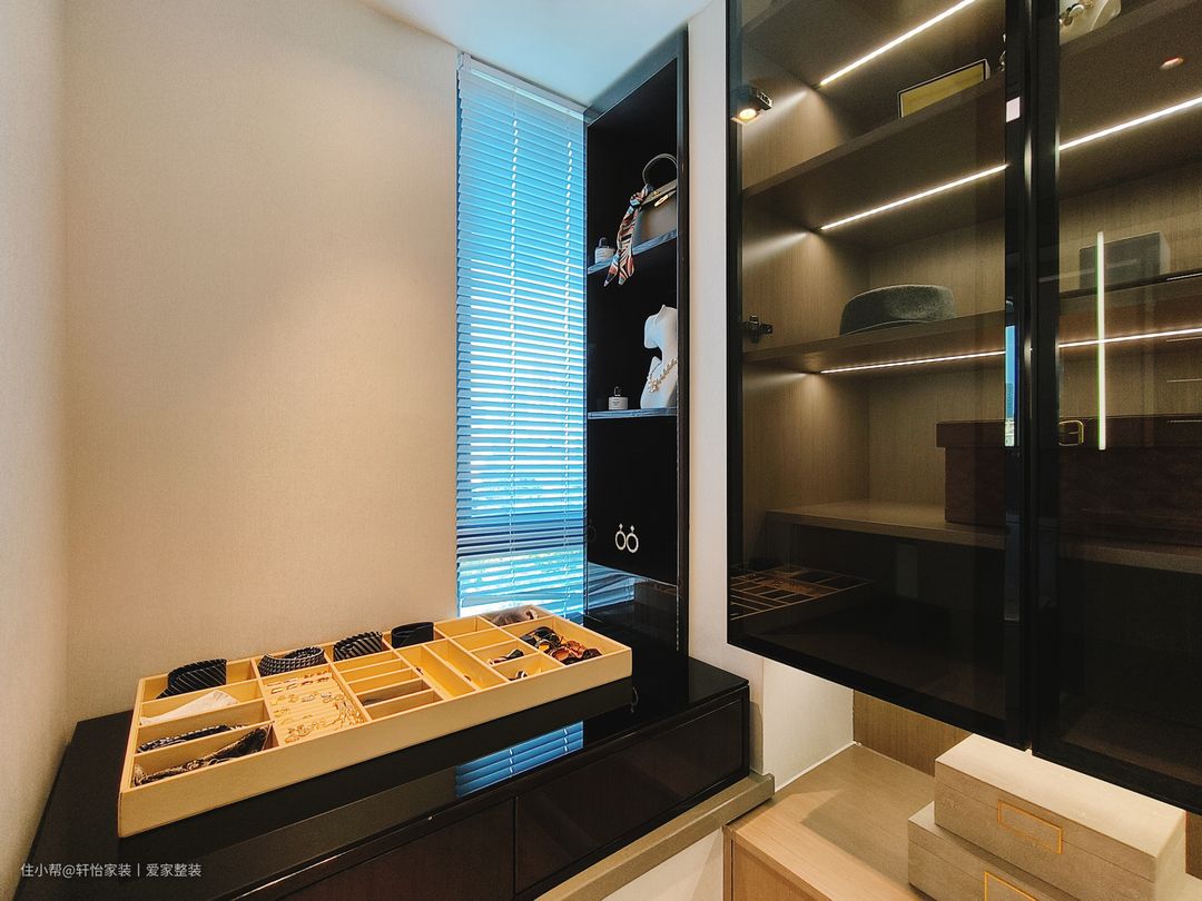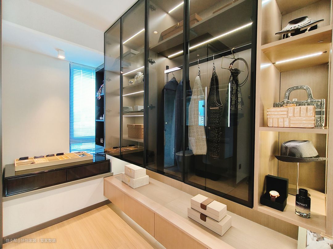 主卧的空间比较大,步入卧室的左侧是衣帽间的设计,屋主衣服比较多,所以就打造成U型的衣帽间来使用,全屋定制的黑色玻璃衣帽间玻璃设计+开放式的原木置物架,起到了空间最大化利用,内部更是规划了悬挂区和叠放区,搭配的隐形式的柜门把手,高级感满满!