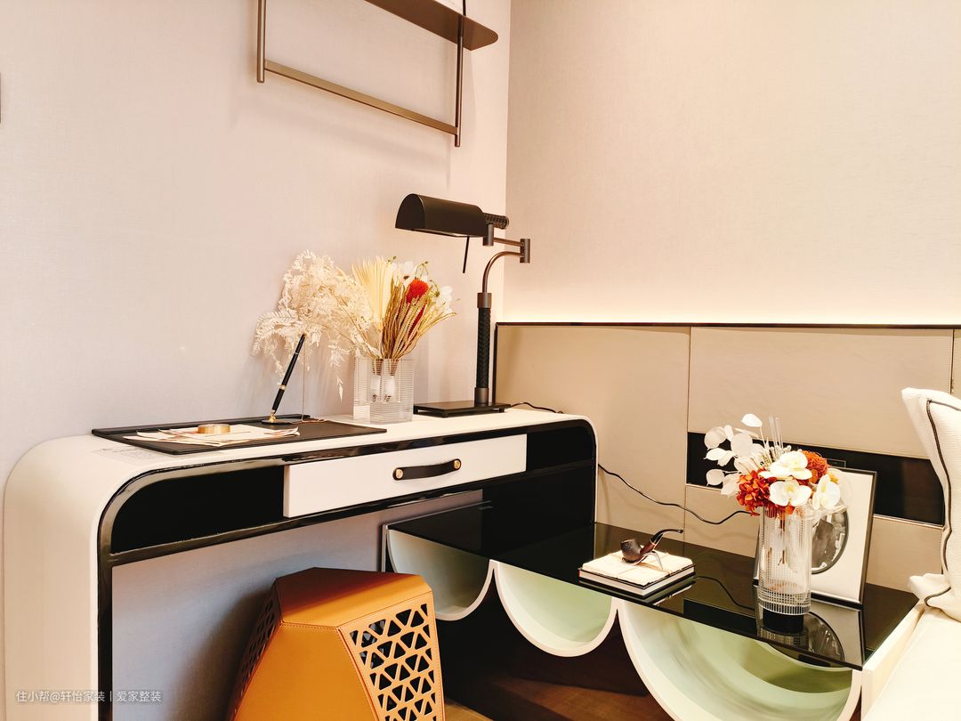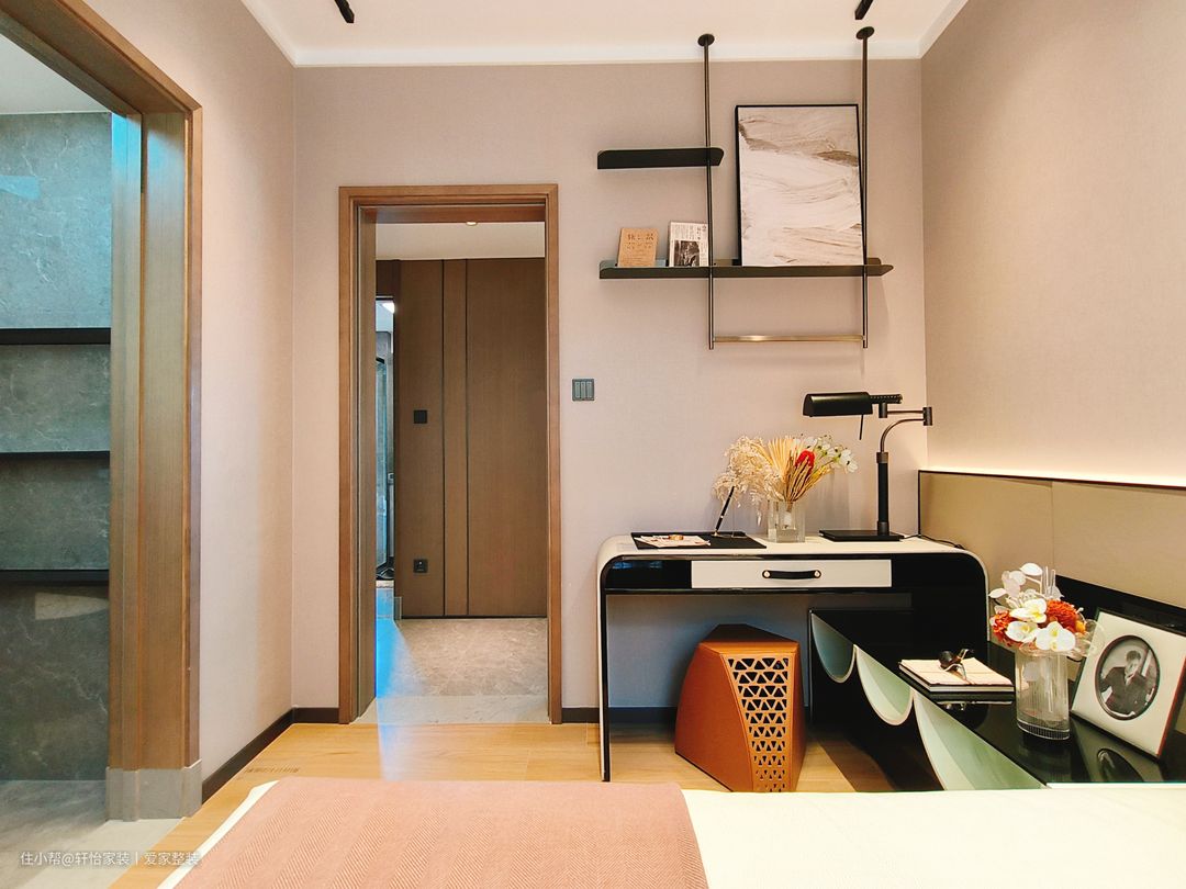 次卧延续主卧的装修风格,双眼皮石膏线吊顶,造型简约好看不压层高,空间不压抑。线条分明有质感的家居,搭配上三种不同式样床品,柔软的质地,营造了舒适的休憩环境。纯色背景墙上挂一色彩装饰画,做了简单的装饰,减少了背景墙的单一性。单边床头柜呈现简单而又不失轻奢感的设计,有丰富的质感和收纳能力,整体素雅耐看又不失温馨。 简约的黑背书桌贴墙放置,不仅有可以储物的功能,还有能够提升空间的统一度,从而达到装饰美化空间的效果。墙上悬空式的置物架,极具创意色彩,将户主喜欢的小玩意摆放布置,也不显得凌乱。