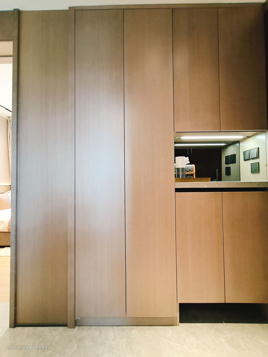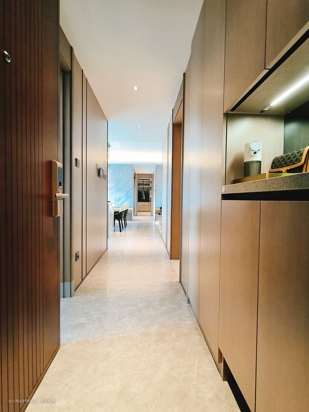 玄关是家居的门面,也是家人和客人进出的必经之处,本期案例从玄关入户处位置很好,一条小过道直接遮挡了客餐厅位置,避免入户将室内一览无遗的尴尬。设计师做了到顶玄关柜,可以收纳一家人的鞋物,镂空凹处位置可以摆放家里的钥匙、香水等小物件,方便平时出门使用。全封闭门板加上留空位置设计,整体呈现出一种不规则中又透露出一种整洁的美。