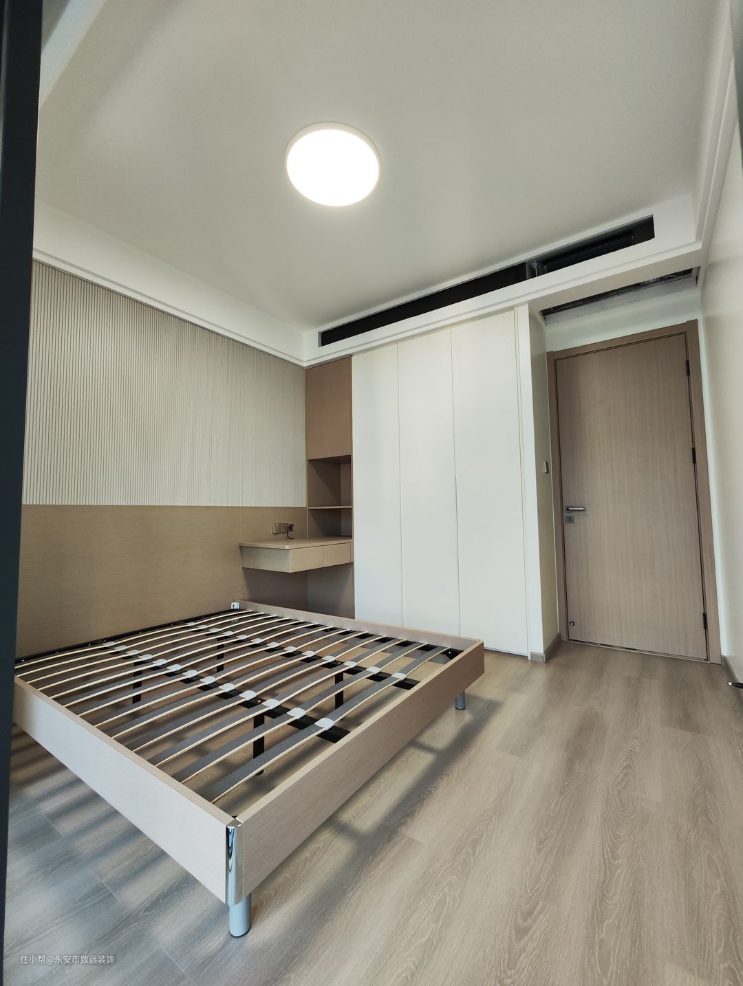 主卧衣柜与书桌连为一体,木地板与床架书桌连为一色。