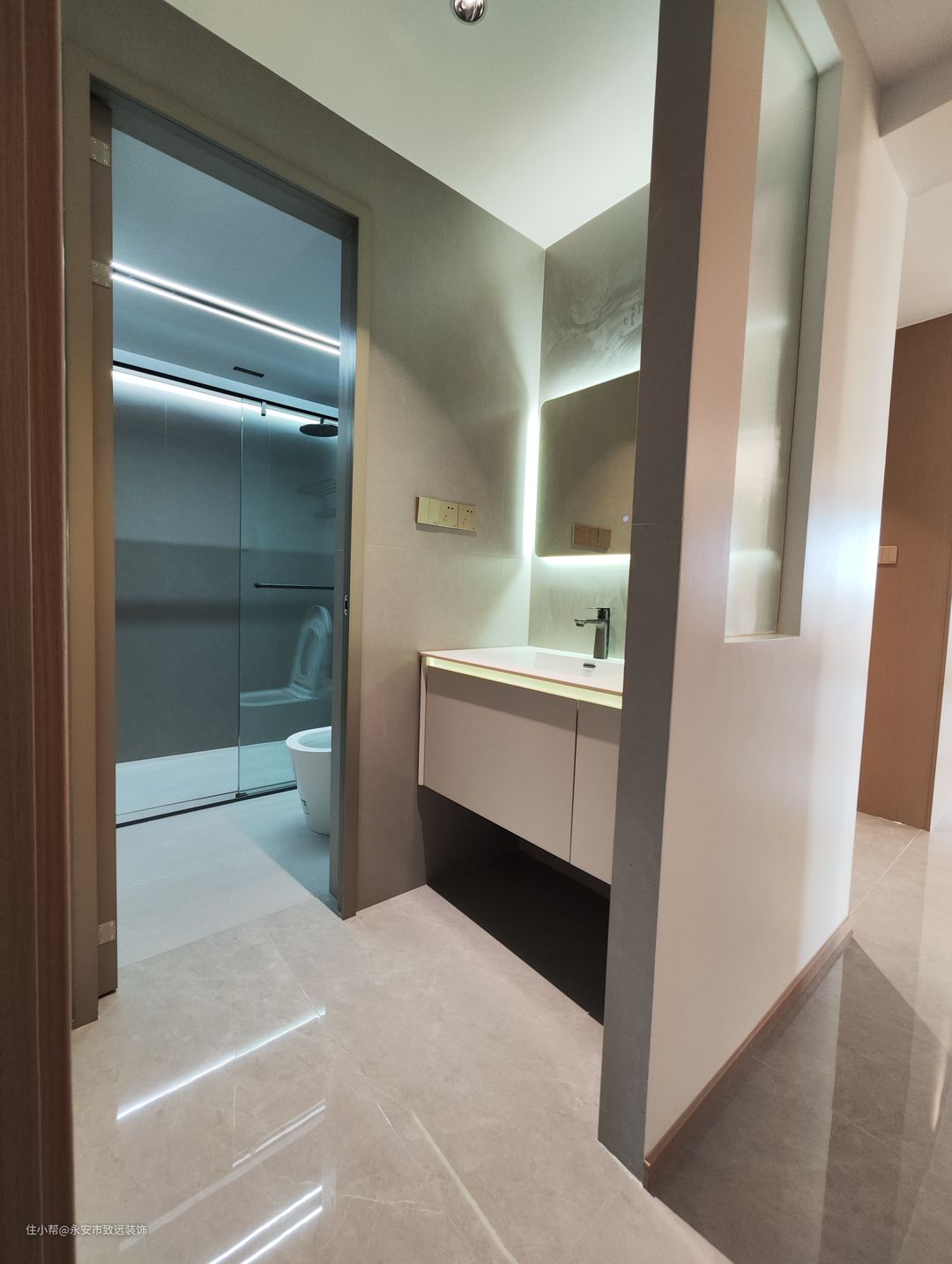 卫生间做干湿分离,干区做了一扇屏风,保护隐私又增加美感,淋浴区地面用同色颗粒防滑地砖,四周做导水槽,兼顾防滑又不破坏整体性,吊顶做蜂窝大板搭配线型灯,增加现代感。