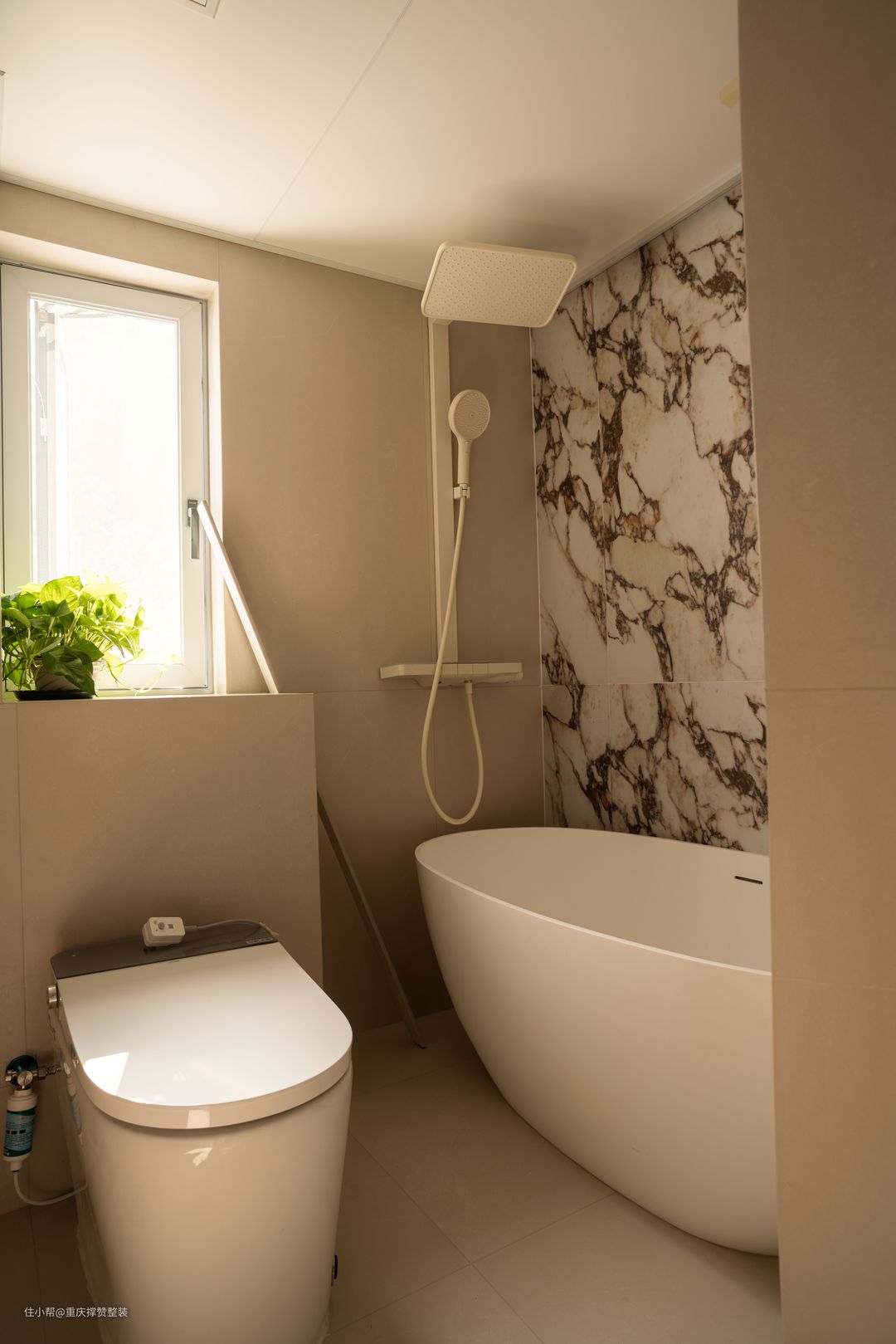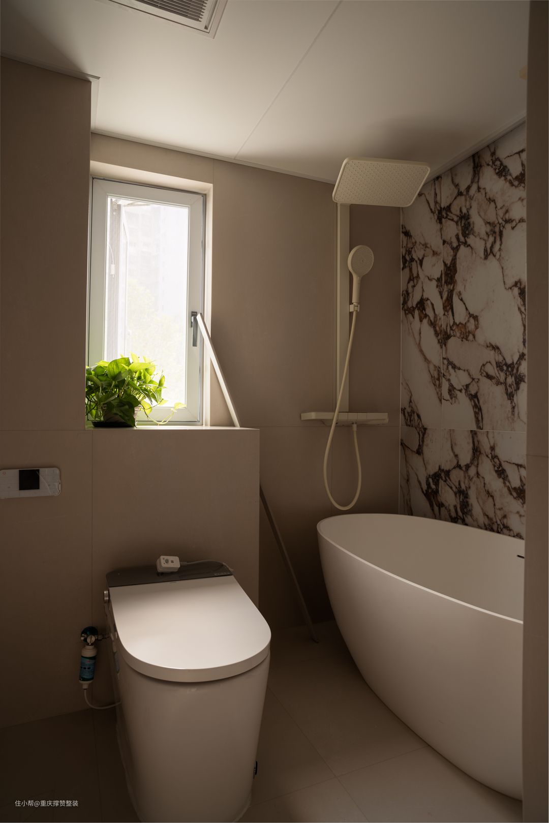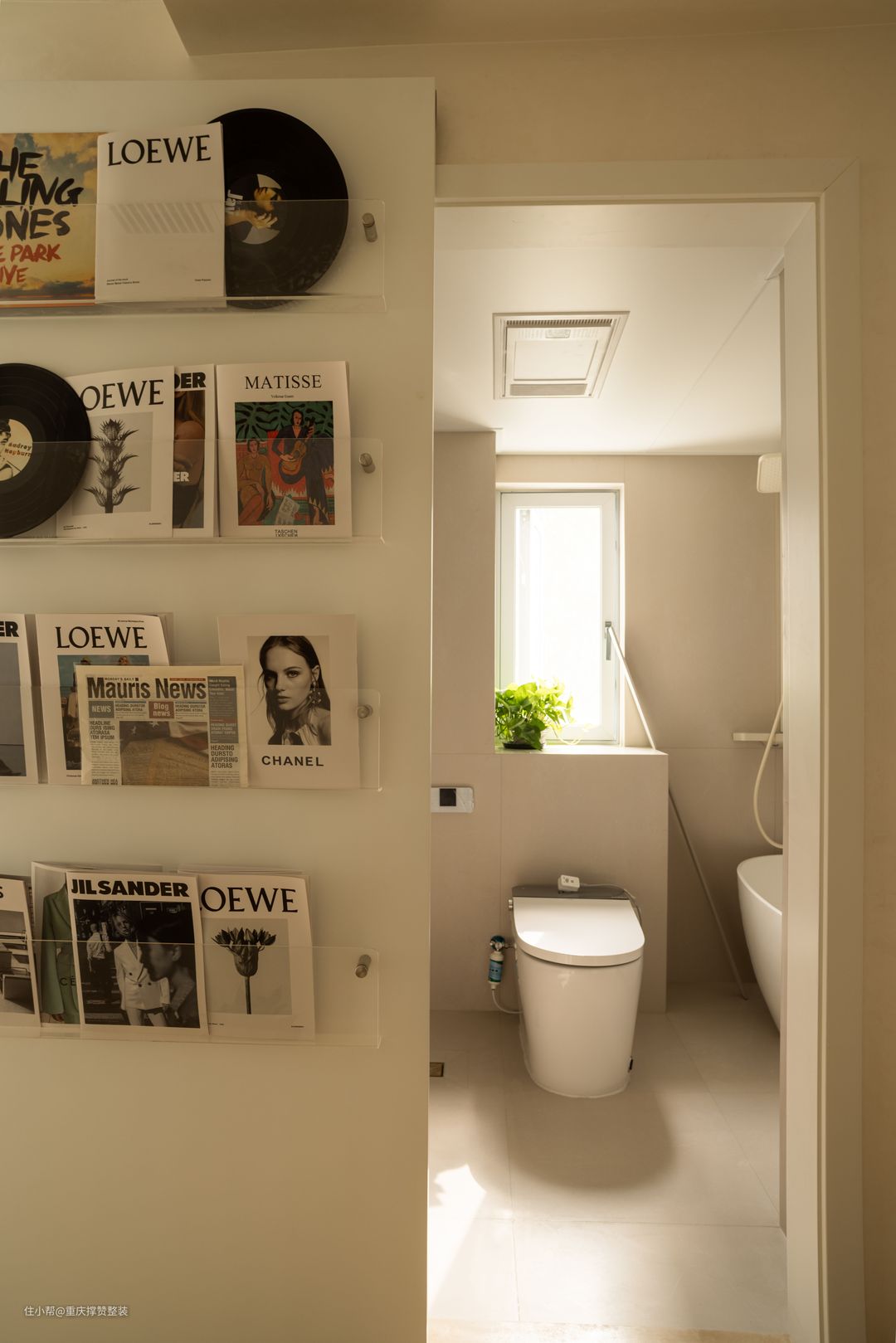 推开这个杂志墙隐形门就来到了卫浴室,该卫浴室的配置十分齐全,整个空间用的柔光砖,质感十足。 浴缸这边做了一个花色砖的背景墙,沐浴时也别有氛围感。 结束完一天的工作后,拉上门,在这里独享放松时光。