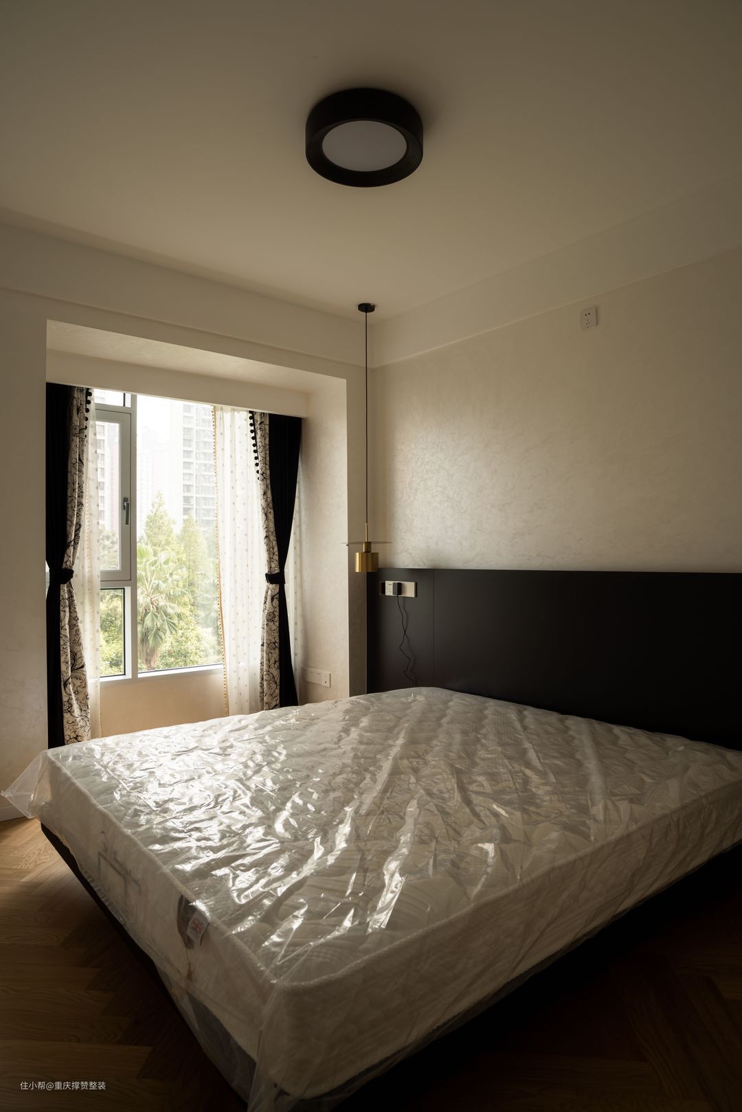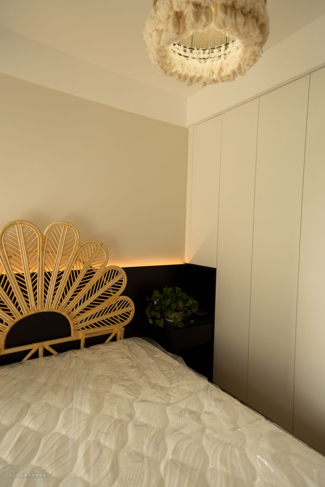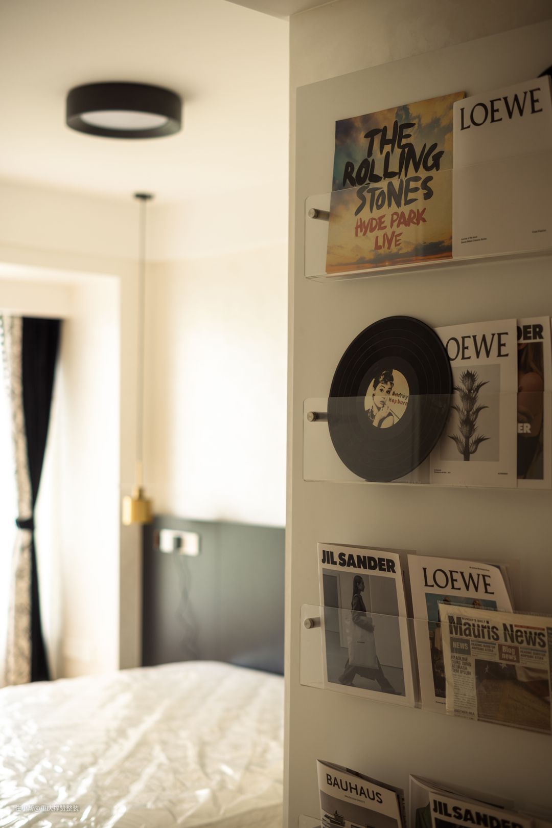 本案卧室在设计上花了一些小心思,推开门可以看到是一面杂志墙,实际是一个隐藏门,这面杂志墙用作主卧和卫生间的一个分隔。 主卧和次卧的面积不大,满足了业主的一个基本需求,营造放松、舒适的休憩环境,灯具的设计也是精致且高级。