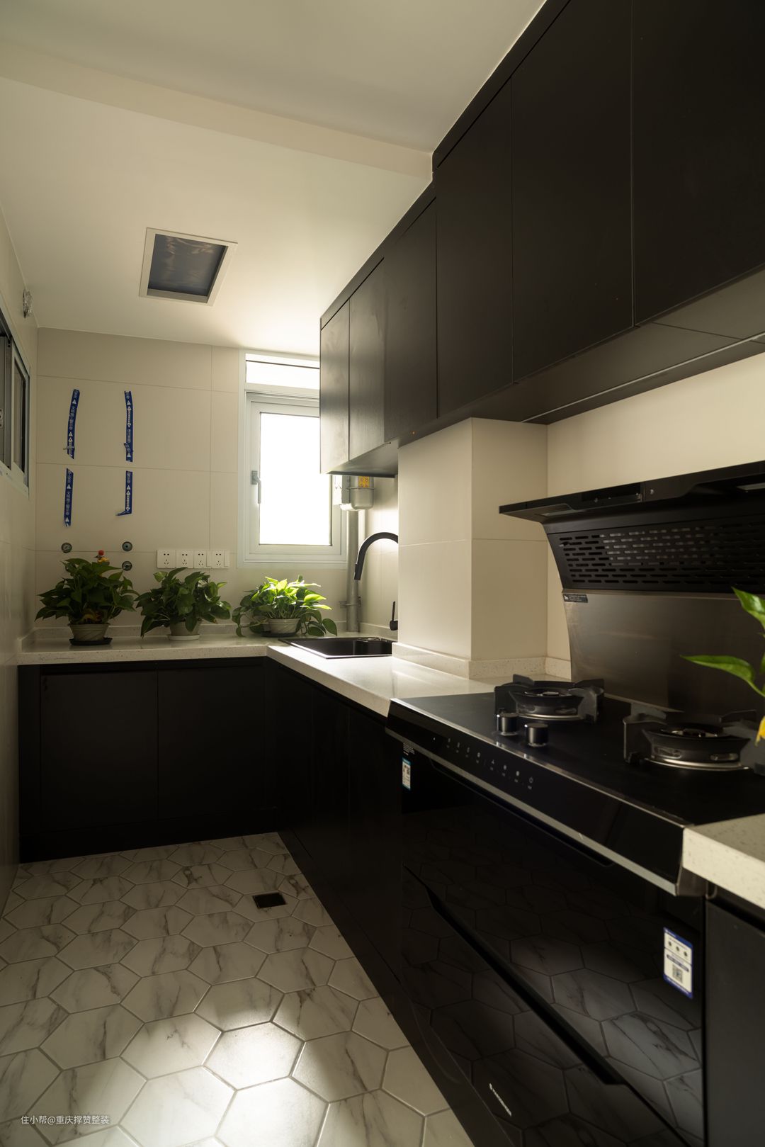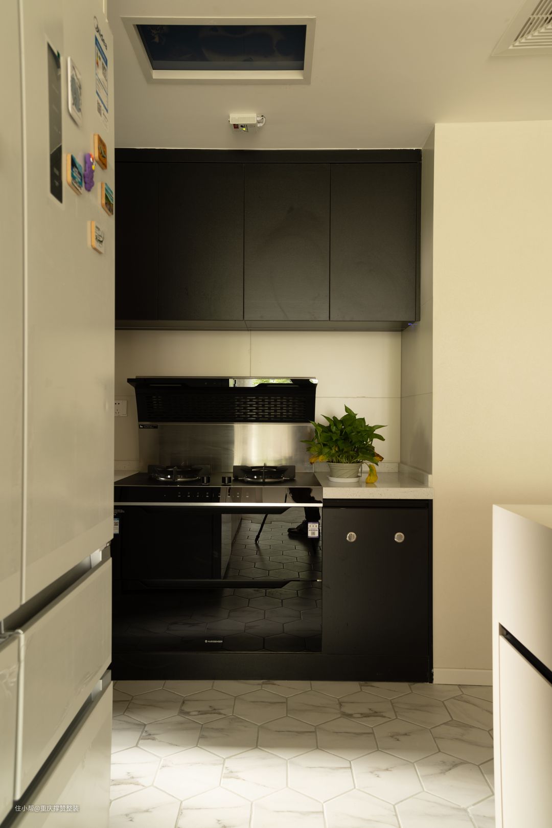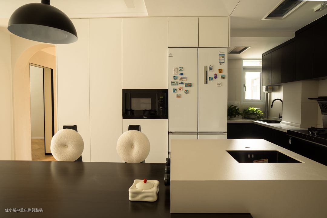 半开放式厨房既保留了厨房本身具有的特点,又能避免不同类型厨房的缺点,兼具功能性、互动性和通透性。 整体是黑白配色,显得更加高级,灯具选择的是天空灯,更能还原自然光线。