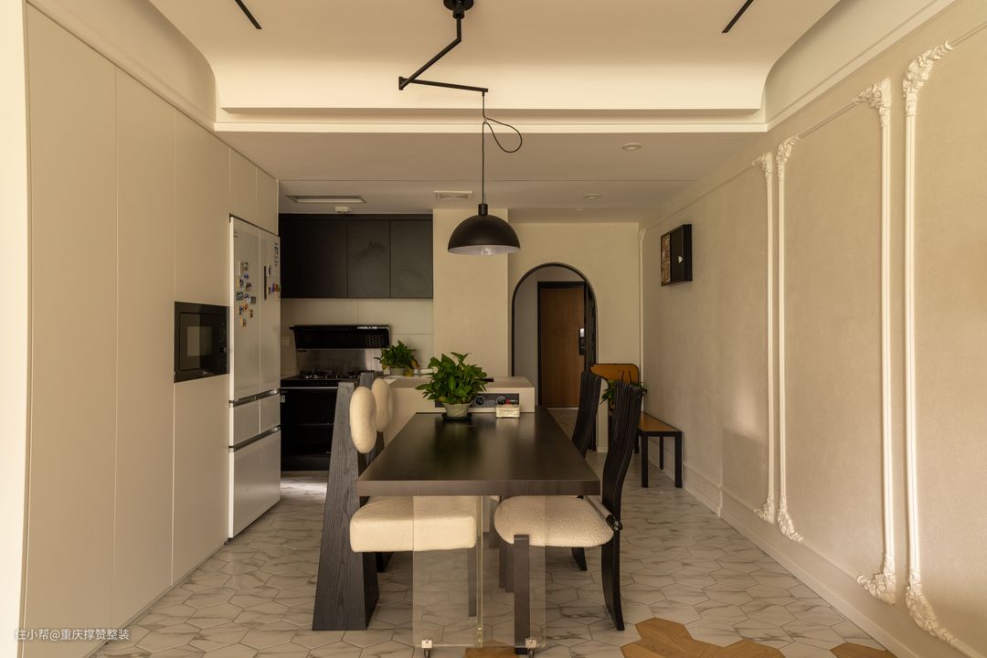 用餐区域采用的是六角砖,客厅区域是木地板不仅是做到了一个分隔作用,视觉上也显得十分特别。 在桌椅的一侧设计了一面储物墙,将冰箱和烤箱做了一个嵌入式,不仅节约了空间,也使整个空间看起来更加整洁,富有小心机。