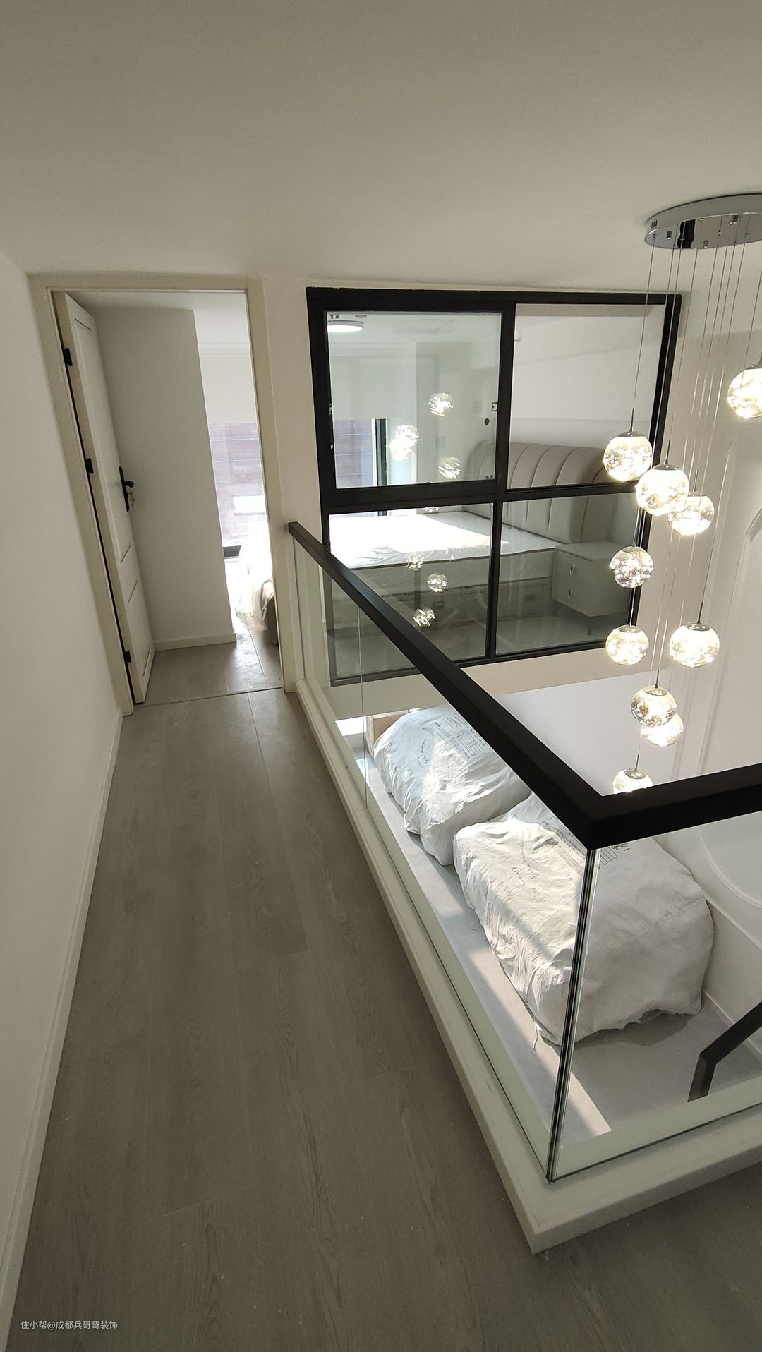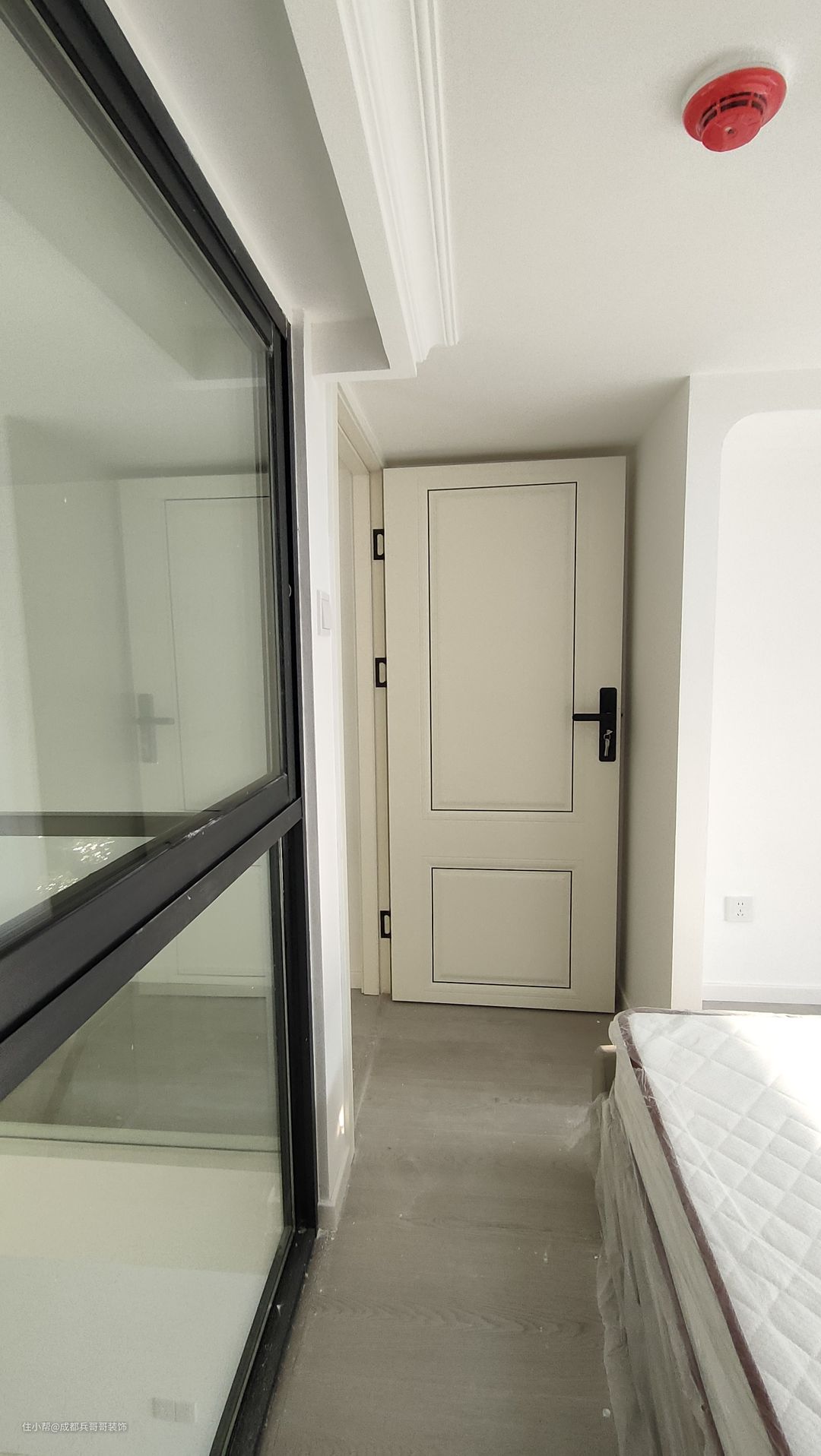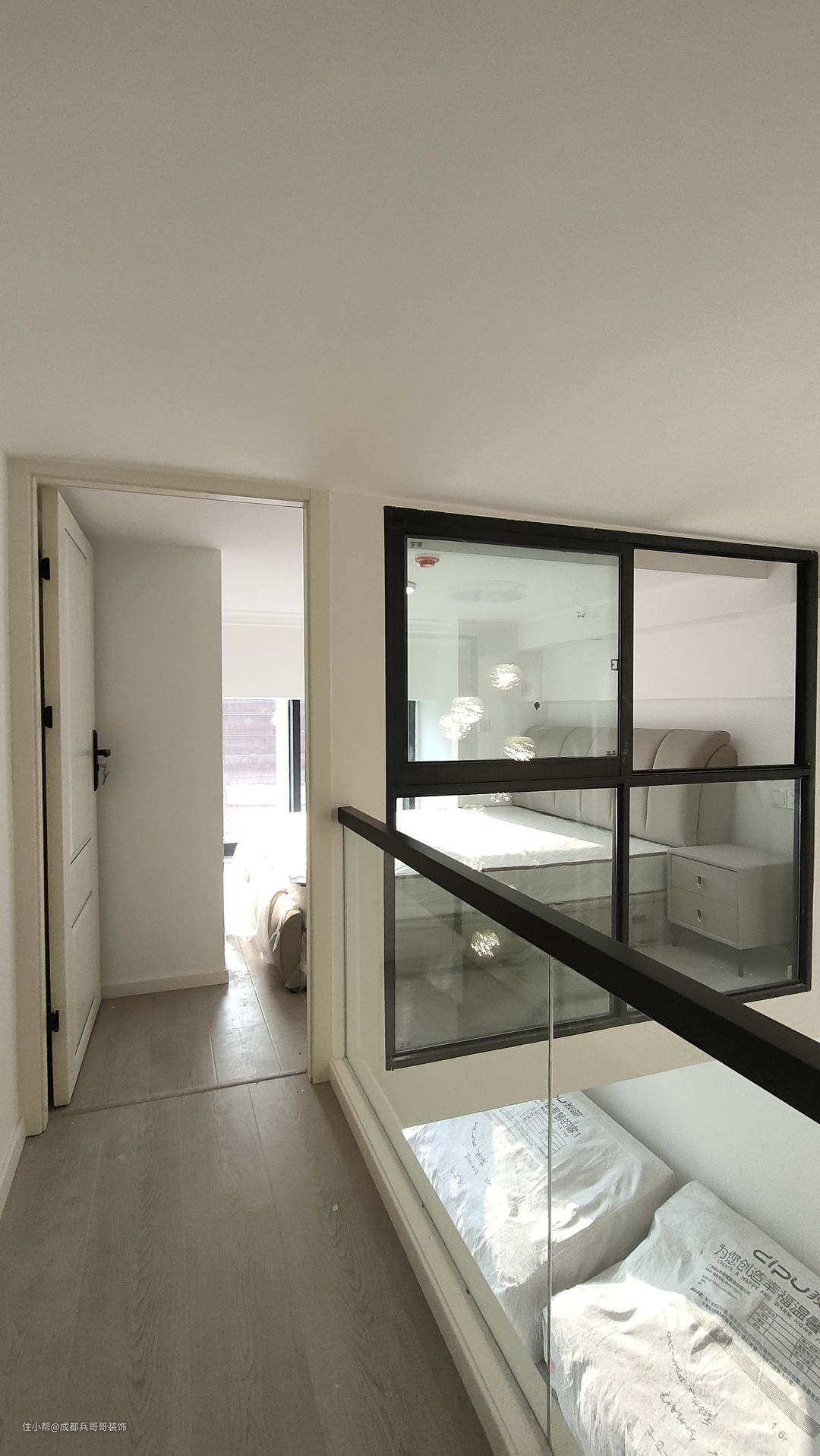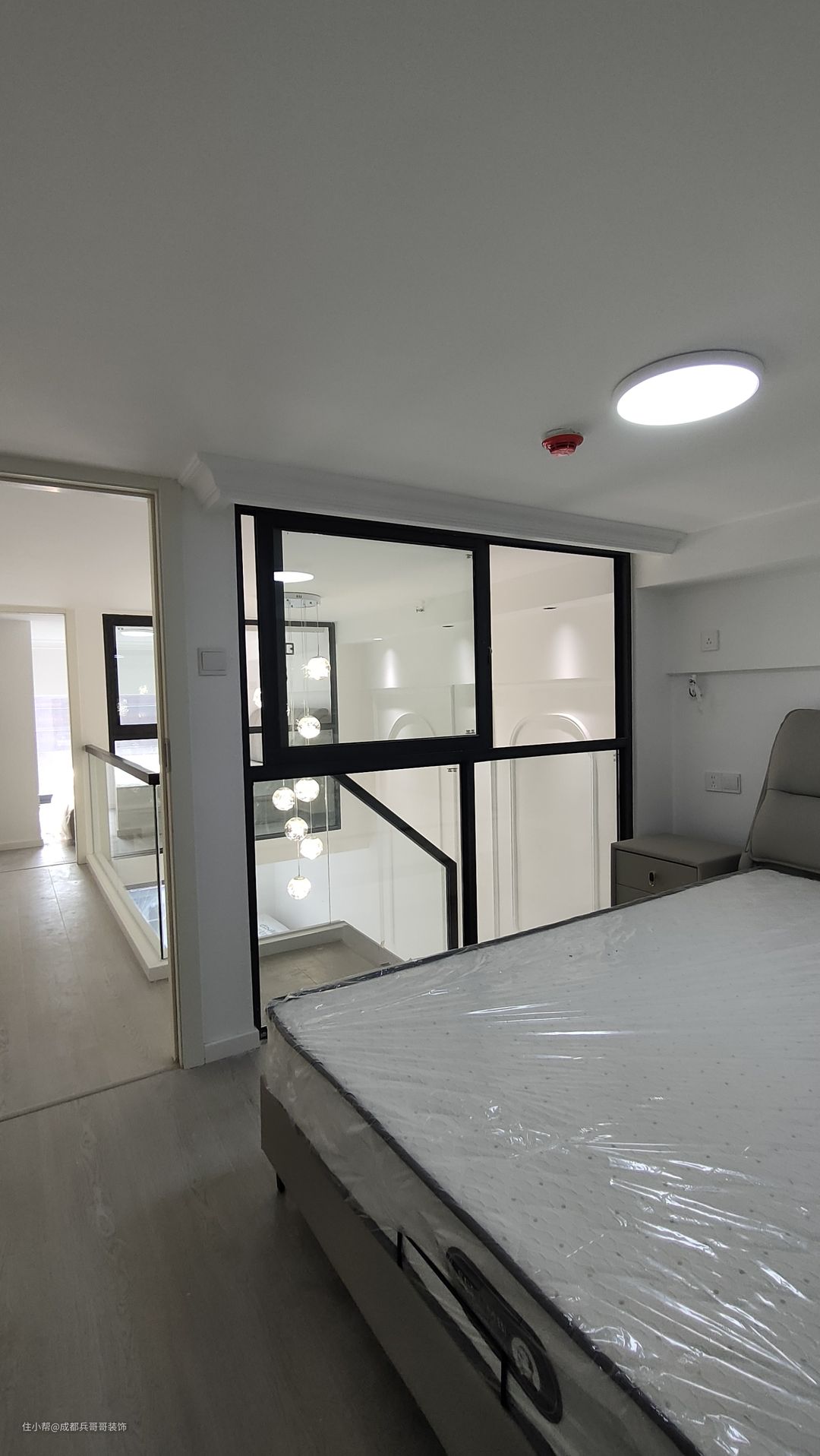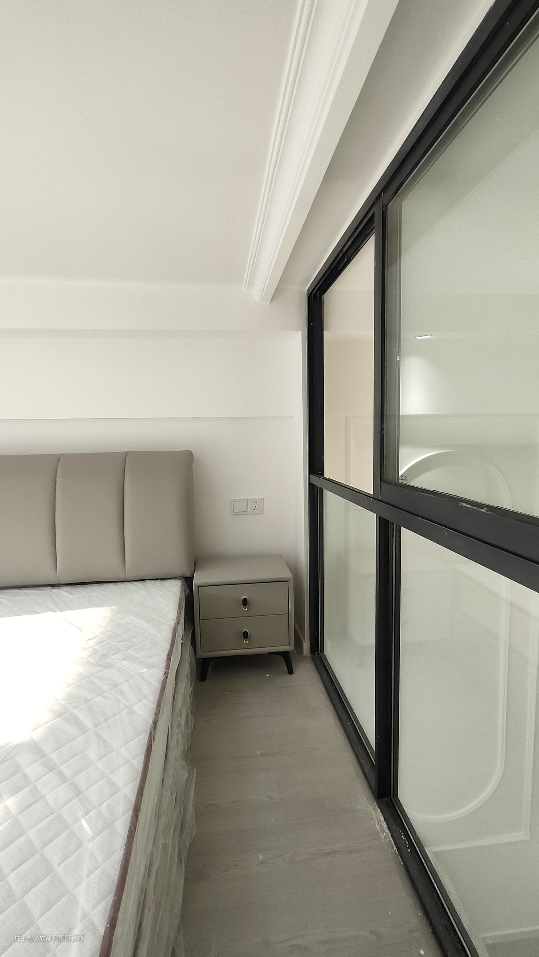二楼次卧,同样是1米8的床、床头柜、拱形门洞衣柜区,卧室侧边推拉窗设计。 公寓整体风格简约干净,白色乳胶漆+黑色扶手+黑色玻璃窗户边框,色彩简单自然,舒适温馨。