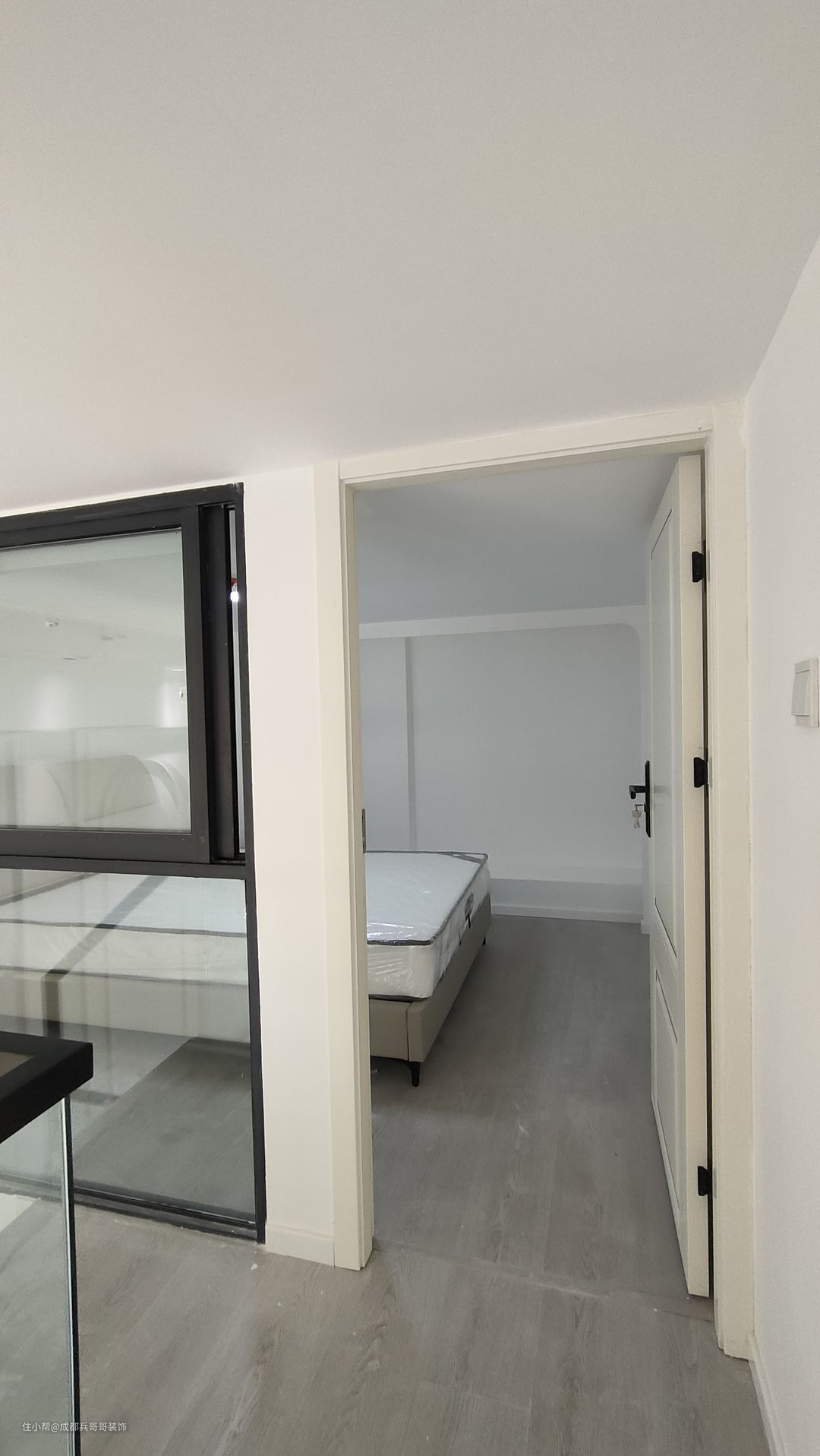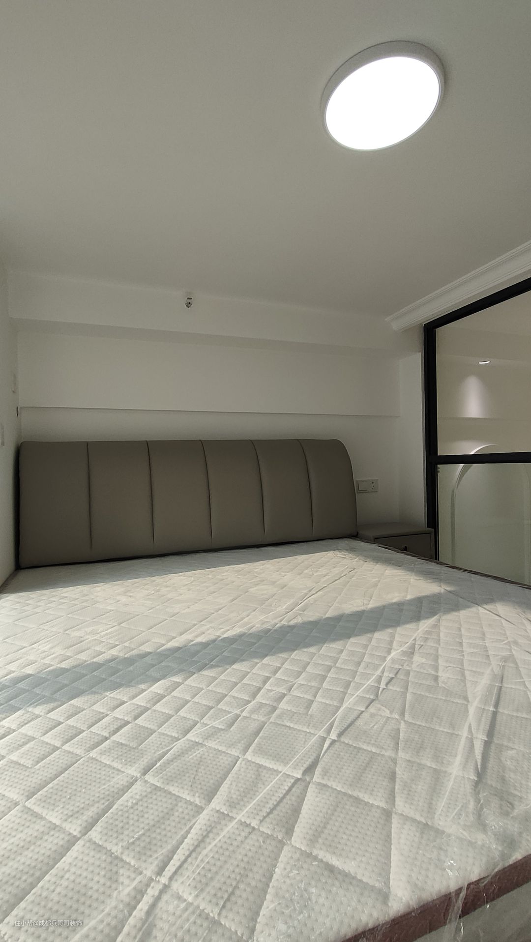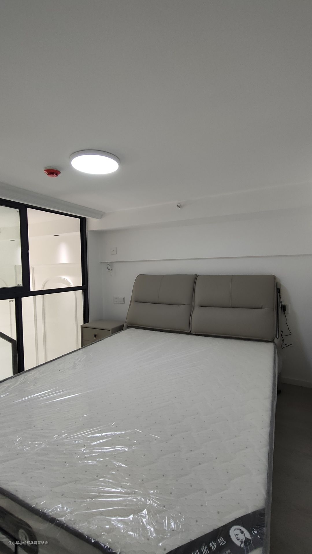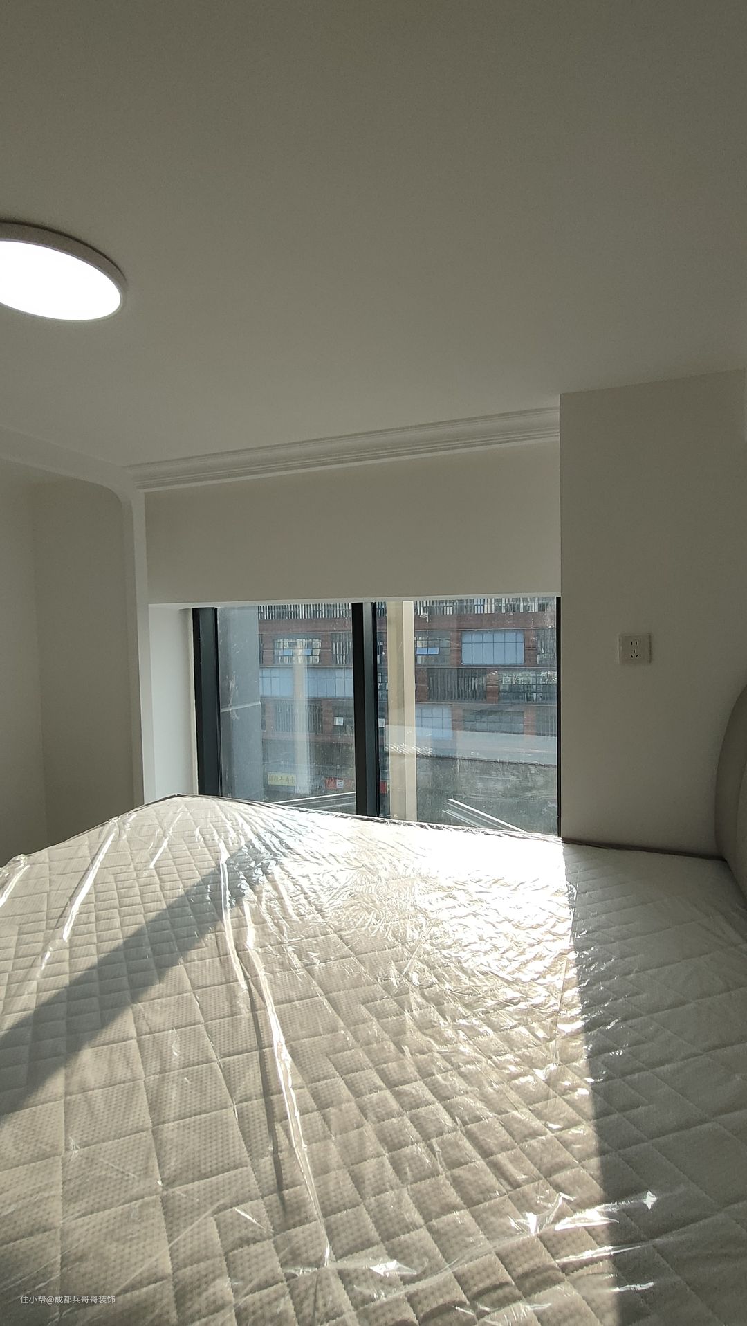 二楼次卧,同样是1米8的床、床头柜、拱形门洞衣柜区,卧室侧边推拉窗设计。 公寓整体风格简约干净,白色乳胶漆+黑色扶手+黑色玻璃窗户边框,色彩简单自然,舒适温馨。