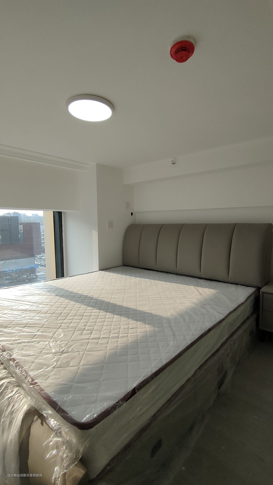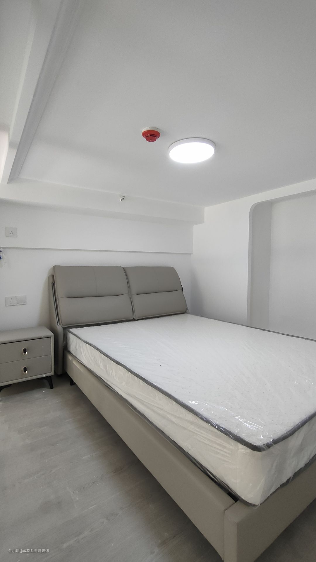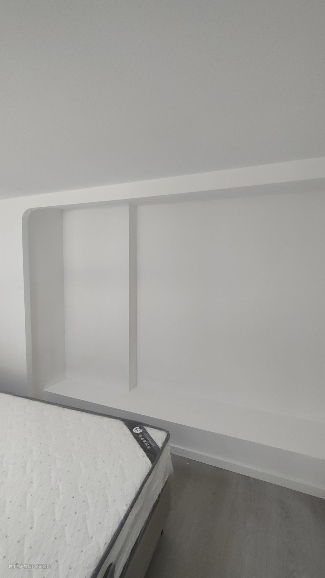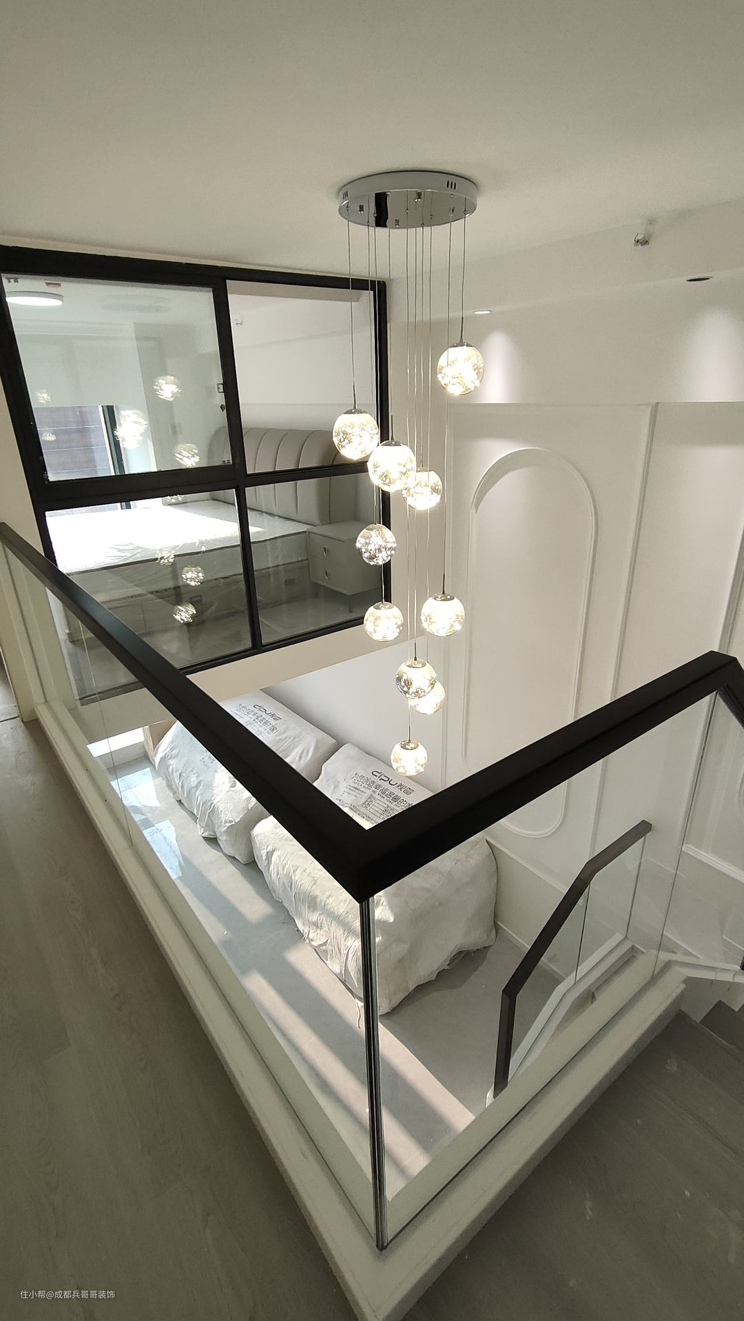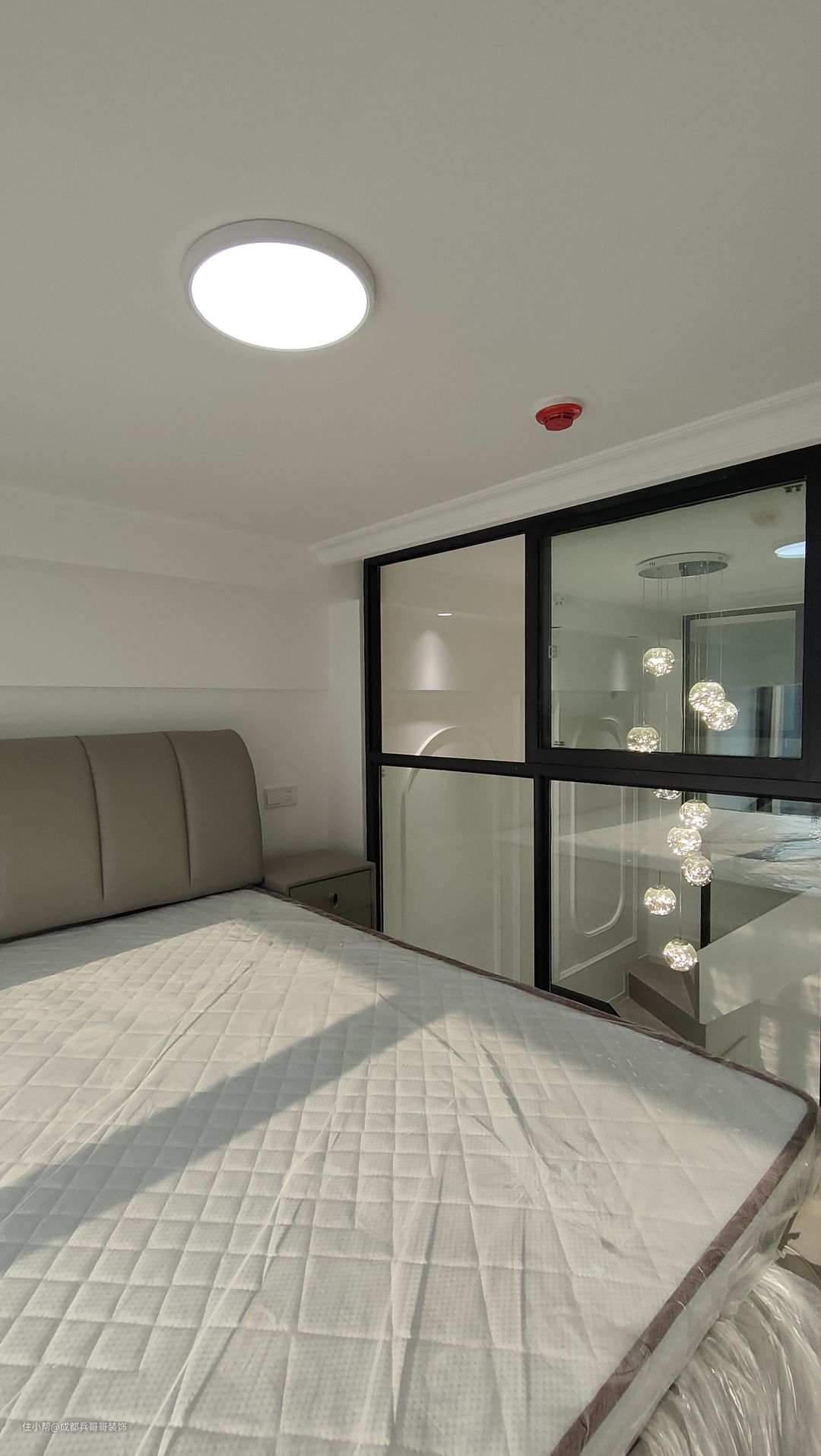 二楼次卧,同样是1米8的床、床头柜、拱形门洞衣柜区,卧室侧边推拉窗设计。 公寓整体风格简约干净,白色乳胶漆+黑色扶手+黑色玻璃窗户边框,色彩简单自然,舒适温馨。