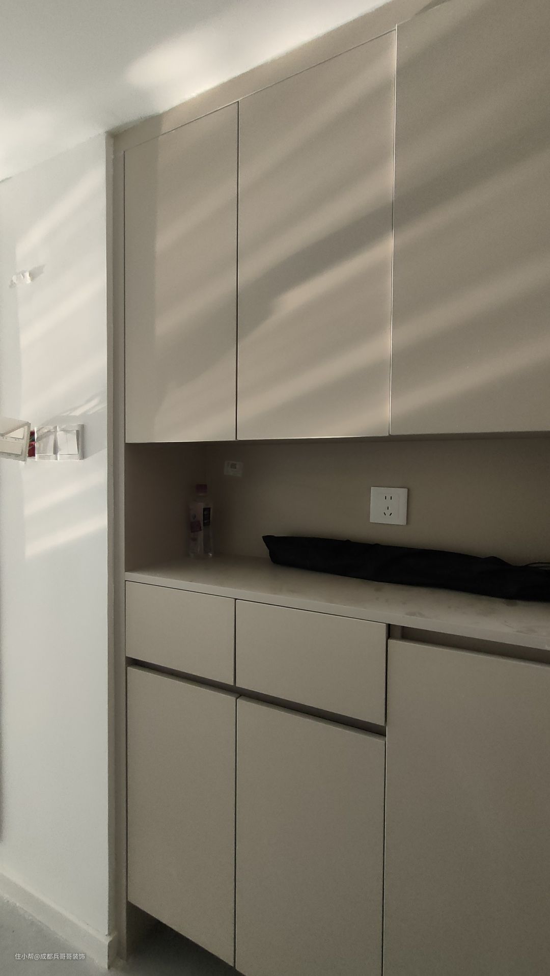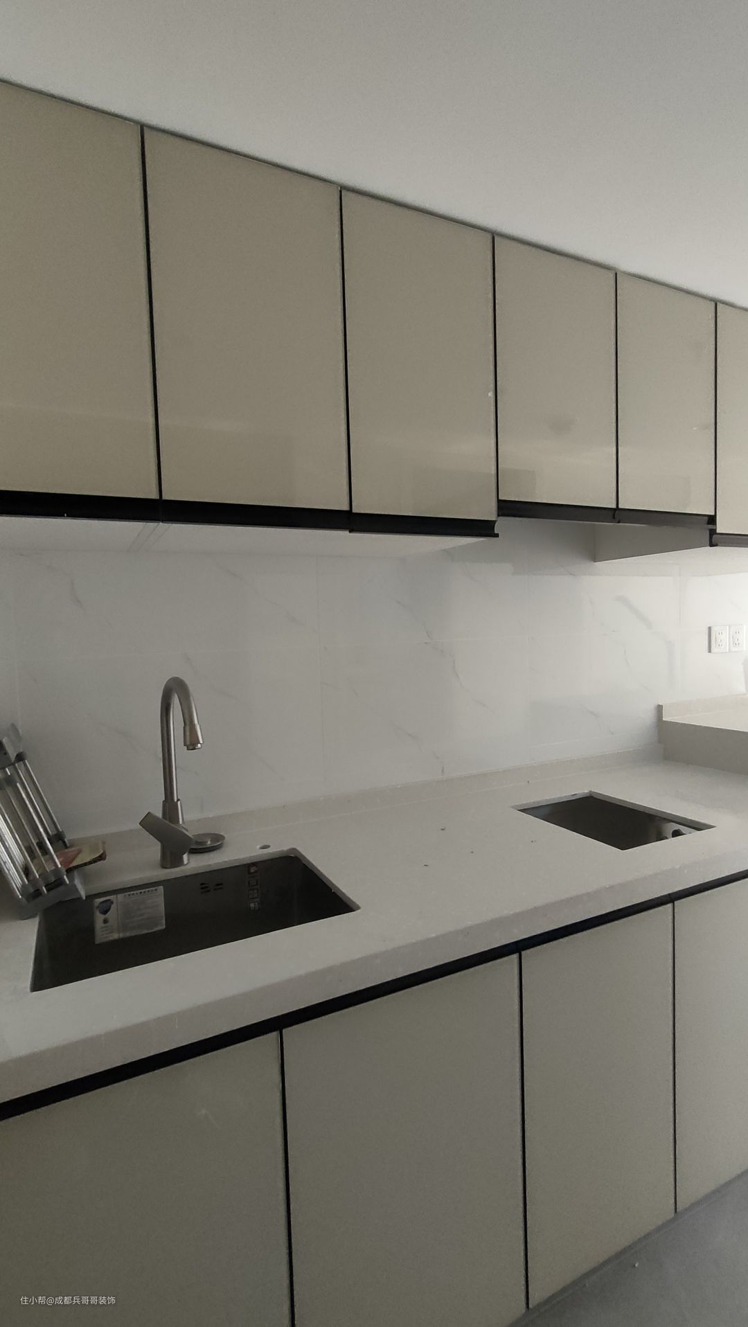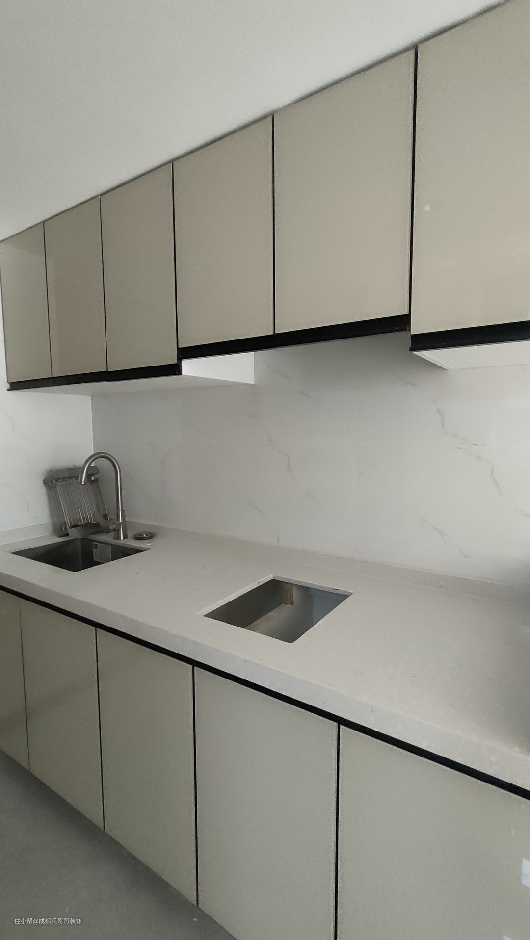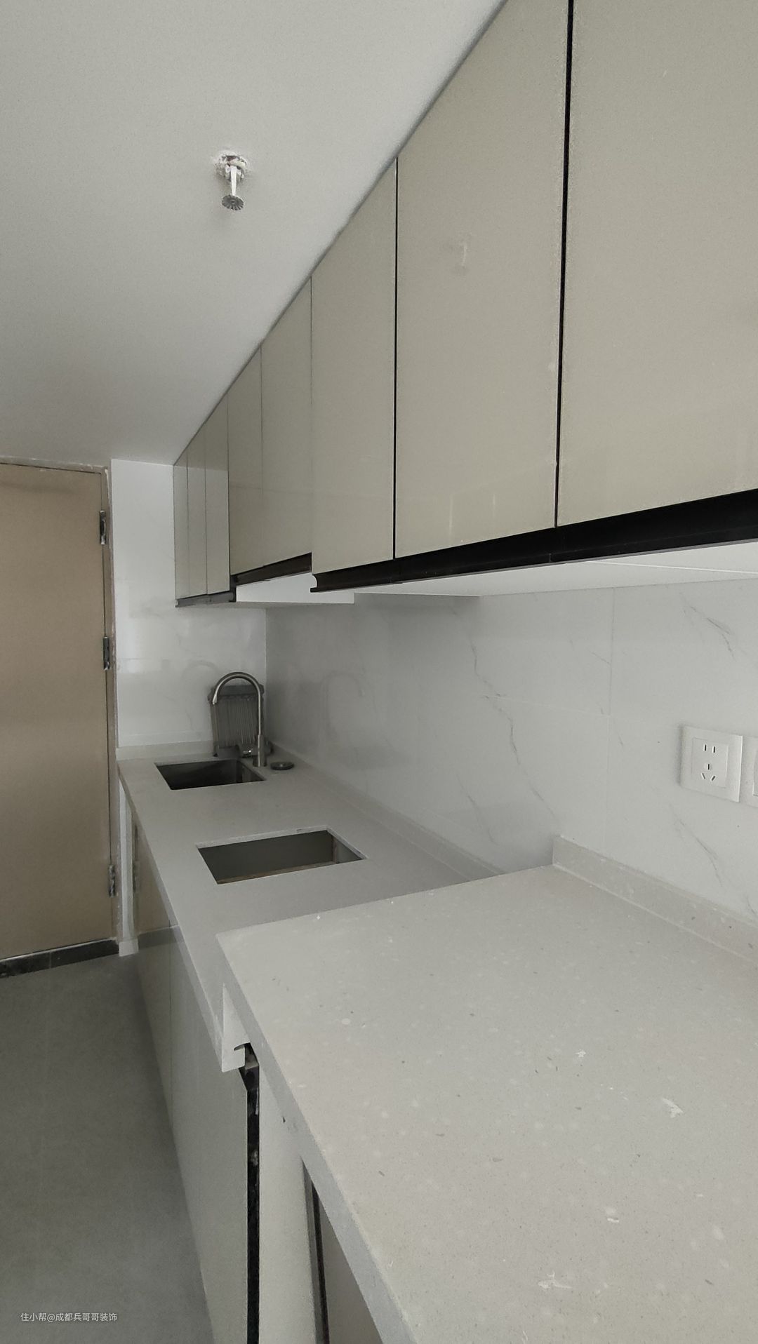 厨房,一字形开放式设计,上方一整排吊柜+一整排地柜,中间做饭的区域,地柜还预留了嵌入式洗衣机的位置,整体来说储物收纳功能足够。