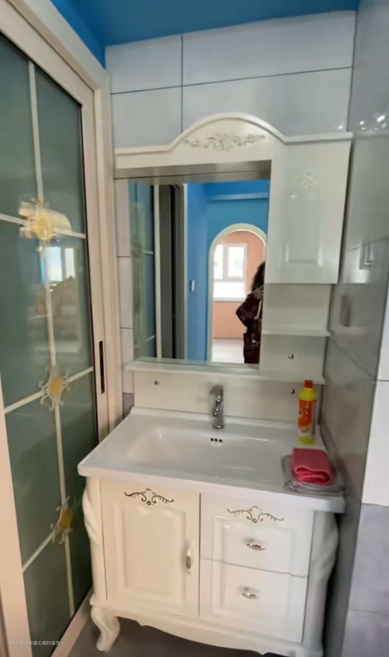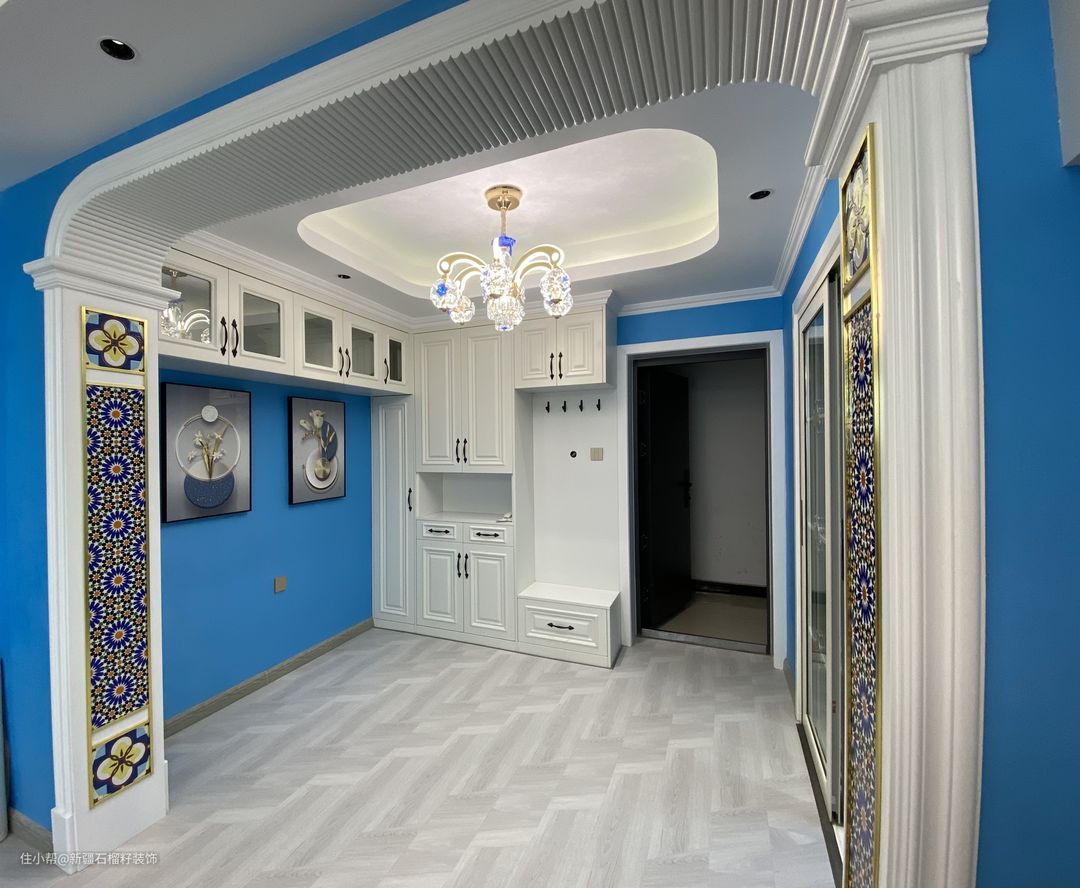 进门的位置空间宽阔,壁柜设计优雅,蓝白色为主的墙壁给人一种神秘的欧洲古堡的即视感。