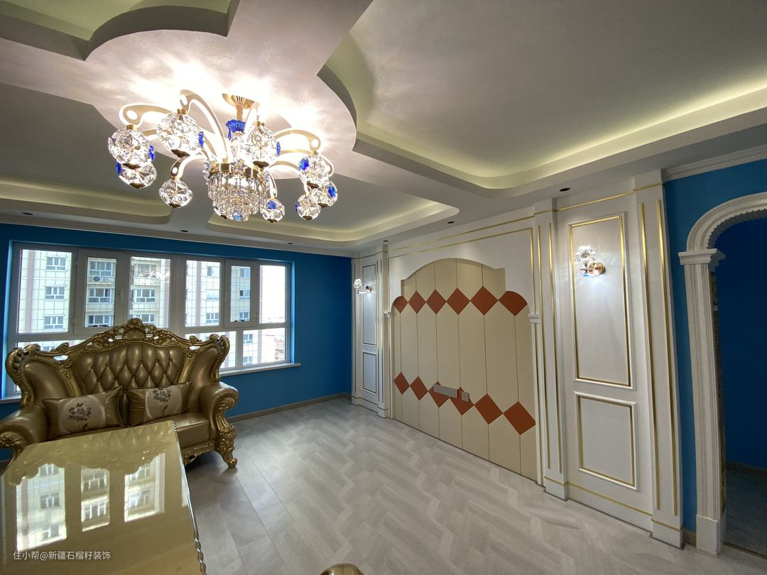 简单的电视背景墙,配一盏大气的吊灯、欧式吊顶,哪怕是黑夜降临,也会感受到纯纯的欧式贵族气息。