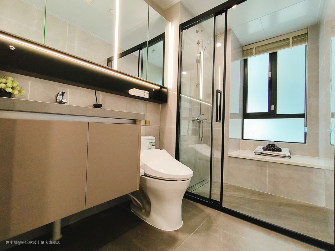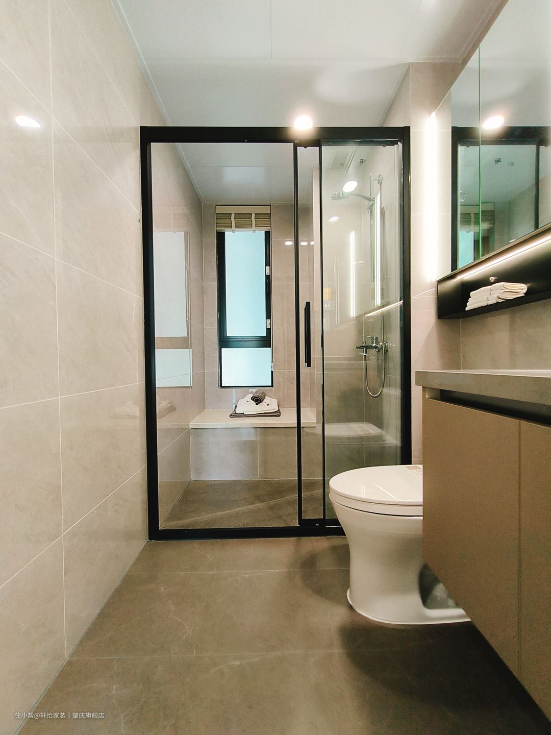 客卫整体以淡雅的灰色瓷砖通铺,使得整个空间显干净明亮。而卫生里侧则是淋浴的位置,采用了二分离的设计布局,淋浴区以一透明玻璃门隔开,有效保障沐浴水滴不外溅,保持了整个卫生间的干爽洁净。淋浴区开设一扇小小的窗户,有利于卫生间内部的空气流通,通风的空间使得地面不会潮湿,可轻松保持干燥卫生的环境。 干区采用木制收纳柜设计而成的单人洗漱台,与镜面柜延伸打造的竖列玻璃收纳柜相呼应,实现多维度设计打造实现主卫的收纳需求,有藏有露,贴心划分生活用品和精致用品区 整洁有序的生活,触手可及的精致。