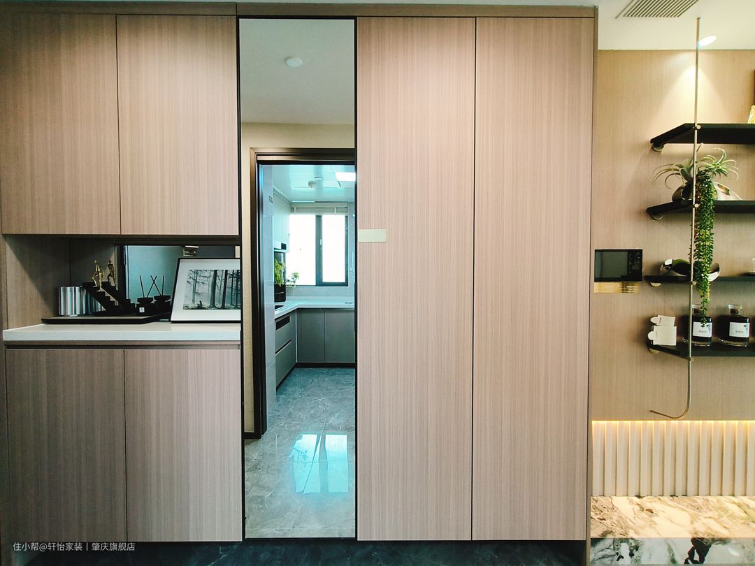 与餐厅取消门窗隔断的厨房,做了半开放式设计,很好的解决了餐厨空间的局限性,且同时满足业主对中厨烹饪的生活需求I型厨房拥有更大的空间,上下橱柜可以嵌入更多智能设备和厨具,使得做饭更加方便。地板和墙面通铺大理石瓷砖,防水性能好的同时还具有较好的耐用性和耐磨性,不容易受到划痕和损坏。 厨房的橱柜分布在左右两侧,能够尽量利用中间地带的操作空间,并在洗、切 、炒的过程中形成了一个三角区域,利用这个橱柜上拐角的转折,给厨房的生活增添很多乐趣。集成灶的使用和精准尺寸后再布局的冰箱,完美诠释了设计师对每一寸空间规格的精确拿捏,让厨房空间使用达到了最优的设计传达。