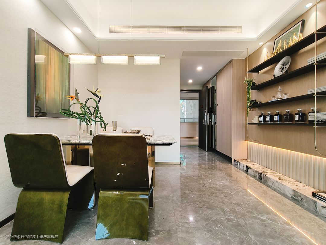 客厅的装修十分简洁,采光十分富足,大面积的铝合封窗,搭配客厅辅灯照明,充分满足了客厅的功能采光。一张长形白色皮质沙发与草绿色单人椅组合成围合布局,不仅能有效促进家庭氛围的融合,还更加方便业主平日里招待客人,为业主打造了一个社交互动性的家庭场所,温馨感十足。 去电视化设计,让客厅看起来更加大气轻盈,一整面花纹岩板背景墙与层板收纳格组合设计,既有天然壁画的空间视觉,还满足了业主的空间展示美化的效果。落地台充当了电视柜,用来摆放零碎物品,旁边开放式的柜子能够增加客厅的收纳空间,随心收纳客厅杂物,大容量储物,陈列收纳两不误。圆桌茶几,实木注入金属感,摒弃传统中西结合,诠释不同东方美, 牢固结实,工艺严谨,造型美观,好家具能用百年。 沙发选择了舒适的皮质沙发,颜色选用了温馨的杏色,人体工程学设计,舒缓脊椎,坐感舒适。单人椅的设计抛开一成不变的凌厉感,让坚硬金属绽放出柔美曲线,不张扬的线条呼应,承托力不减,倚坐更放松更有安全感,105°科学护脊保护腰椎健康。