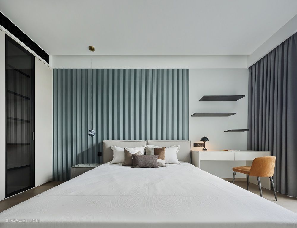 线条利落的格栅设计应用到床头背景墙,蓝色的格栅为次卧增加了许多清爽,原木地板通铺,更加温馨,有利于收货高质量睡眠。