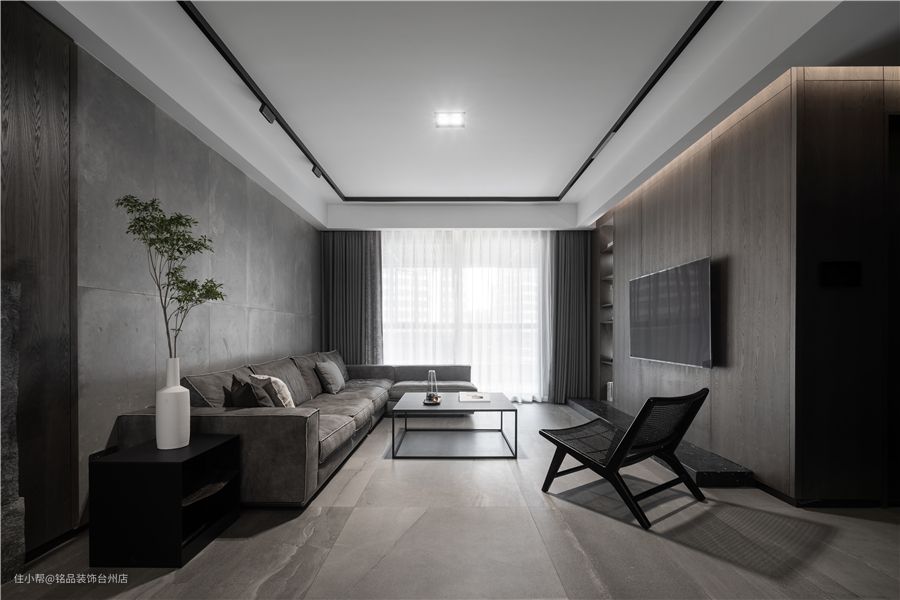 客厅局部吊顶+无主灯谁,四周搭配黑色不锈钢金属片装饰,视觉上让空间显大了不少,也具备了一定层次感和格局。结合业主对家的期待,阳台利用大落地窗布局视野上会通透不少,也方便了室内光线提升。 电视背景墙整体以木饰面设计,细线框装饰增加了层次感,显得更干净利落。靠阳台位置利用小壁龛收纳设计,可以放些小摆件或者书籍,点缀空间,增加一些生活气息。