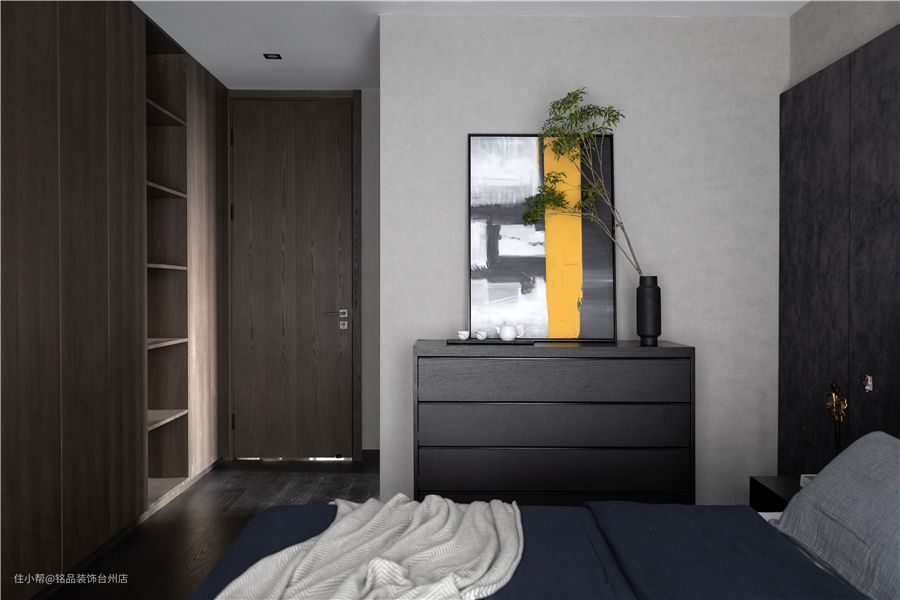卧室主体格调还是延续了公区的风格,因为室内颜色偏暗,所以选用了亮黄色床品做色彩上点缀。同时白色吊顶与黑灰色地板两大反色差,尽显干净,舒适的氛围。 地板上墙装饰与床头背景墙上,姜黄色床头靠背和黑灰色木饰板碰撞,室内多了一些灵动感。上方各有一道精巧的壁灯,确保夜晚的床头位置有充足的光线。