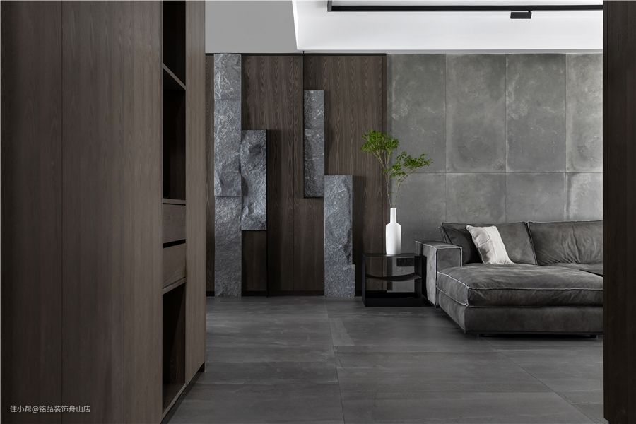 次卧风格与主卧相近,但设计上会简单一些,灰色调背景墙搭配深色地板显得更加沉稳大气。棕绿色皮质床靠背,与室内风格相近十分的静谧安逸,适合长辈居住。