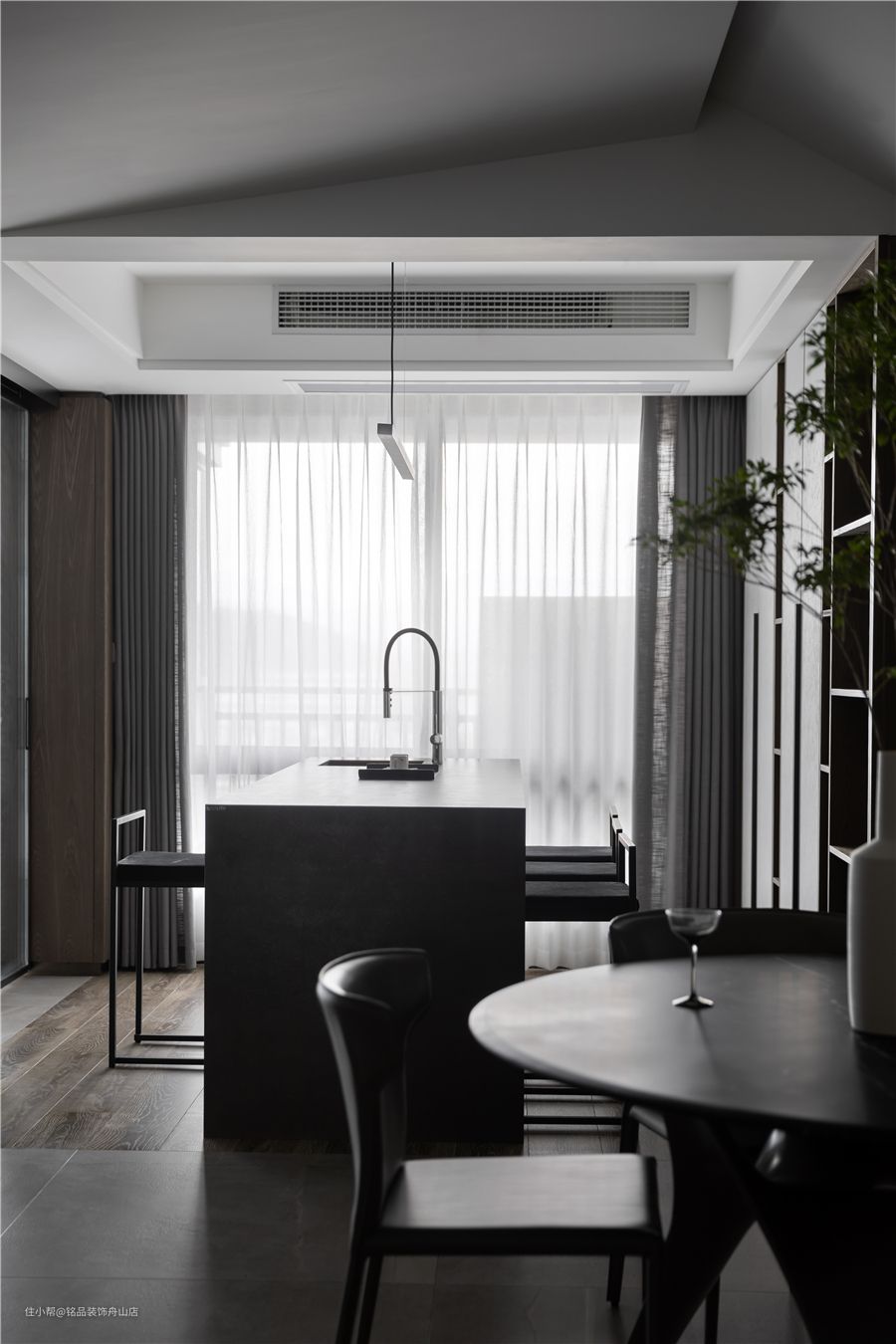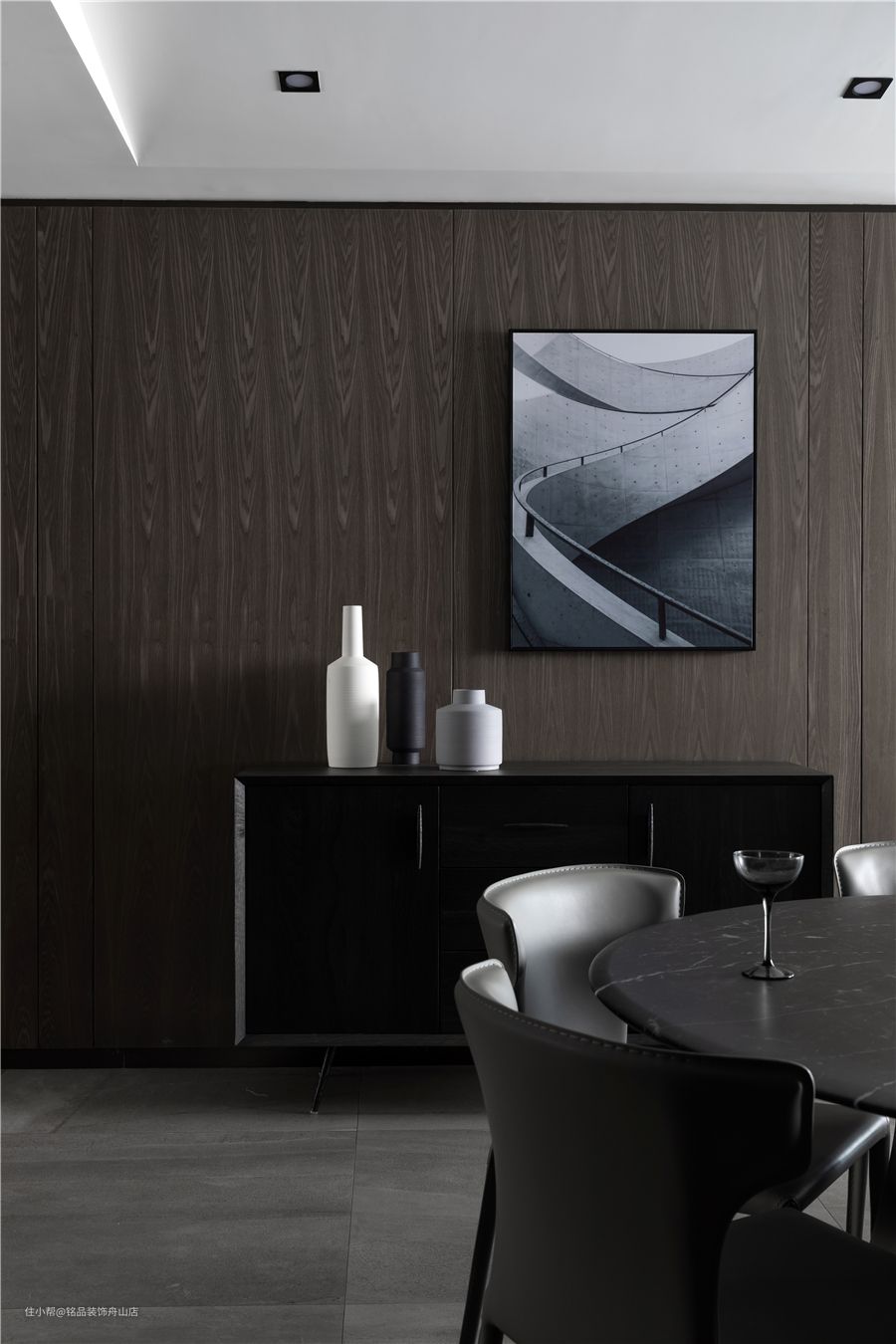 客餐厨其实是一体式开放布局,空间通透,有助于室内空间流动以及家人之间的交流。餐边柜选用了一张小橱柜摆放,搭配灵动曲线的风景画,更具有现代时尚感。