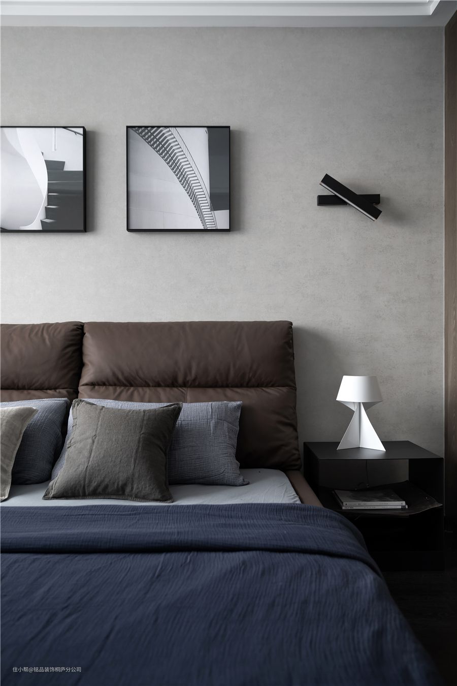 次卧风格与主卧相近,但设计上会简单一些,灰色调背景墙搭配深色地板显得更加沉稳大气。棕绿色皮质床靠背,与室内风格相近十分的静谧安逸,适合长辈居住。